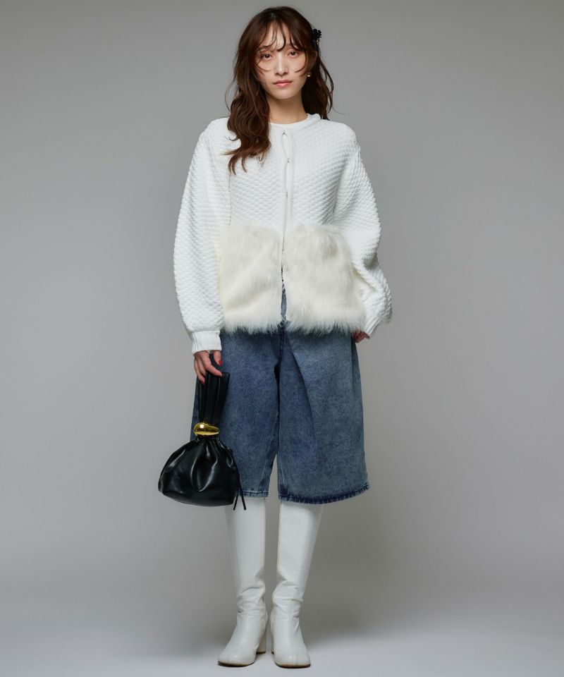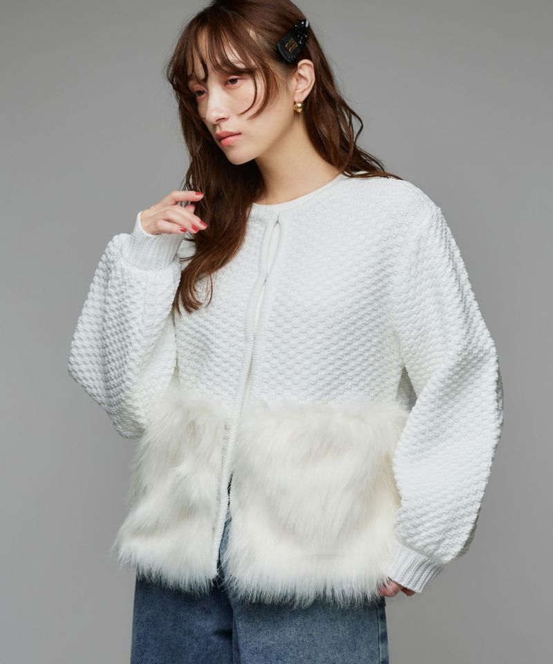 カーディガン部分は、程よくハリのあるしっかりとしたニット素材。フェイクファーは毛足が長く、さらりとした光沢が上品な印象を与えます。全体をポリエステル素材で仕立て、軽やかな着心地と滑らかな肌触りを両立。着るたびに心地良さを感じられる一枚です。