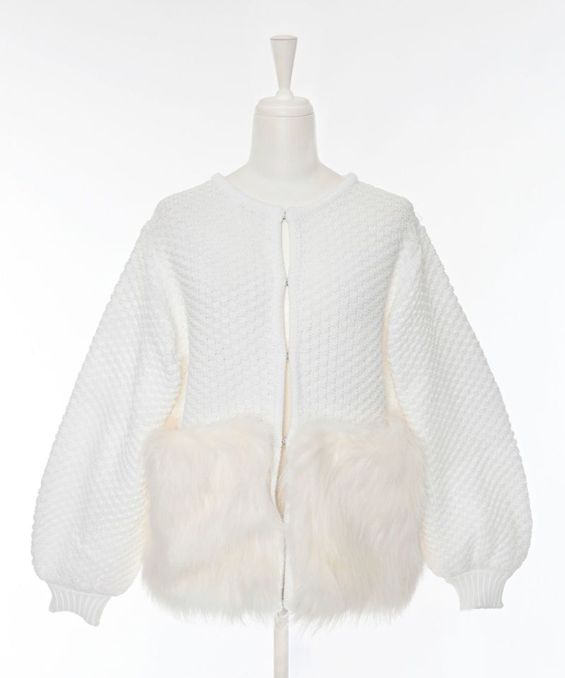 肉厚なニットで仕立てたカーディガンに、フェイクファーをドッキングした華やかな一枚。袖の裾にかけてふんわりと広がるシルエットが、女性らしいやわらかさを演出し、ノーカラーのデザインが顔まわりをすっきりと見せます。フェイクファーはスナップボタンで取り外し可能で、ご自宅で手洗いが出来るためお手入れしやすいのも魅力。留め具にはホックを採用し、フロントラインをすっきりと仕上げました。羽織るだけでスタイリングを華やかに引き立ててくれる、存在感のあるアイテムです。
