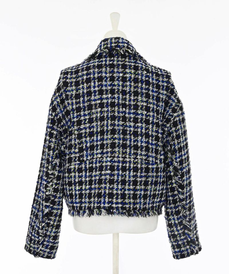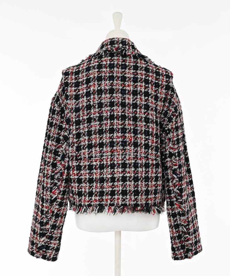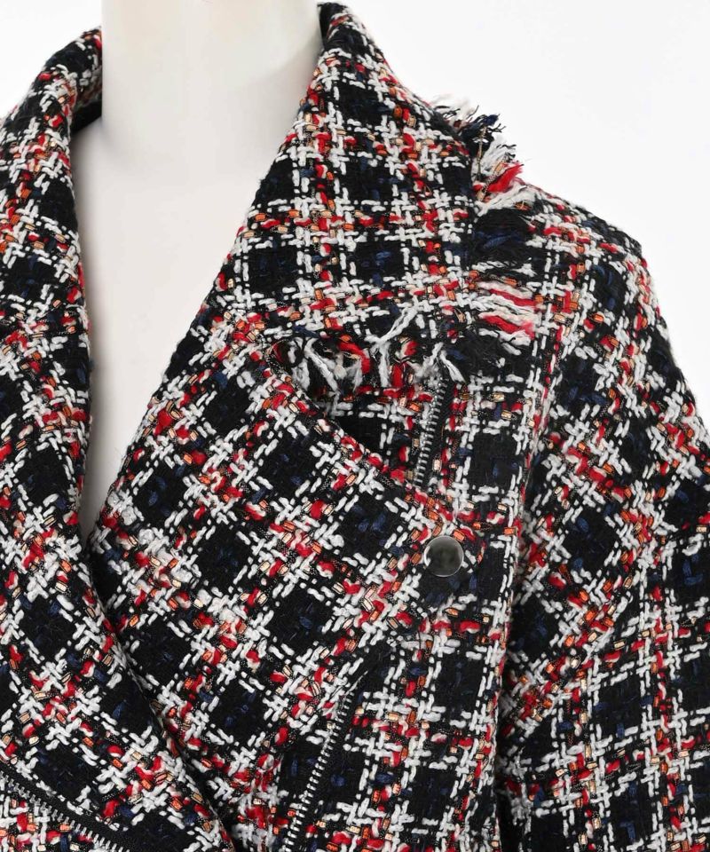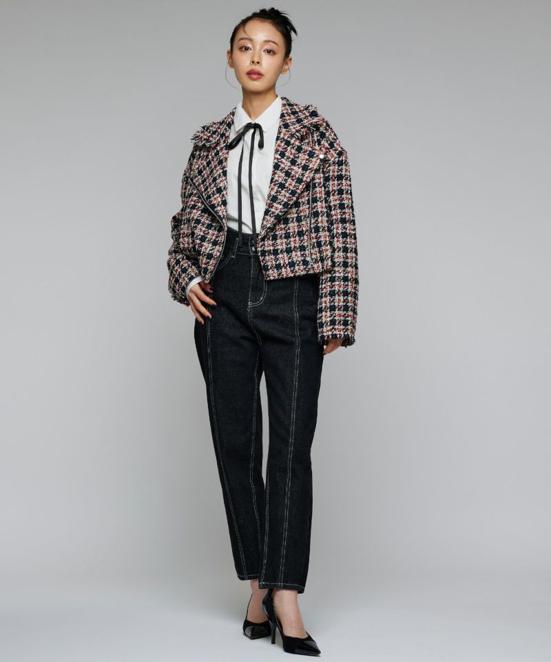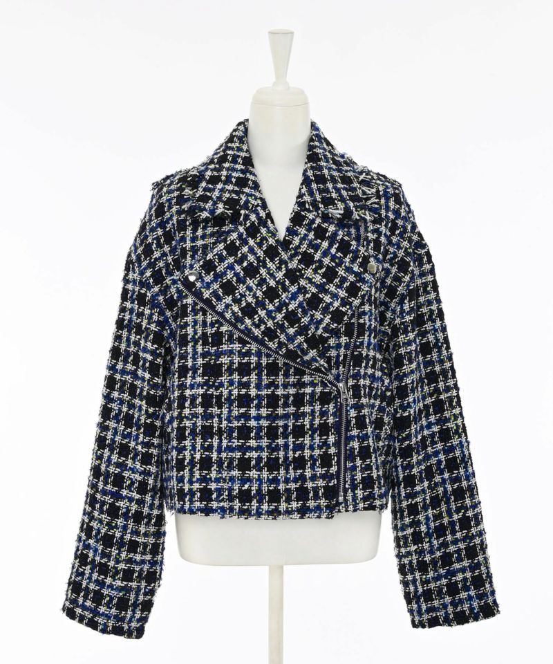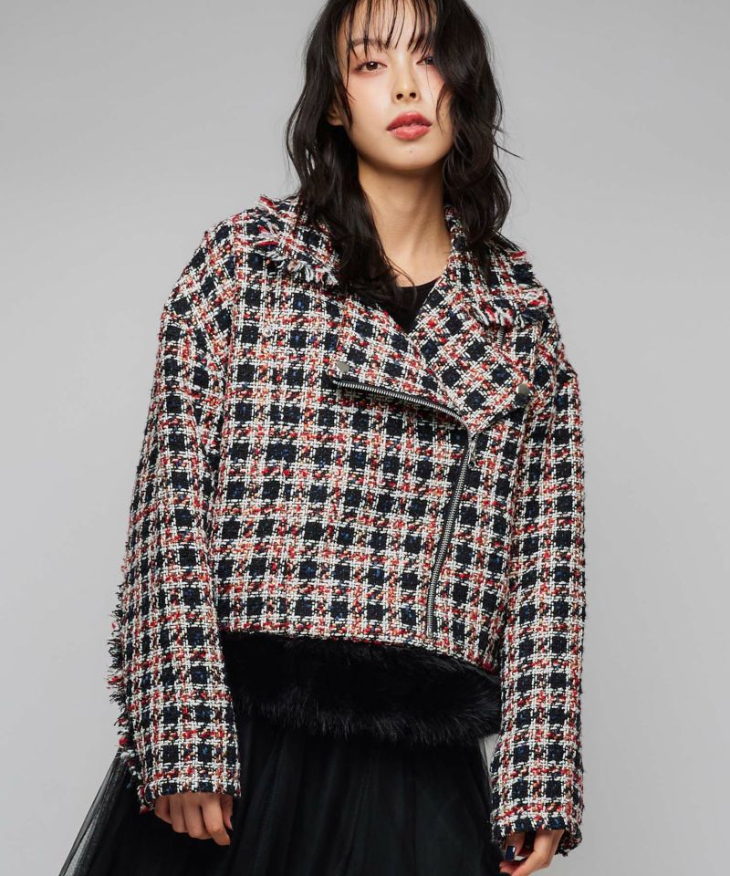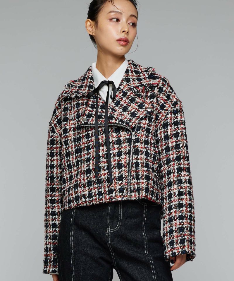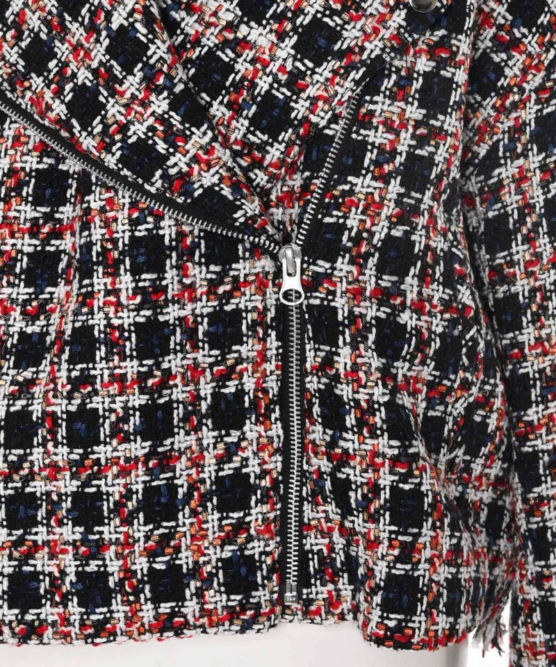 キラキラとした糸を織り込んだ、シーズンムード漂うツイードライダースジャケット。ライダースのエッジを残しつつ、ツイード素材で女性らしさを引き立てる一着です。
