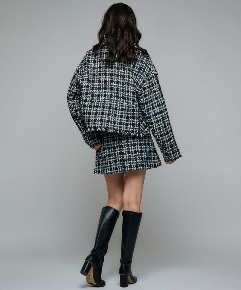 コンパクトな丈感を活かして、ハイウエストのワイドパンツやマーメイドスカートなどと合わせると、バランスの取れたスタイルに。ツイードの存在感を引き立てるよう、インナーはシンプルにまとめると◎同素材のツイードスカート(PIC907120)と合わせてセットアップでの着用もおすすめです。