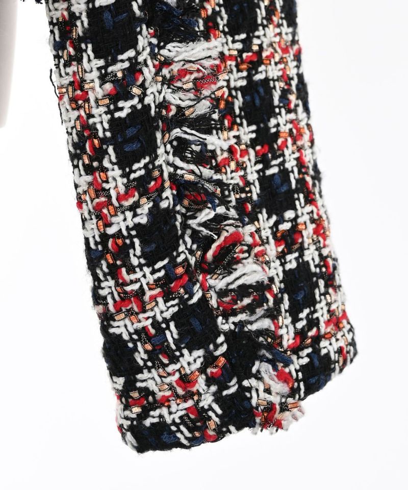 素材の異なるカラー糸を巧みに織り交ぜた華やかで柔らかさのあるツイード生地。裏地があることで、心地よい着用感を叶えてくれます。見た目以上に軽量で肌寒い季節にピッタリなライトアウター。上品な質感が、洗練されたモードスタイルを引き立てます。