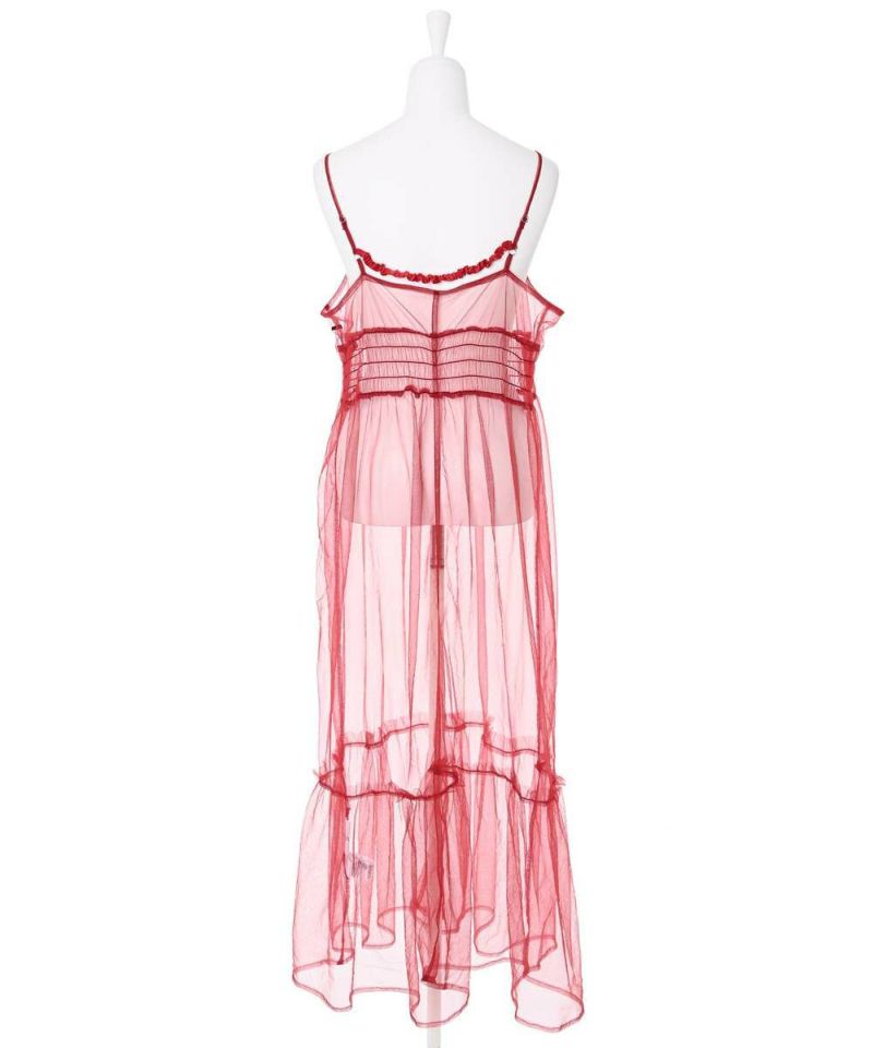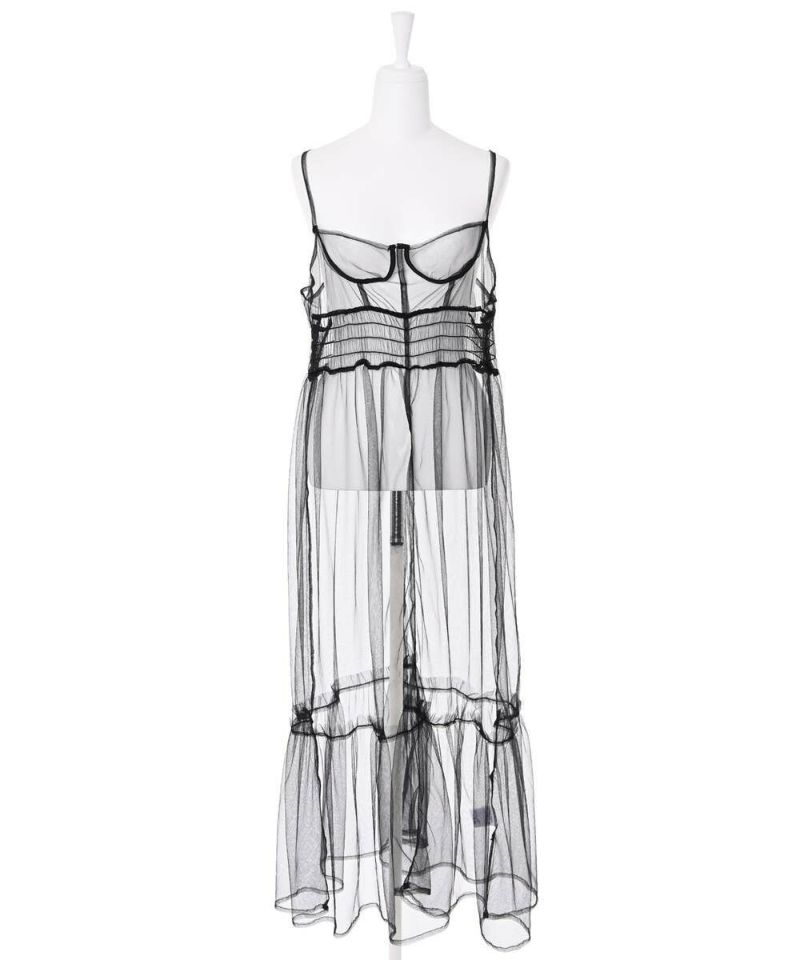 ビスチェ風ディティールと裾に施されたギャザーがドレッシーさ溢れるチュールドレス。普段のコーディネートにプラスするだけで特別感のあるスタイリングに。肩紐で長さ調整が可能。【model】H160 B80 H85/H165 B78 H83