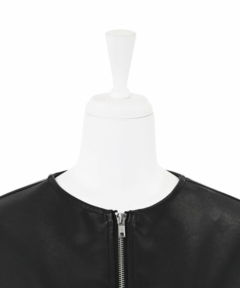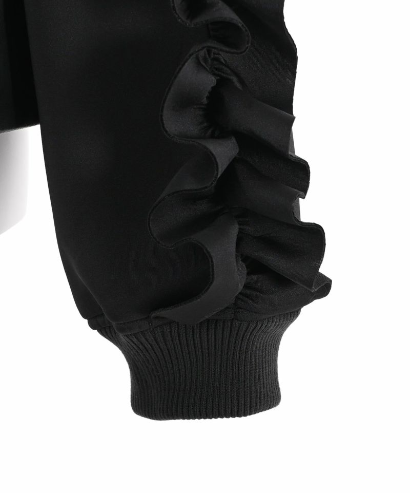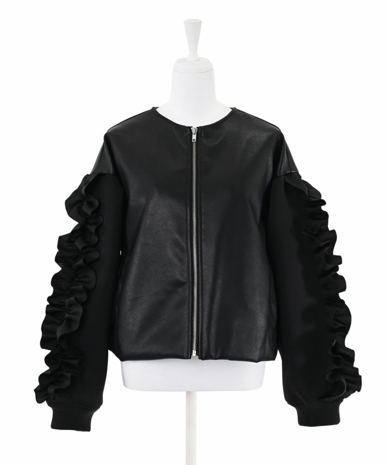 フリルデザインとレザーのコントラストがポイントのショートブルゾン。袖はボンディング素材でフリルのボリュームに対し、ライトな着心地。ノーカラーデザインでワードローブに取り入れやすい一枚。モデル身長:156cm