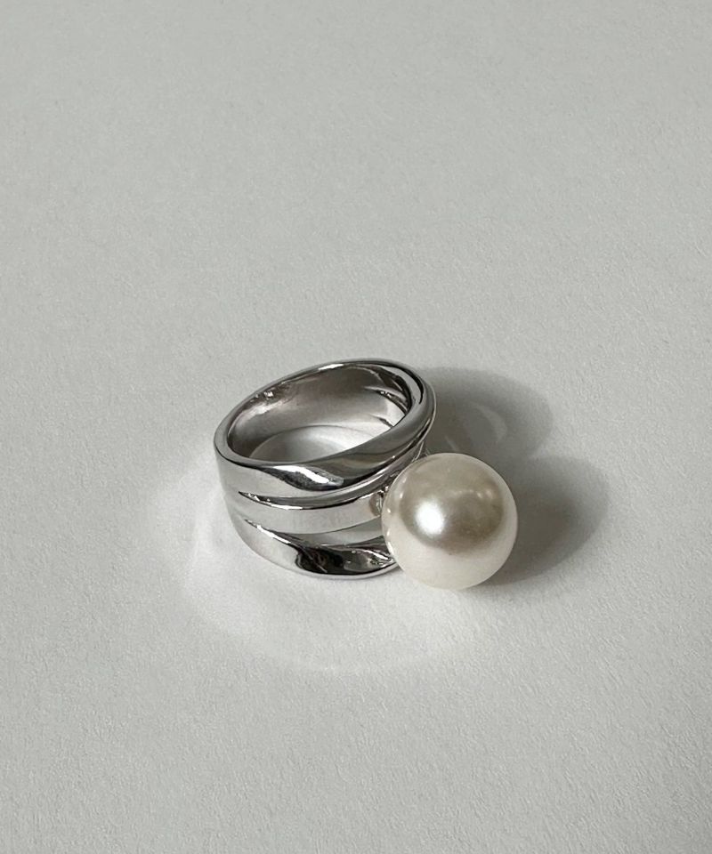リング部分のゆるやかなラインと抜けのあるデザインが、太めのリング幅をすっきりとした印象に仕上げてくれるので、重たくみえないのが嬉しいポイント。立体的なフォルムがパールとシルバーの落ち着いた雰囲気を引き立て、シンプルながらもほかのアクセサリーとは違った雰囲気を添えてくれます。