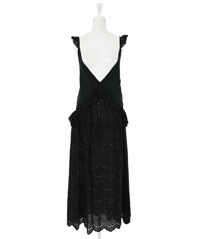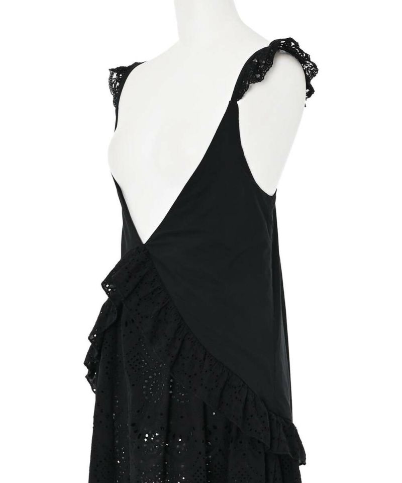 ナチュラルな風合いが魅力のコットンレース素材を使用したロングワンピース。裾には繊細な花柄刺繍とカットワークレースが施され、可憐で上品なアクセントに。バックリボンで着丈の調節可能。レイヤードスタイルにオススメの一枚。【モデル】:H163 B78 H84 / H165 B78 H83