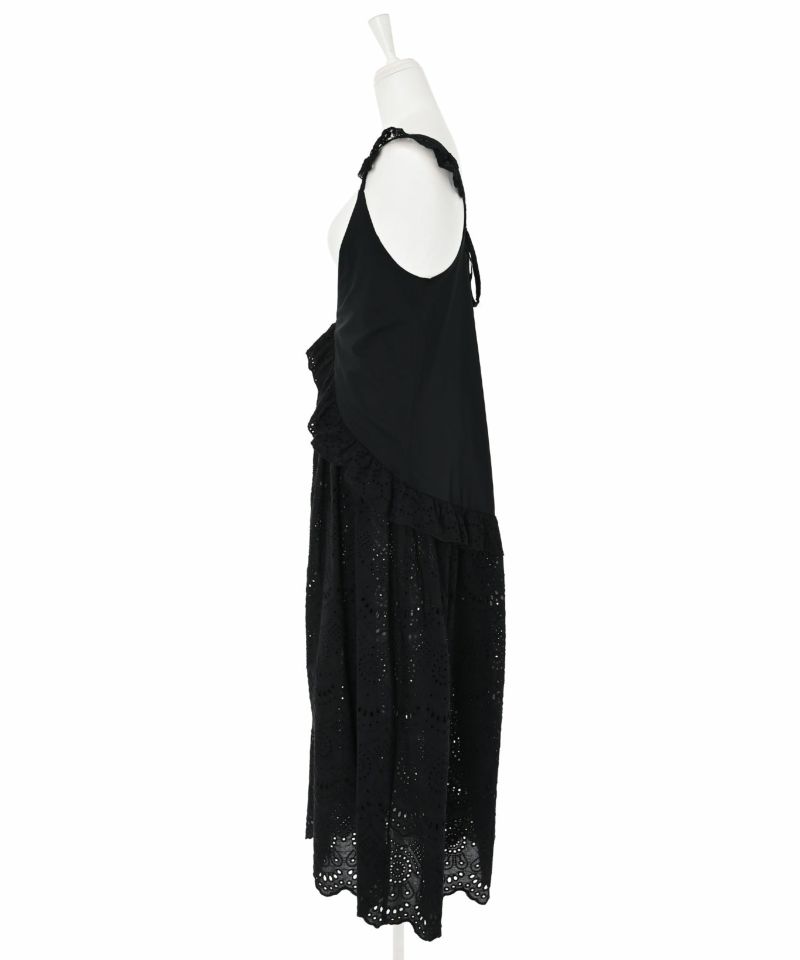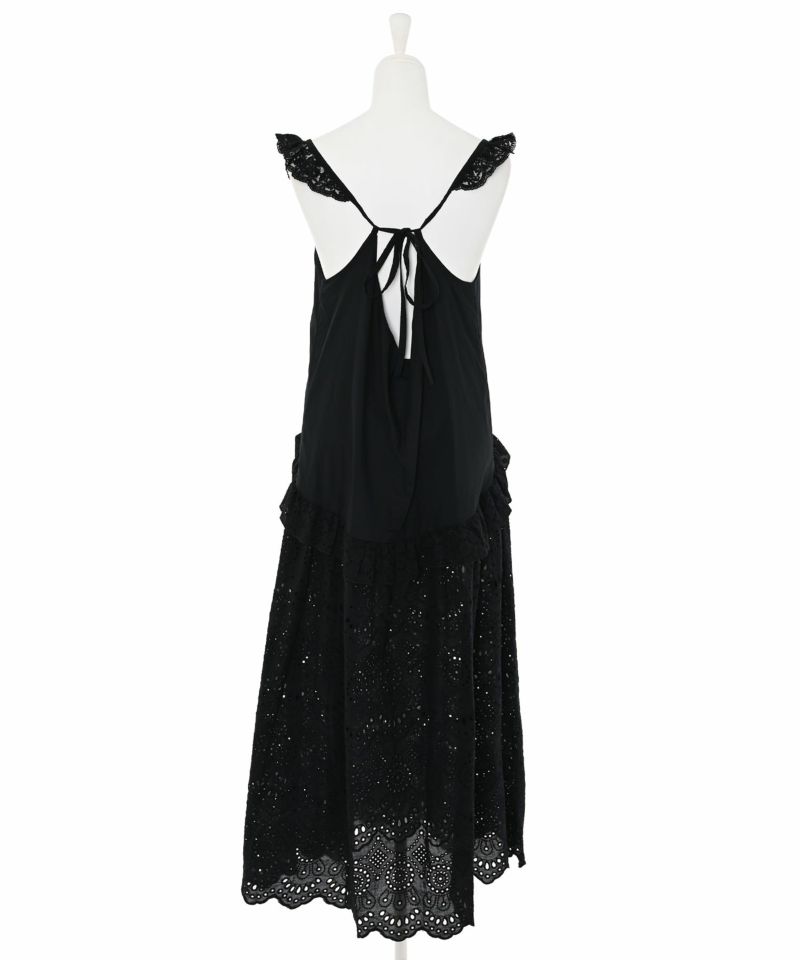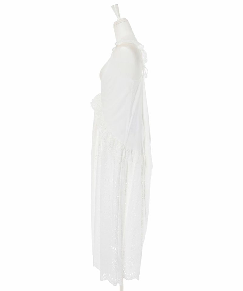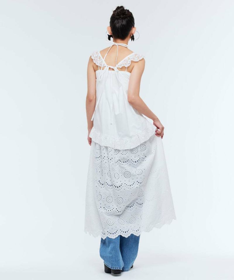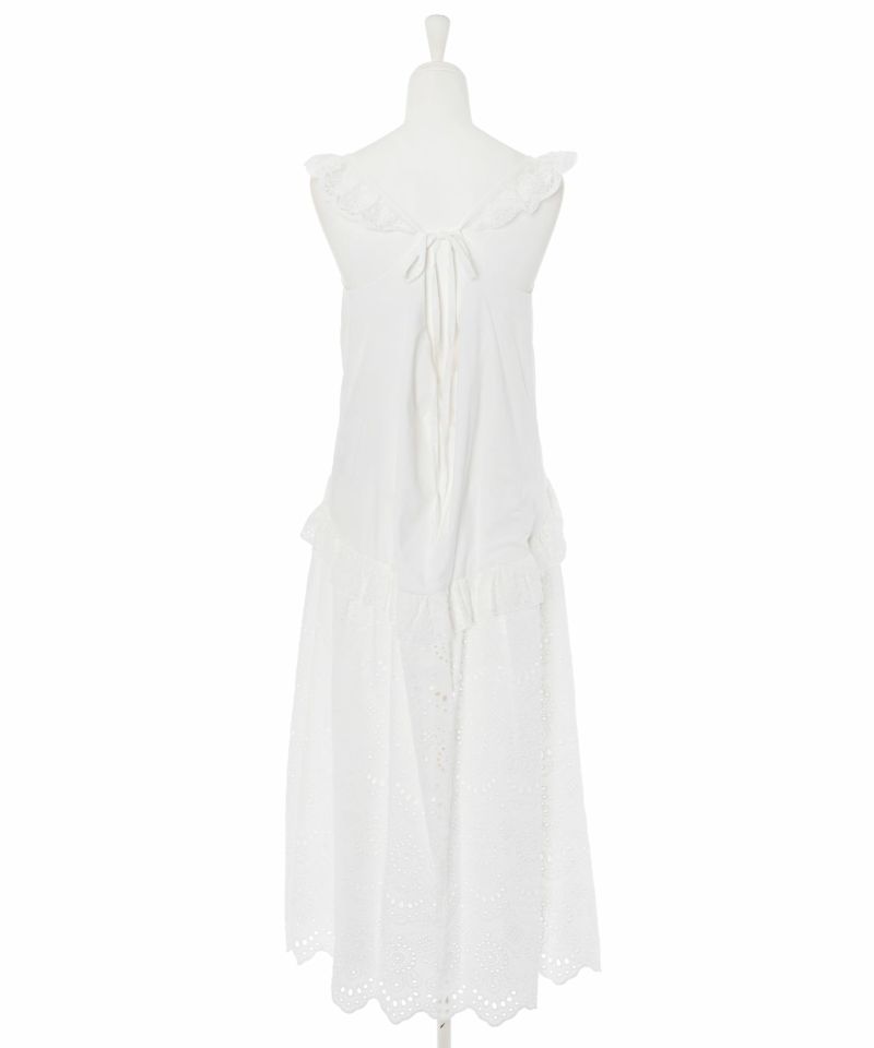 ナチュラルな風合いが魅力のコットンレース素材を使用したロングワンピース。裾には繊細な花柄刺繍とカットワークレースが施され、可憐で上品なアクセントに。バックリボンで着丈の調節可能。レイヤードスタイルにオススメの一枚。【モデル】:H163 B78 H84 / H165 B78 H83