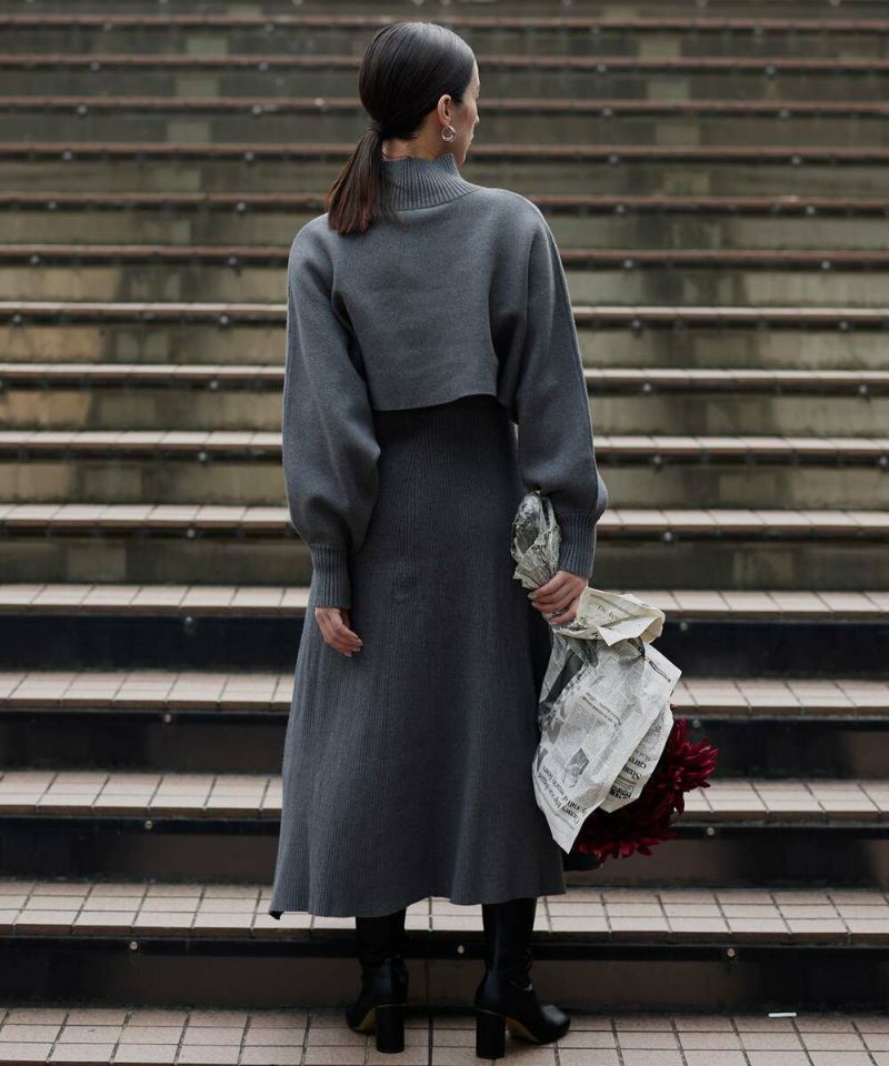高級感のあるモチっとした肌触りのニットトップスとワンピースがセットになった上品なニットワンピース。シンプルなルックスながら、体のラインを拾わない華奢見せデザイン。シーンに合わせて単品使いができる優秀アイテムです。セットタイプのワンピースはノースリーブワンピースが多いところ、秋冬に1枚でもコーディネートが完成するよう、ロングスリーブ仕様に。厚手過ぎないのでアウターの中でゴワつきにくく、幅広いシーズンで活躍。【model】H160 B80 H85