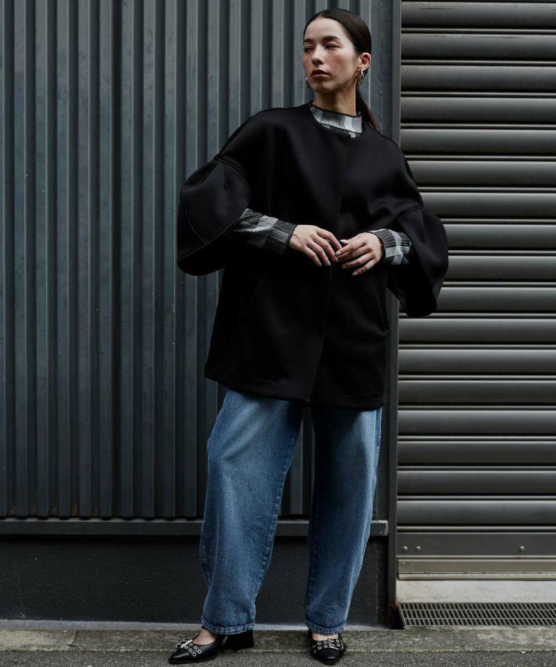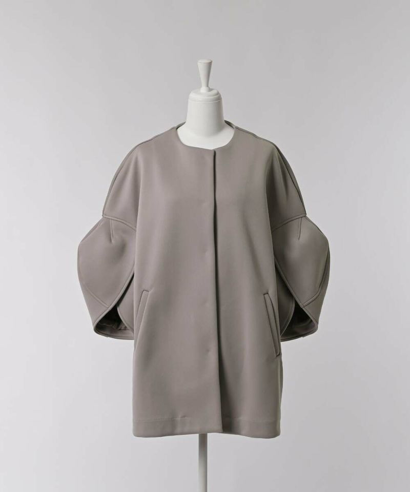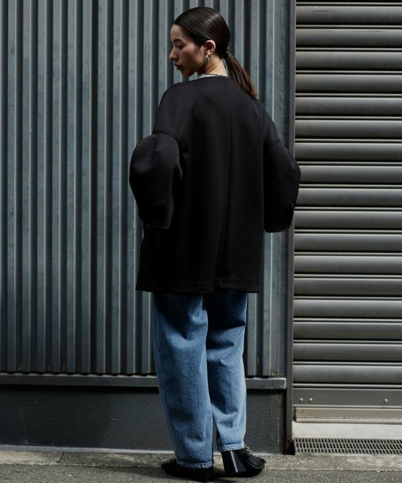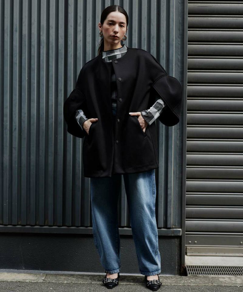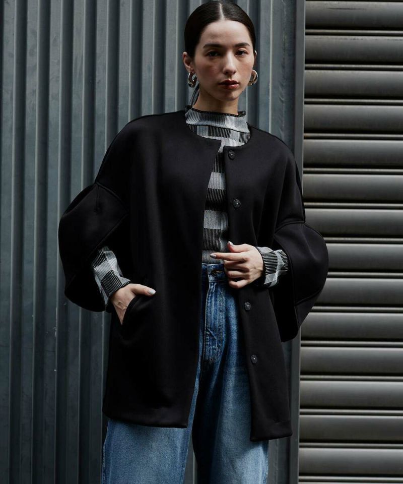 ノーカラーデザインとハリ感のあるボンディング素材が、綺麗めな印象のライトコート。ボリュームのあるお袖に、身頃はスッキリとしたデザインを採用することで、メリハリのあるシルエットに仕上げました。インナーを選ばずに羽織れる、ゆとりのあるサイジングもポイント。レイヤードスタイルを楽しめる七分袖を採用し、軽量で持ち運びしやすいので、気温差のある時期にも活躍するアウターとなっております。両サイドには、深めのポケット付きで機能性も抜群◎デイリー使いにはもちろん、フォーマルシーンにもピッタリで重宝するアイテムです。モデル身長:157cm/H160 B80 H85