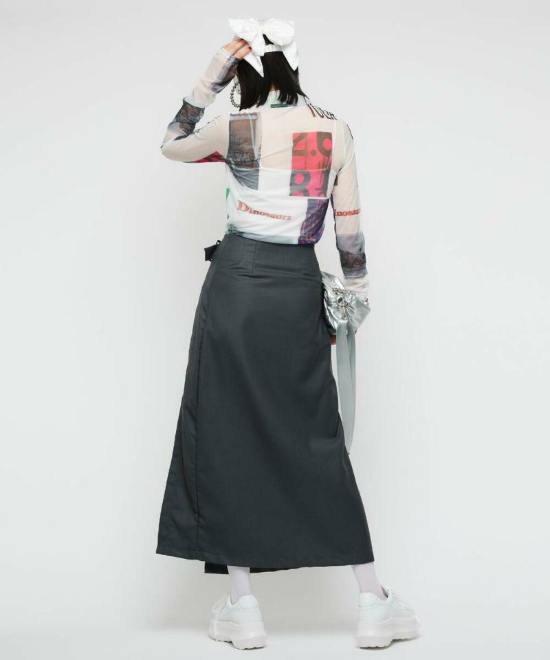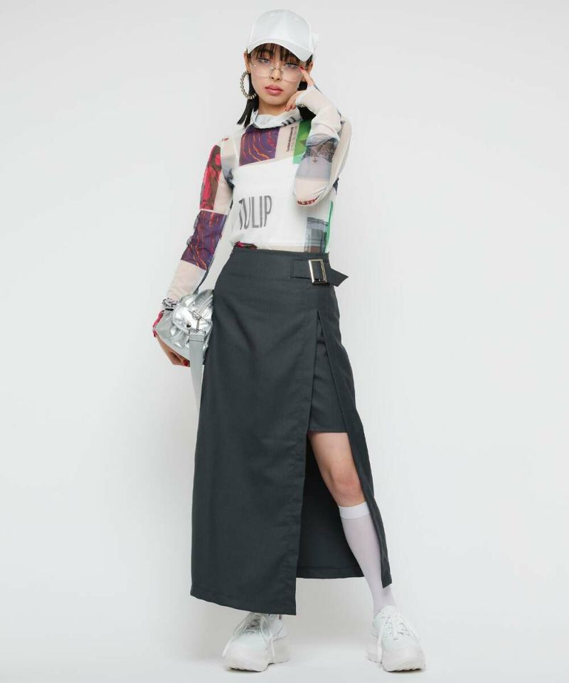 ミニスカートとロングスカートをレイヤード風に仕上げたスリットロングスカート。 大胆なスリットが入っていることで、足さばきしやすくハイウエスト仕様でスタイルアップ効果も期待。 足出すのが苦手な方にも挑戦しやすいデザイン。 サイドジップで着脱可能で、ウエストベルトがワンポイントに。 【model】:H165 B78 H83 / H163 B78 H84