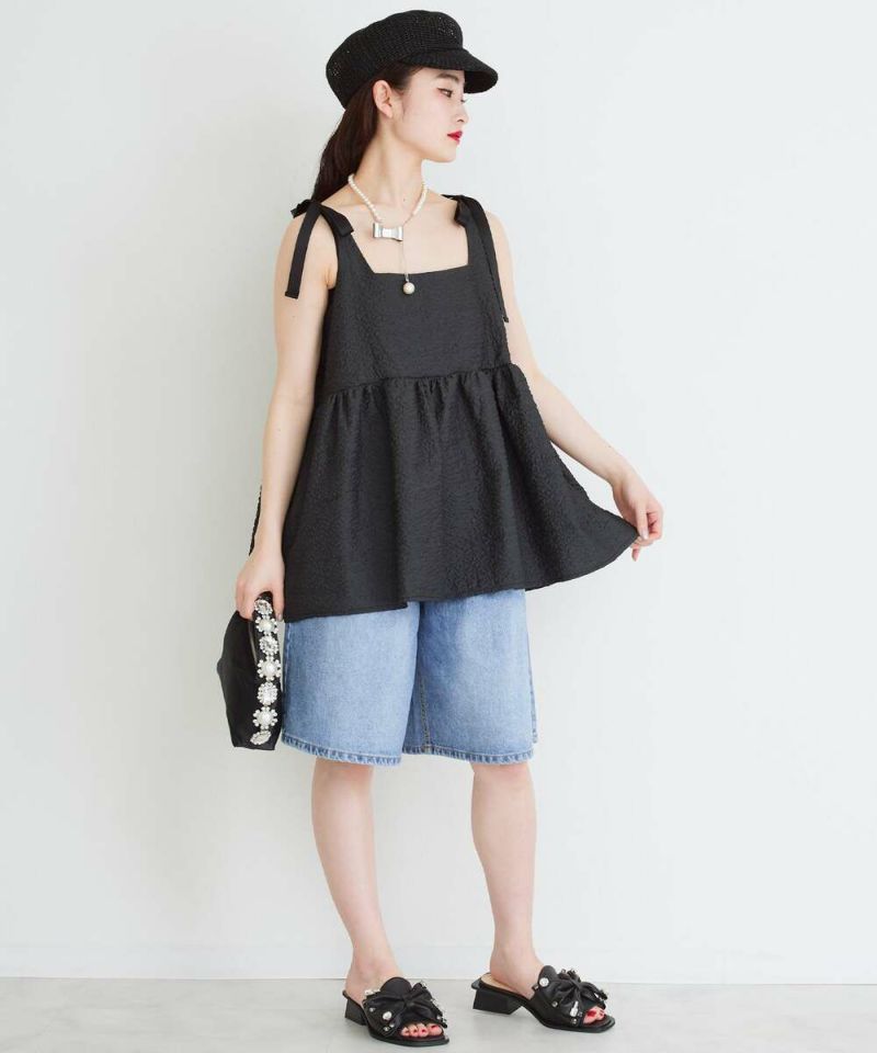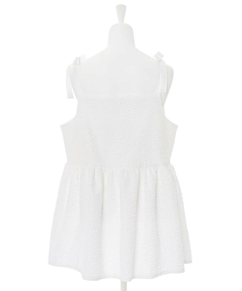 ジャガード素材を使用した、1枚でこなれコーデを叶える大人フェミニンなペプラムビスチェ。ショルダー部分のリボンが可愛らしさをプラスし、長さ調節可能。ウエストから裾にかけて広がるペプラムデザインがメリハリのある綺麗なシルエットに。【model】H165 B78 H83/156cm