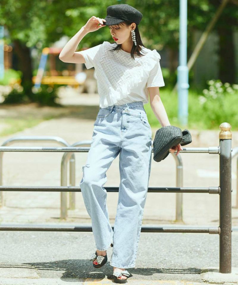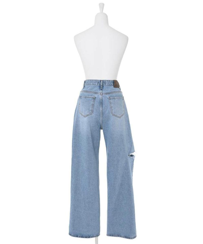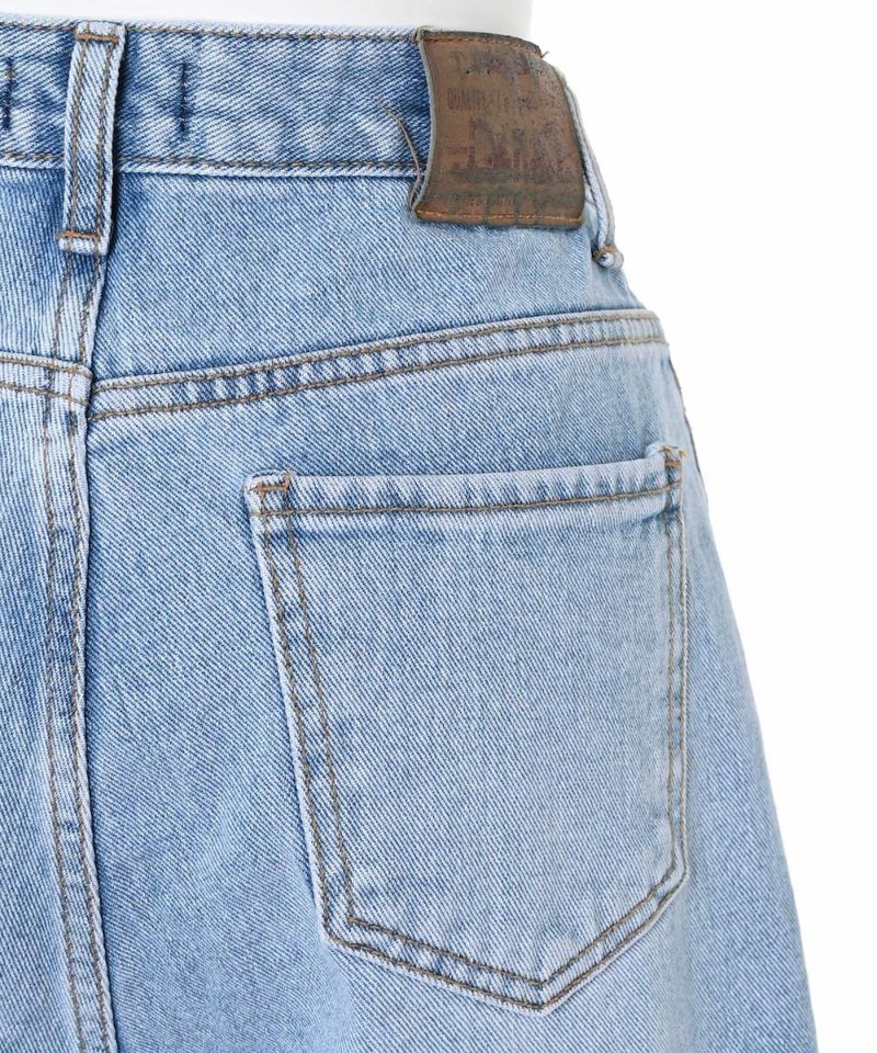 ウエスト部分がアシンメトリーでクロスデザインになったハイウエストデニム。浅めのカットデザインが、さりげない肌見せとなり安心して着用可能。裾にかけて程よくゆとりのあるサイズ感が魅力。※デニムのお色味は、ワンウォッシュデニムとなるため、バックタグにヴィンテージ感がございます。ご了承ください。【model】H156H165 B78 H83