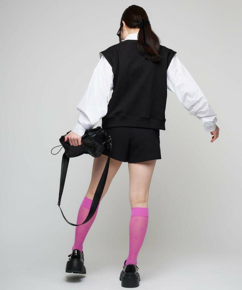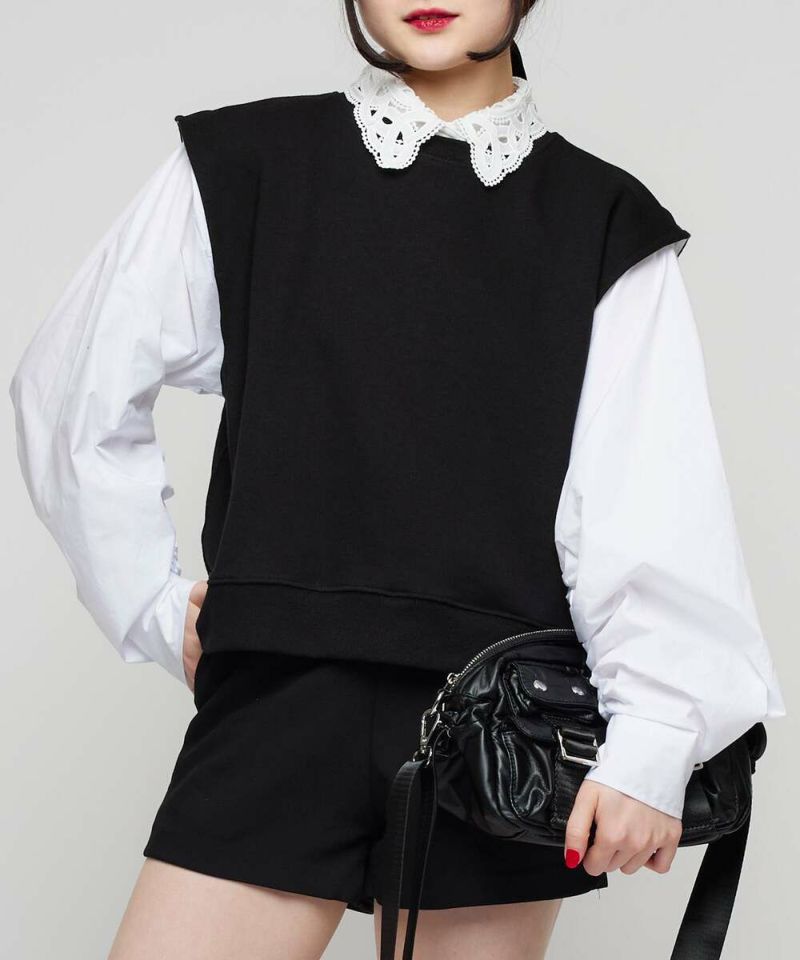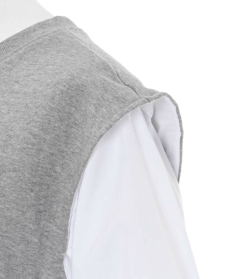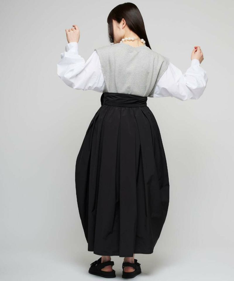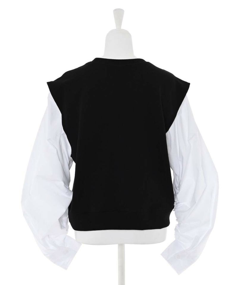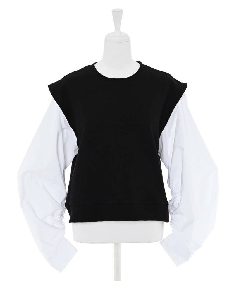 シャーリング加工をあしらったボリュームスリーブとベストがドッキングされたトップス。ベストの肩幅が広めに作られていることで、シャープな印象に。イン・アウトどちらのスタイルでもバランスよく着こなせる丈感。モデル身長:156cm
