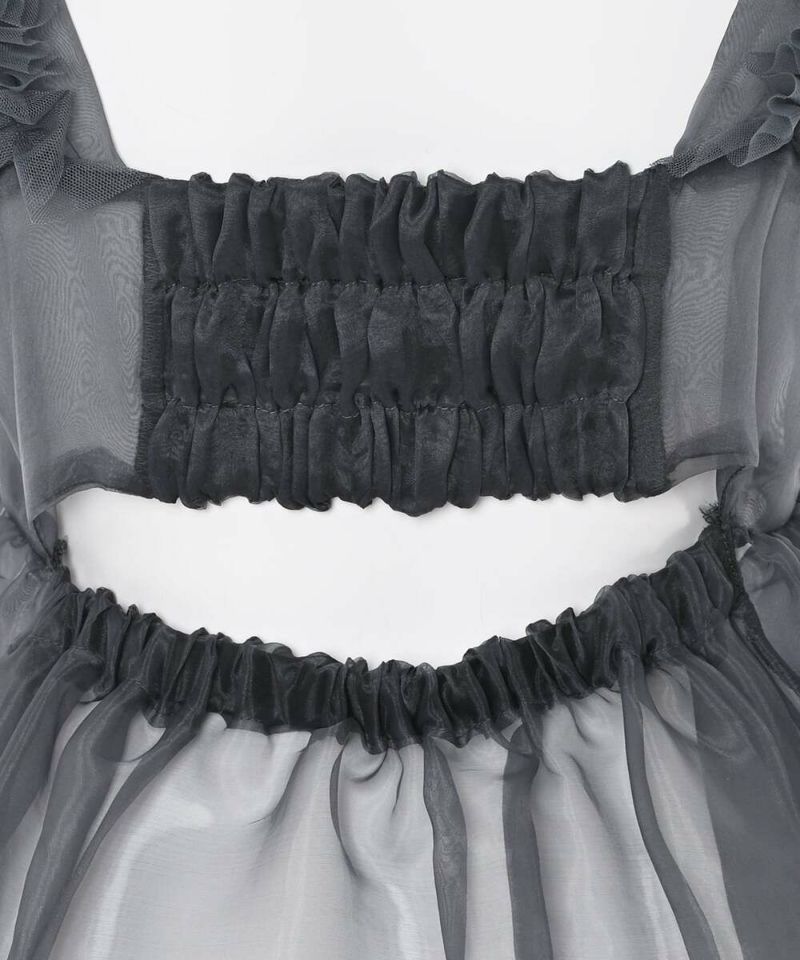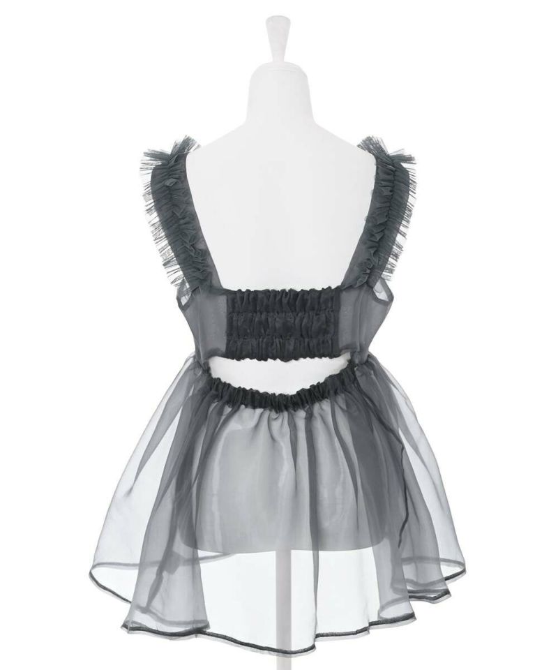 チュールとオーガンジーを採用した、ランジェリーディティールが女性らしいビスチェ。 薄手で軽い着心地に仕上げました。 ショルダー部分の細かいチュールに拘り、全体的に透け感があることでシーズンムードをアップしてくれるアイテム。 バックにシャーリングを使用しておりますが、身幅はタイトなシルエットになっているので レイヤードアイテム薄手の素材をオススメしてます。【model】H165 B78 H83/156cm