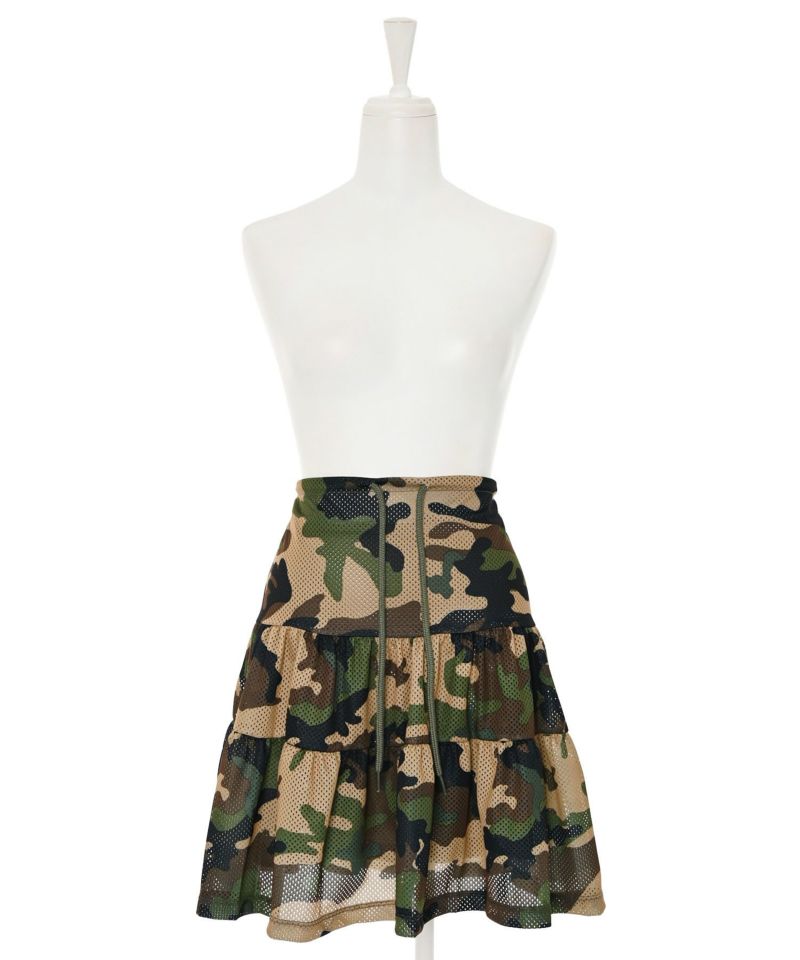 メッシュ素材とカモフラデザインがスポーティーライクなスカート。丈感が膝上までの長さになるので、短すぎるのが苦手な人も安心して着用いただけます◎甘めのトップスを持っていくことで、甘辛MIXで着ていただくのもおすすめ。