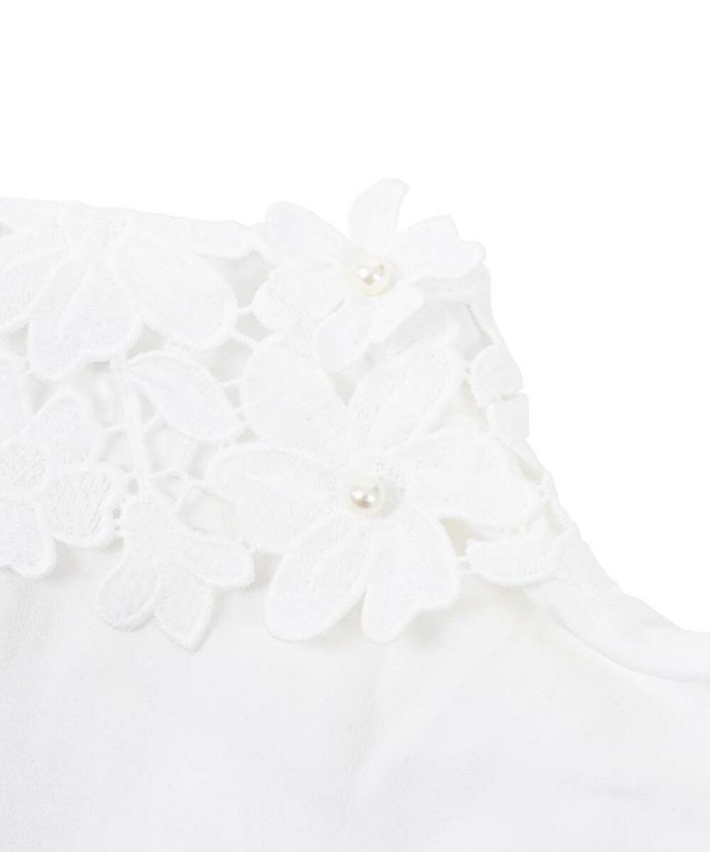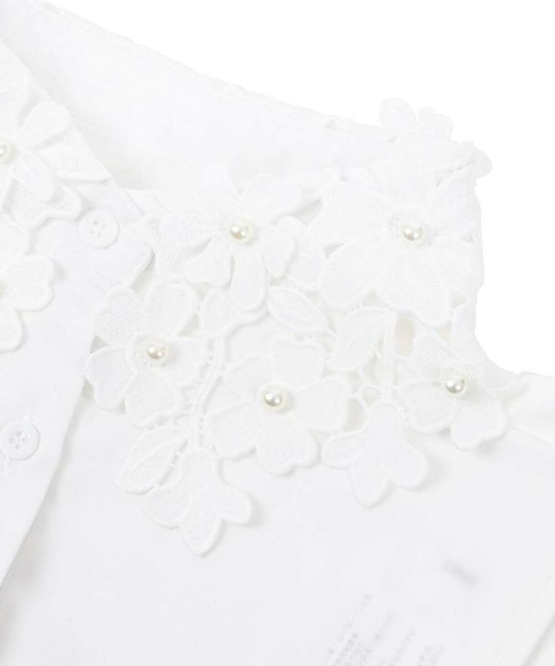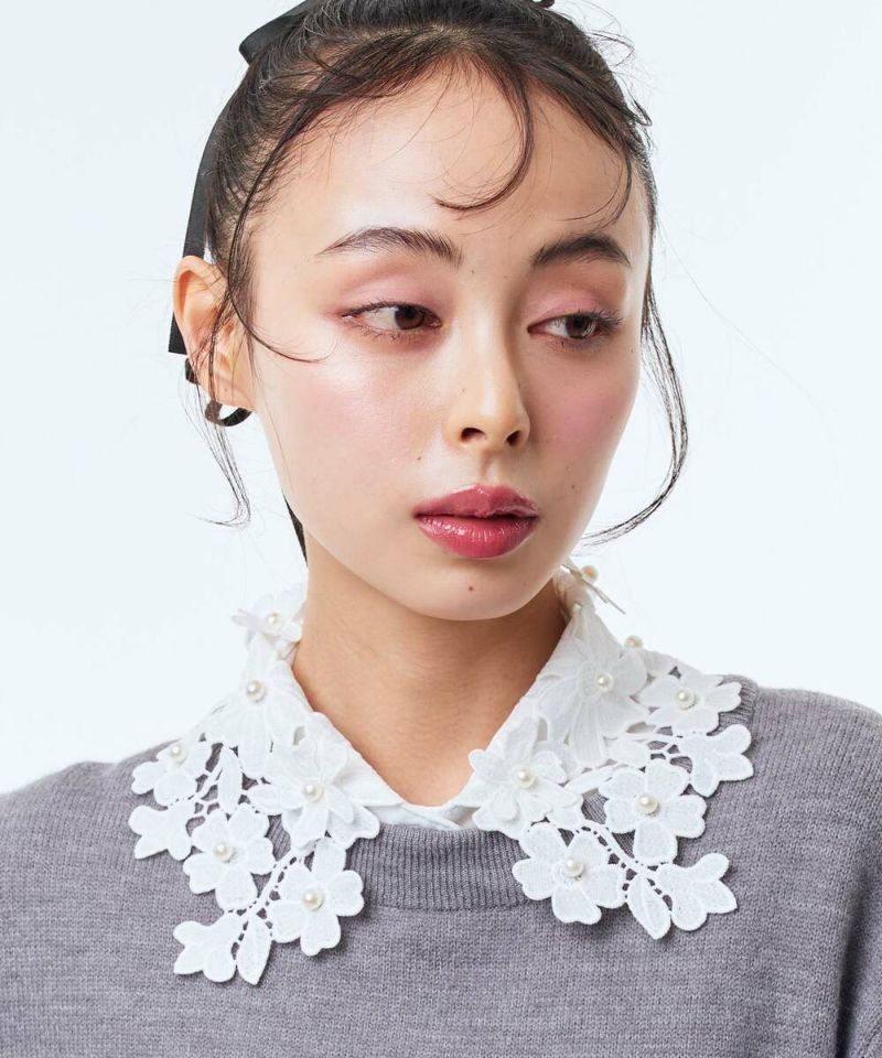 フラワーモチーフの襟にパールを散りばめた上品で可愛らしい印象のつけ襟。オケージョンシーンでも使用でき、普段のスタイリングを華やかにしてくれるアイテム。