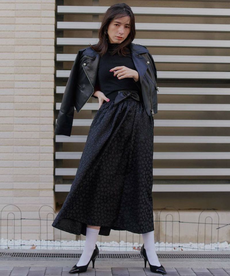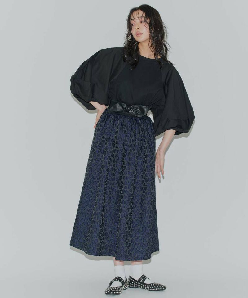ハリ感のあるジャガード素材を使用したハート柄のフレアスカート。全体にあしらったハートを刺繍デザインにすることで、その角度から見ても立体感と存在感のある仕上がりに。ハート柄で甘くなりすぎないよう落ち着いたトーンの色味を採用。ストレスフリーなウエストゴムで丈感の調整ができ、身長関係なく着用可能。ニットやスウェット、Tシャツなど綺麗めからカジュアルまで幅広いスタイリングで、オールシーズン活躍するアイテム。