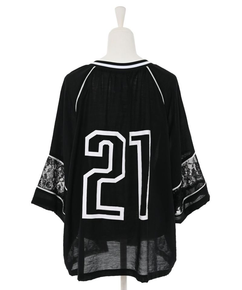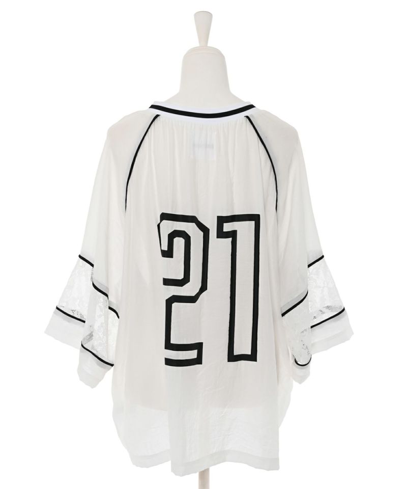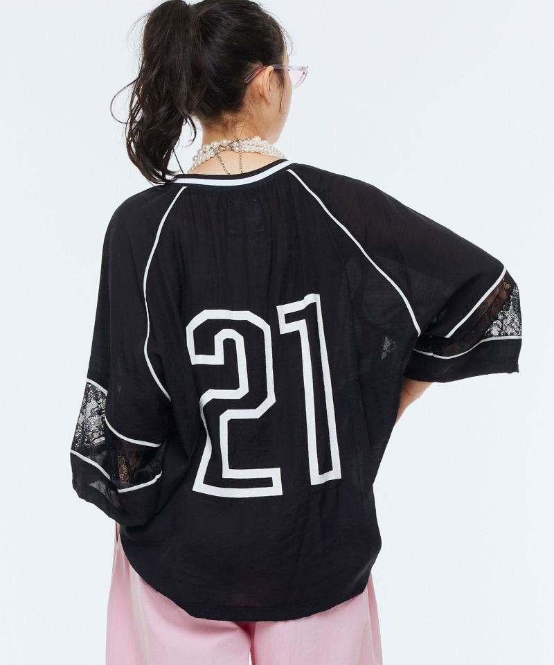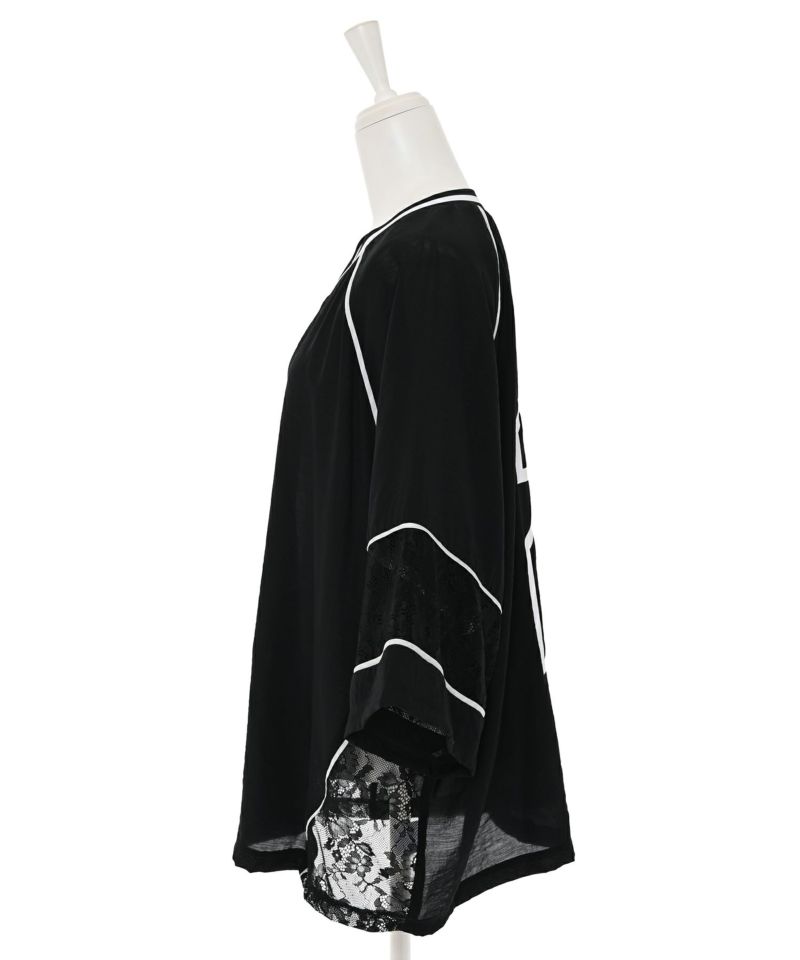 ユニフォームデザインが目を惹くスポーティーなTシャツ。レース素材を部分的に取り入れることで、女性らしさもプラスされたデザインに。これからの季節にピッタリな薄手で風通しの良い素材感。【model】H165 B78 H83 / H163 B78 H84