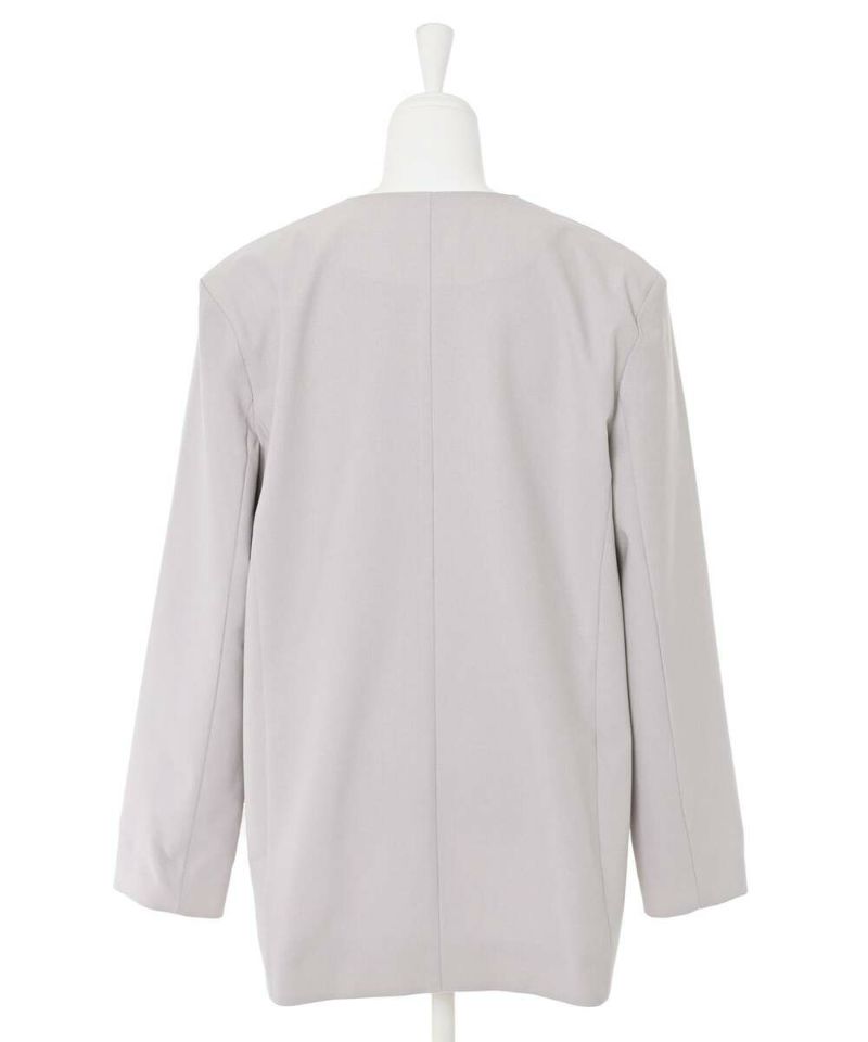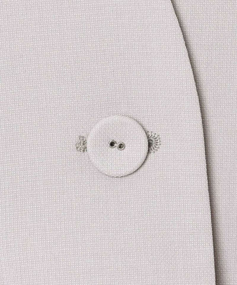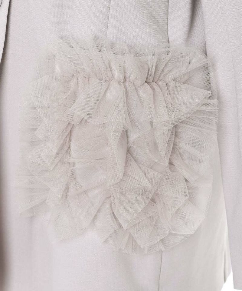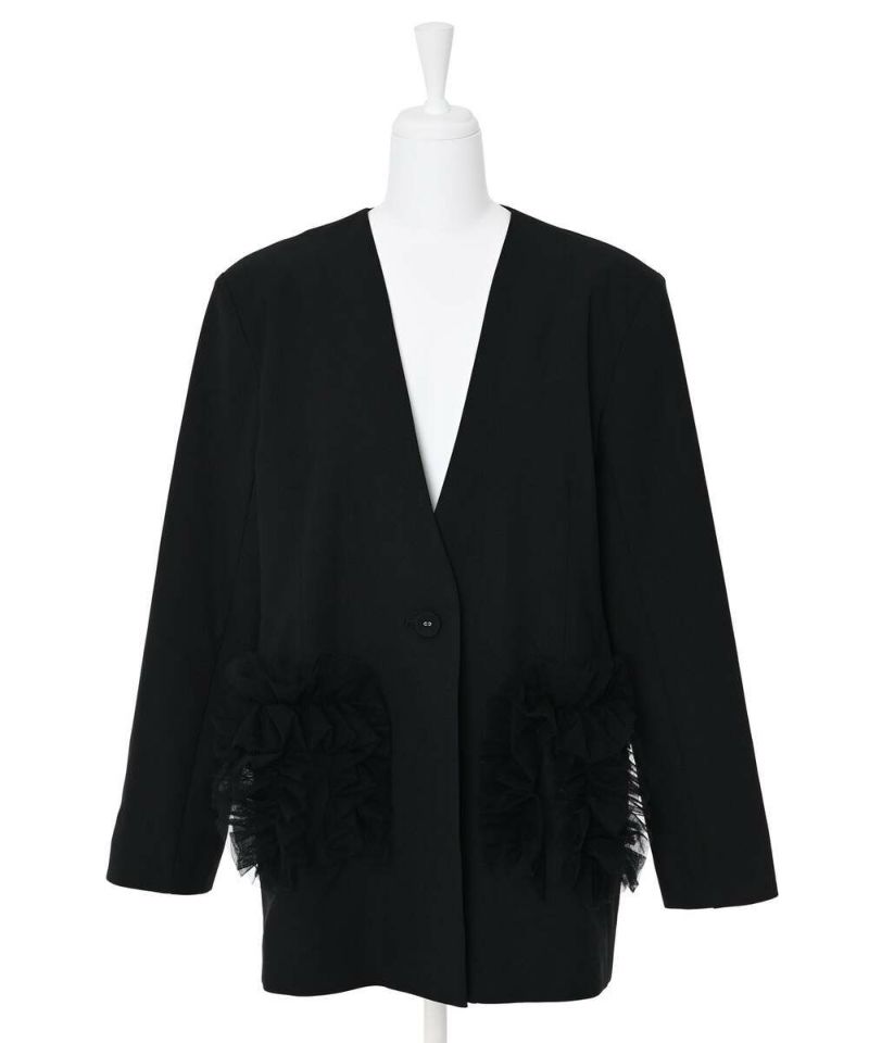 スタイリッシュなスタイリングが叶うノーカラージャケット。フォーマル、オケージョンシーンにも活躍する綺麗めなシルエットに、ポケットのチュールフリルがフェミニンな印象をプラス。ボウタイブラウス等と合わせるのがオススメ。肩パッド入りで型崩れしにくく、初夏まで着用できるサラッとした薄手の素材感。モデル身長:156cm