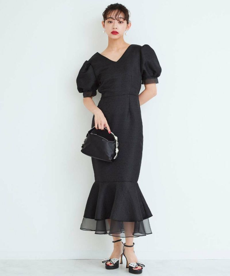 袖口と裾にシアー素材をドッキングしたレディライクなマーメイドワンピース。 高級感溢れるしっかりとした素材に、ウエストマークのリボンと袖パフがフェミニンさをプラスしスタイルアップにも。 前後どちらもVネック仕様で抜け感を。 バックに付いてるジップでの着脱可能。 オケージョンドレスとしても他と差が付くデザインなのでオススメ。【model】:H165 B78 H83 / H163 B78 H84