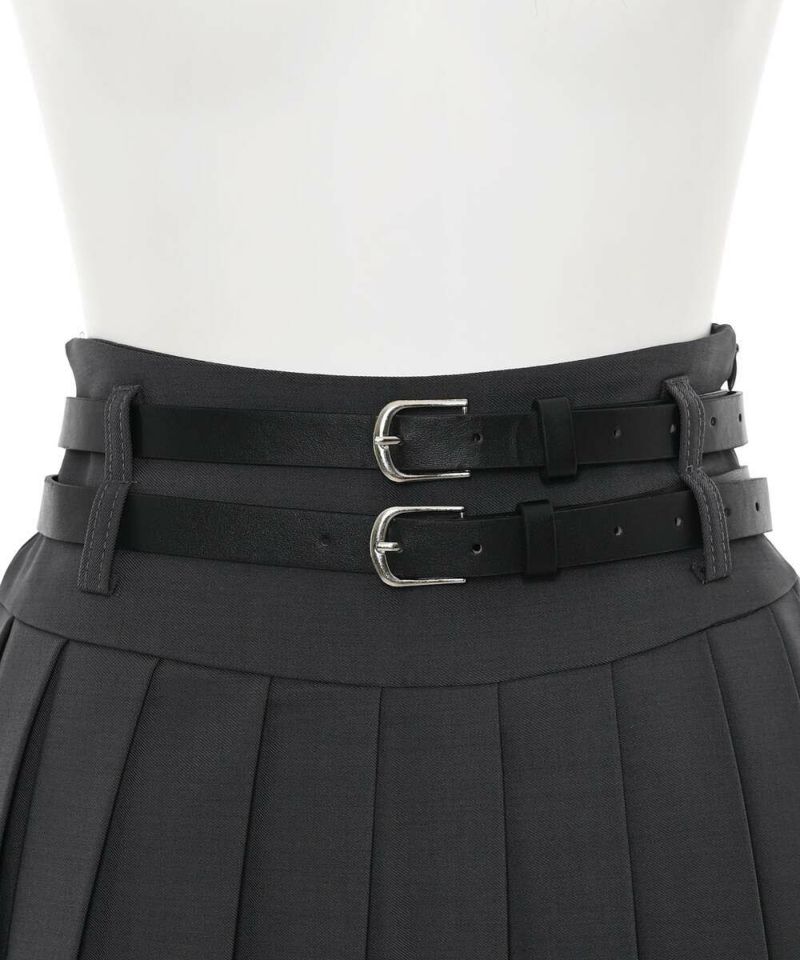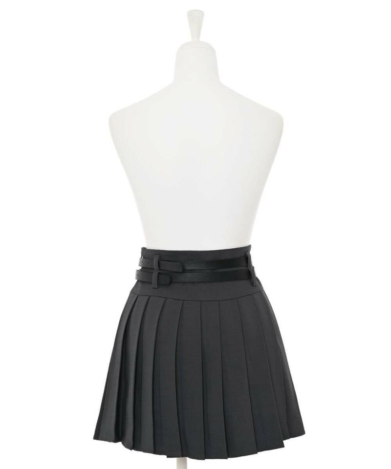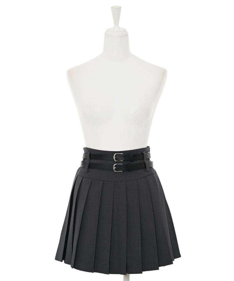 ダブルベルトがコーディネートのアクセントになるミニスカート。綺麗なプリーツデザインで、スタイルアップ効果に。トップスは、インスタイルやクロップド丈がオススメ。ベルトは取り外し可能。【model】:H165 B78 H83 / H163 B78 H84