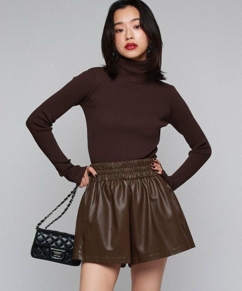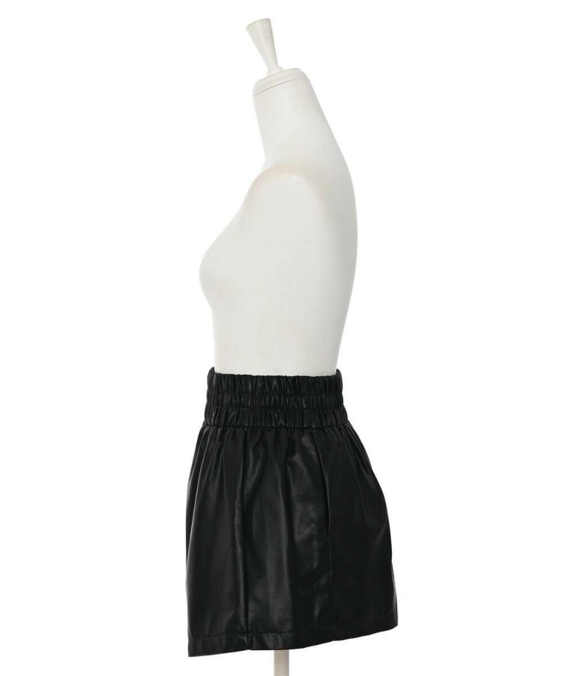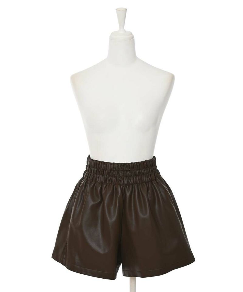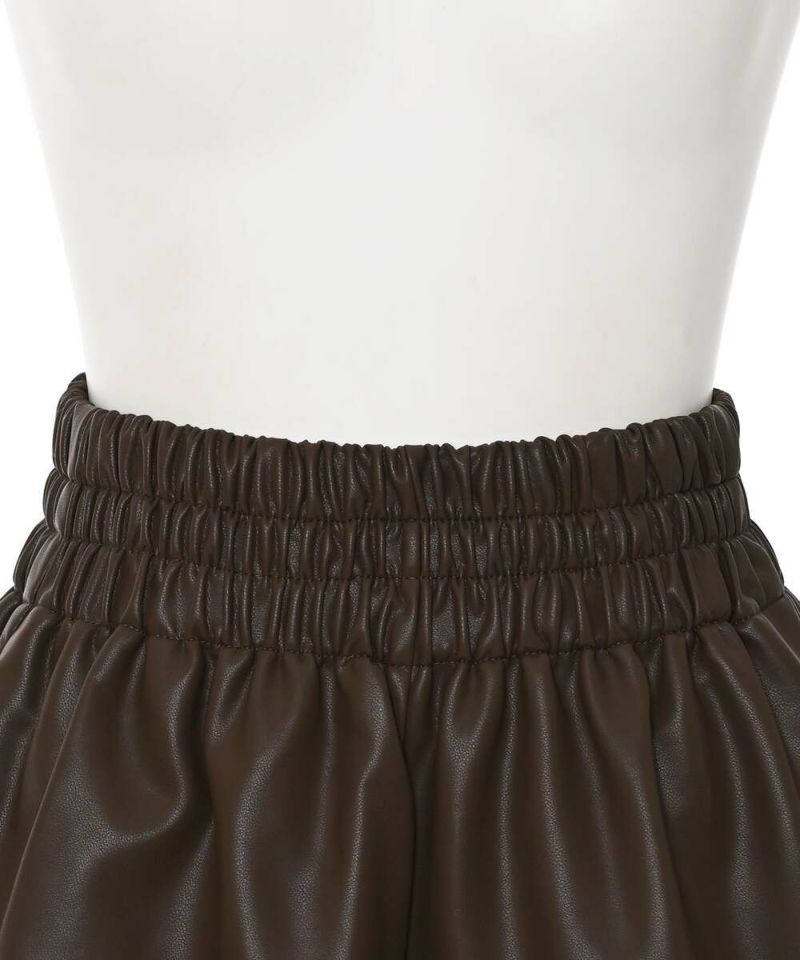 ベーシックなフェイクレザーショートパンツ。ウエストの幅広いゴムシャーリングがストレスフリーに着用。ゆとりのある広めの裾がスタイルアップ効果を。【model】:H165 B78 H83 / H163 B78 H84