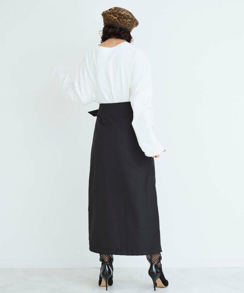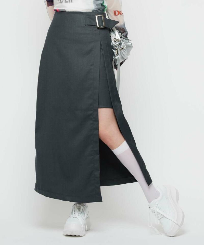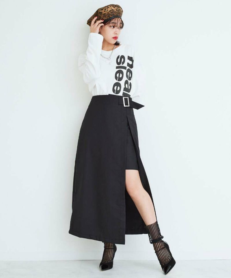 ミニスカートとロングスカートをレイヤード風に仕上げたスリットロングスカート。 大胆なスリットが入っていることで、足さばきしやすくハイウエスト仕様でスタイルアップ効果も期待。 足出すのが苦手な方にも挑戦しやすいデザイン。 サイドジップで着脱可能で、ウエストベルトがワンポイントに。 【model】:H165 B78 H83 / H163 B78 H84