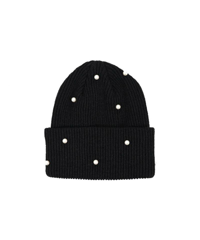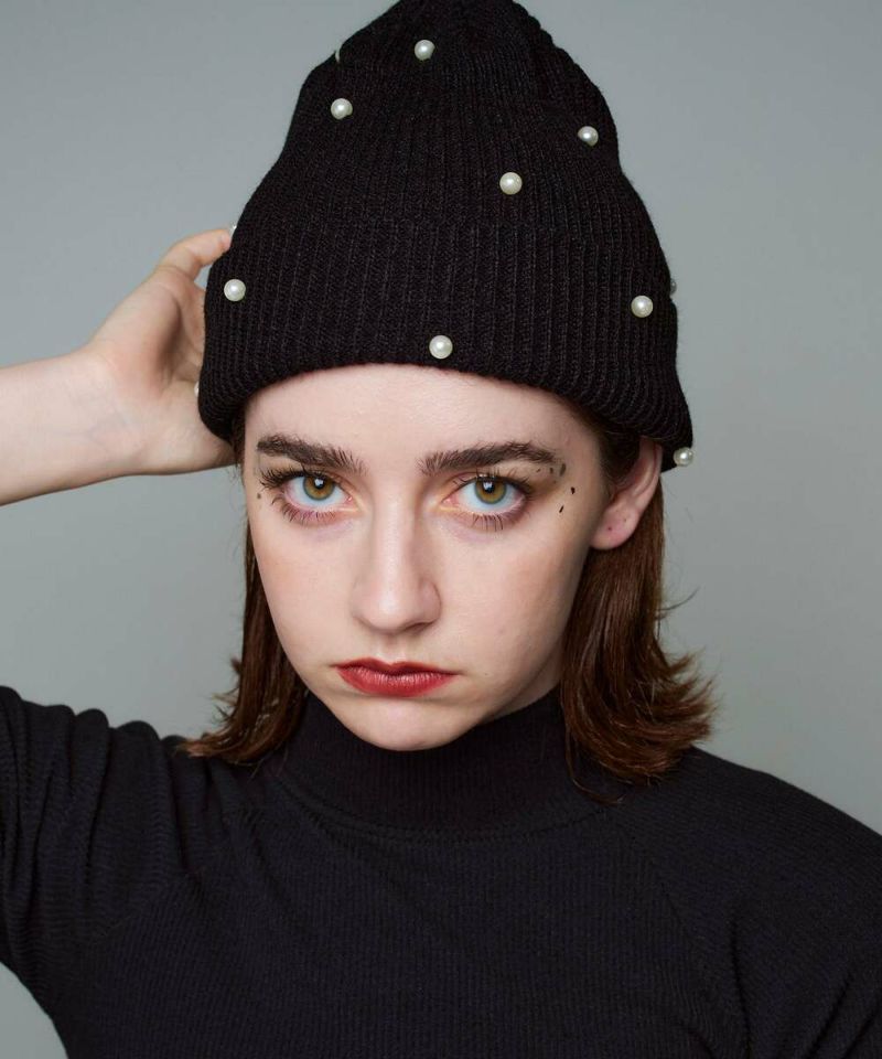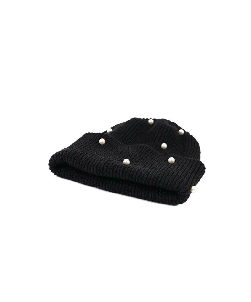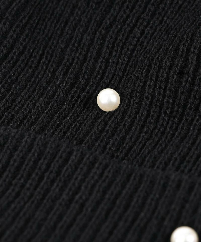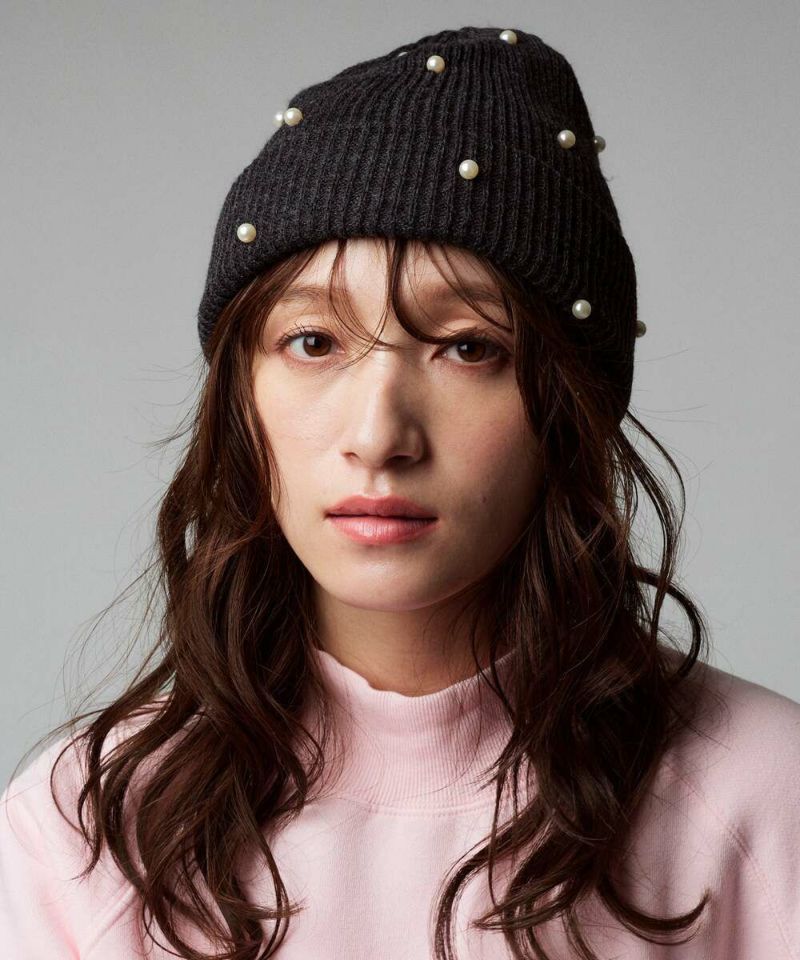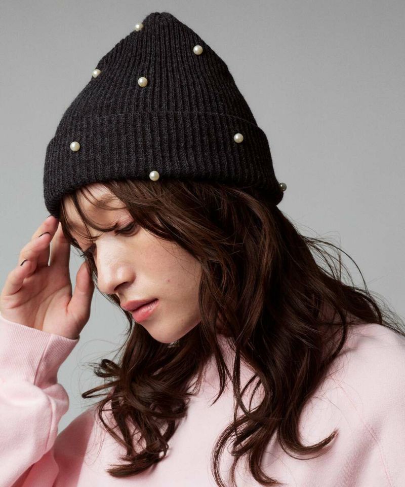 ベーシックなシルエットに、フェミニンなパールをランダムに施したニット帽。