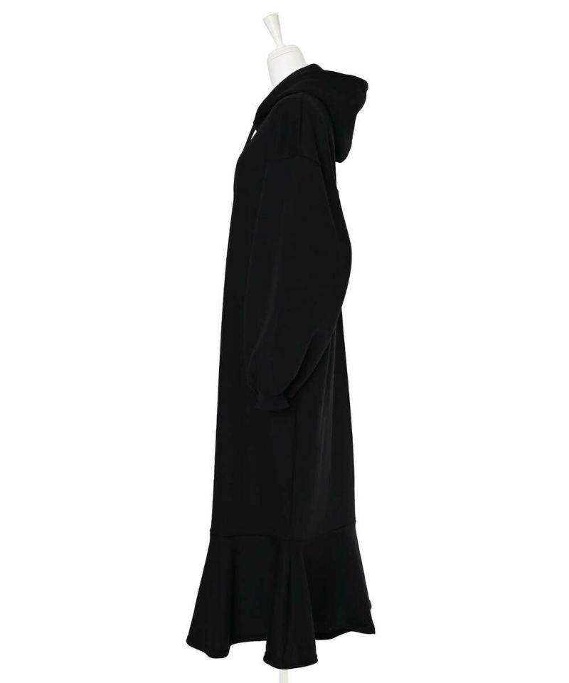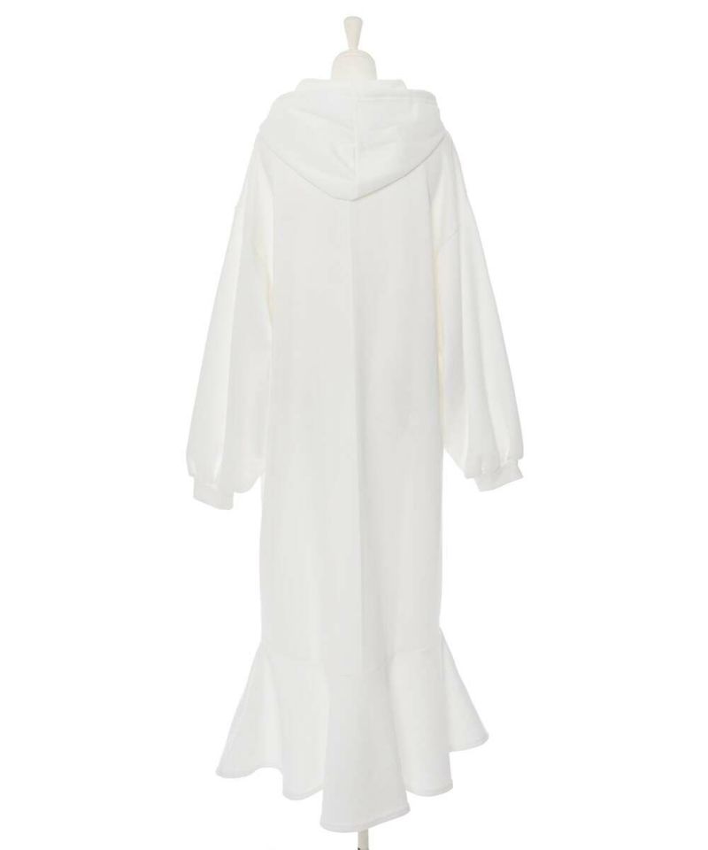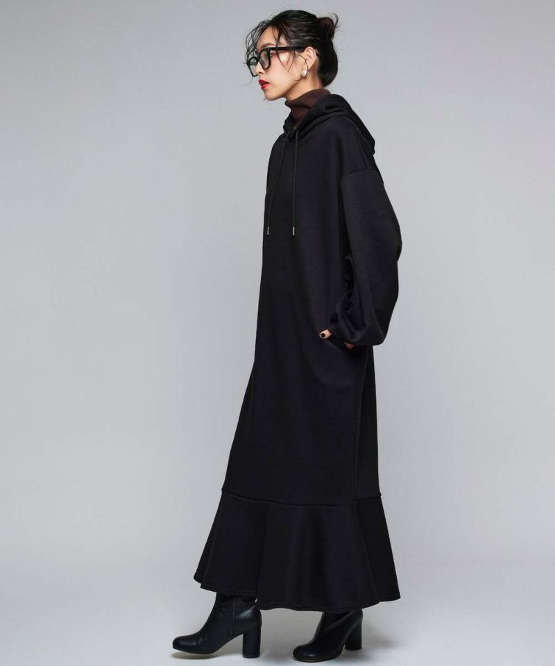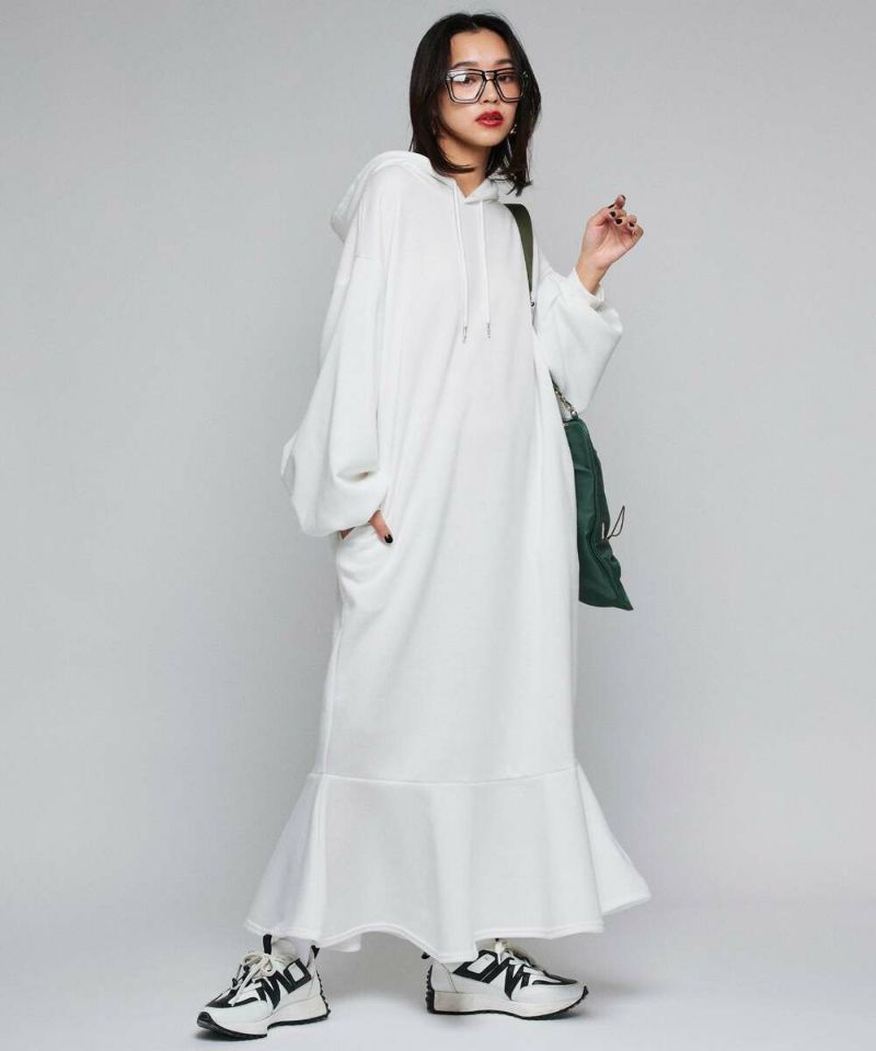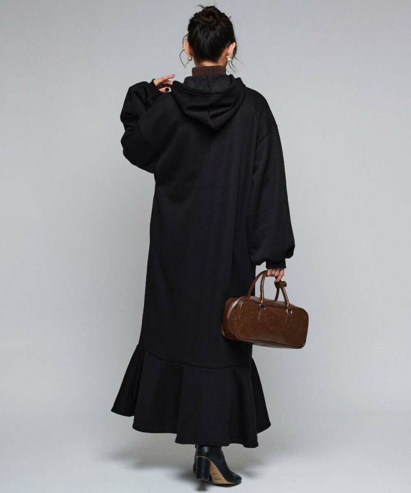 大人可愛い印象を与えるマーメイドシルエットのワンピースに、フードをプラスしてカジュアルダウンさせたアイテム。ゆったりとしたオーバーサイズで抜け感も演出。裏起毛で保温性がありながらも、少し薄めの素材感なので着膨れせずにアウターが羽織れるのも嬉しいポイント。【model】H163 B78 H84