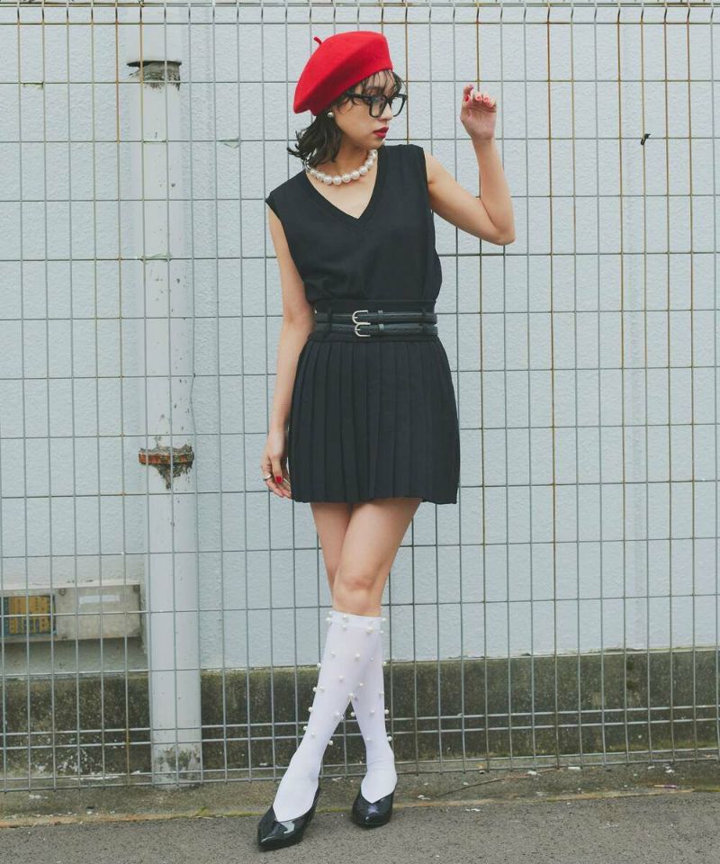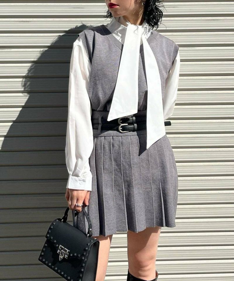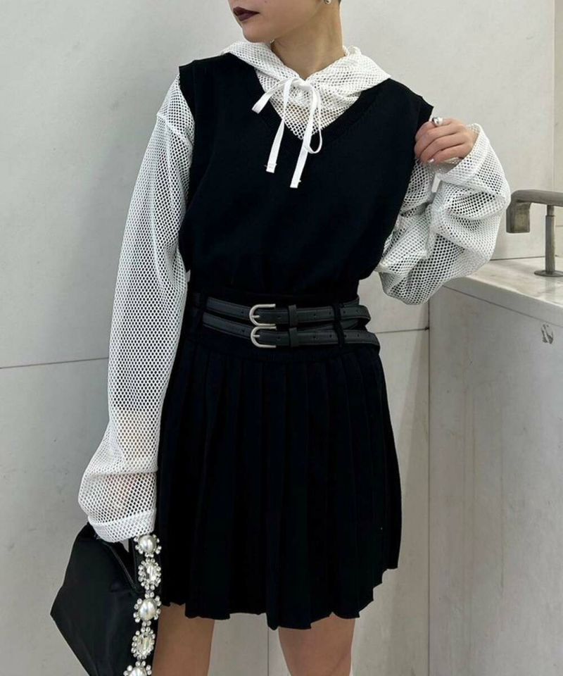 ニット素材のベスト×プリーツミニスカートのセットアップ。薄手のニットなのでサラッと着用でき、レイヤードするとロングシーズン活躍するアイテム。ベルトの取り外し可能なので、ベスト・スカート・ベルトそれぞれ単品使いでき、コーディネートの幅が広がるセット。モデル身長:156cm/163cm/153cm