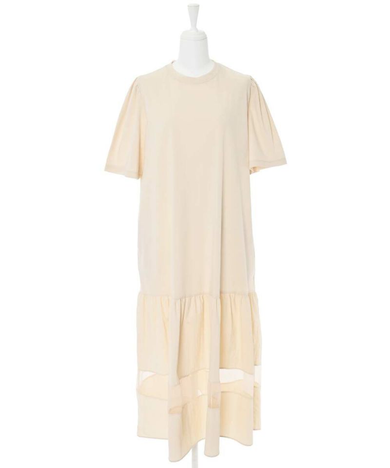 ■ POINTシンプルながらも目を惹く大人のリラックスワンピース。ヒップ下でギャザーを添えた切替えラインのマーメイドシルエット。さらにシアー素材をMIXした洗練されたデザインが魅力。シアー部分から覗く足元がぬけ感をプラス。計算されたシルエットがスタイルアップを叶えてくれるポイント。袖はさりげないパフデザインと五分丈で気になる二の腕をカバー。立体感と程よい女性らしさが魅力的な1枚。ロング丈でもふわっと広がるシルエットで涼しく着用いただけます。ノンストレスな着心地で夏のワードローブにかかせないアイテムに。■ STYLING 1枚でさらっと着るのはもちろん、デニムやボトムとレイヤードしたメリハリのあるコーデもおすすめ。ボディーラインを拾わないゆとりあるシルエットとサイドポケット付きでタウンユース、リゾートにもおすすめ。モード、カジュアル、フェミニンなど合わせるシューズや小物も選ばない着回し力の高さが魅力。【model】H163 B78 H84