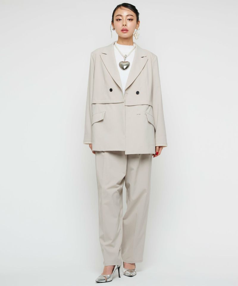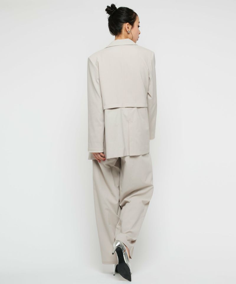 ボタンの取り外しで、ロング丈とショート丈の2WAY仕様で着用可能なテーラードジャケット。型崩れしにくい薄めの肩パッドが入っており、オケージョンスタイルはもちろん、普段使いもしやすい着回しの効くアイテム。国産の同素材を使用したベルトパンツとセットアップコーディネートがオススメ。【model】H165 B78 H83