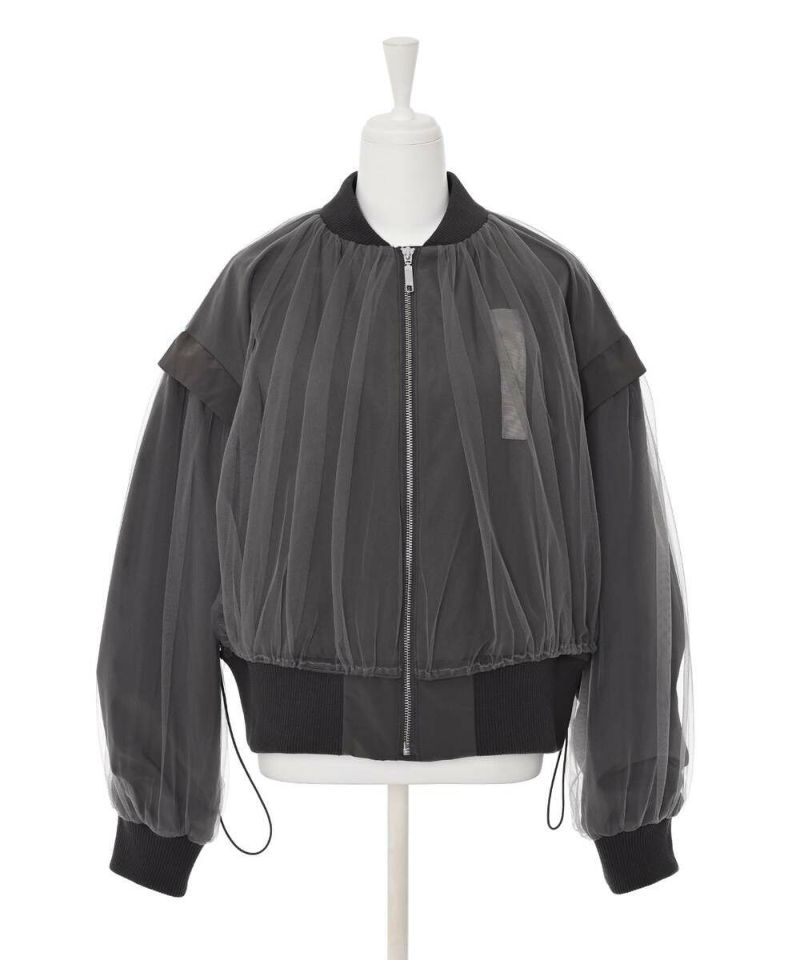 【MIDVEIN】“ストリートとモードを軸とし派生していく 遊び心のあるデザインをリアルクローズに” をコンセプトに“ ニューカジュアル ”を提案しているブランド。軽い着心地なのに防寒性も高いお洒落な優秀MA-1に、チュールがドッキングされたデザイン。ドロストコードがスポーティーな印象を、チュールでフェミニンさをプラス。ボトムを選ばない丈感とシンプルなデザインで着回し力◎【model】H156H163 B78 H84/H160 B80 H85