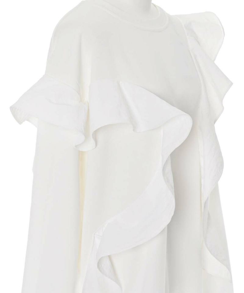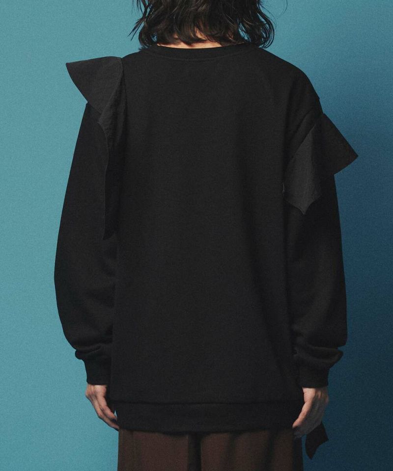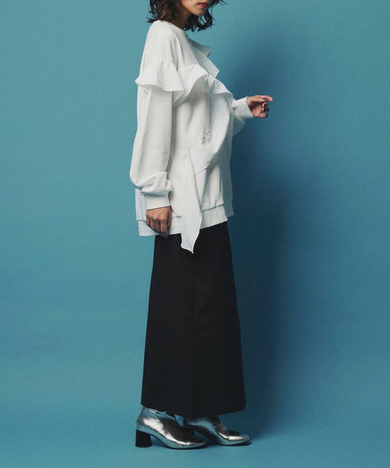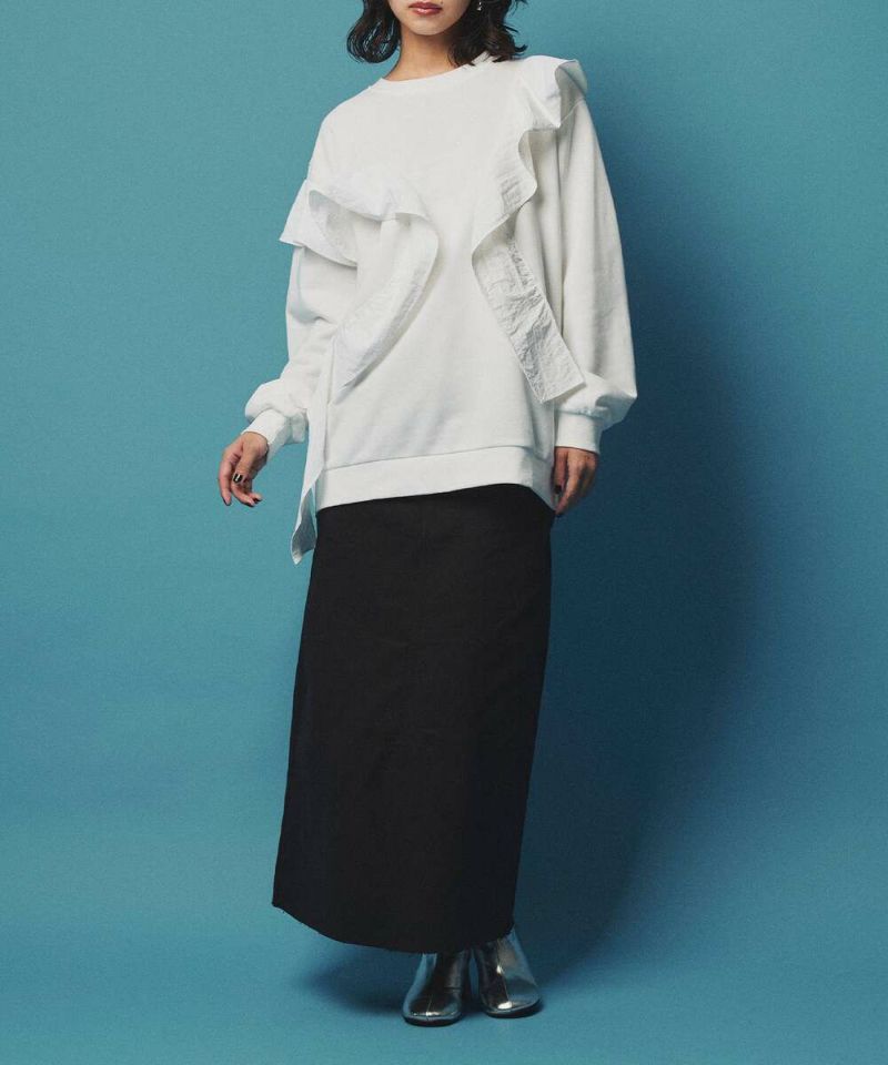 ■ POINTトレンドライクなドッキングデザインが特徴のフリルトップス。左右アンバランスで配置したラッフルフリルはハリ感のある異素材を使用。薄手のスウェット裏毛素材でロングシーズンで着用いただけます。ほどよいオーバーサイズで着心地が良く、体型カバーも期待できるアイテムです。■ STYLINGタイトスカートやスキニーなど細身のボトムでモードなレディスタイルや、デニムやミニ丈ボトムでフェミニンなカジュアルスタイル等、どんなボトムにも合う着回しの効くアイテム。1枚で着映えするデザイン性のあるトップスはシンプルな着こなしでも華やかにみせてくれます。【model】H163 B78 H84