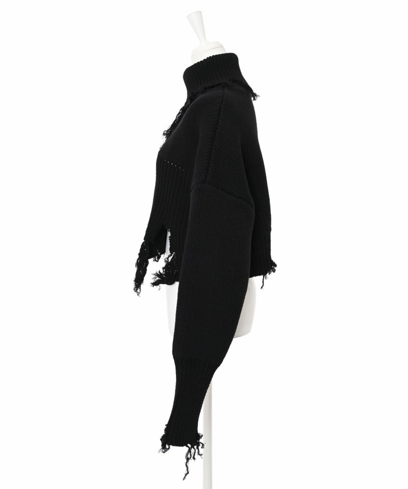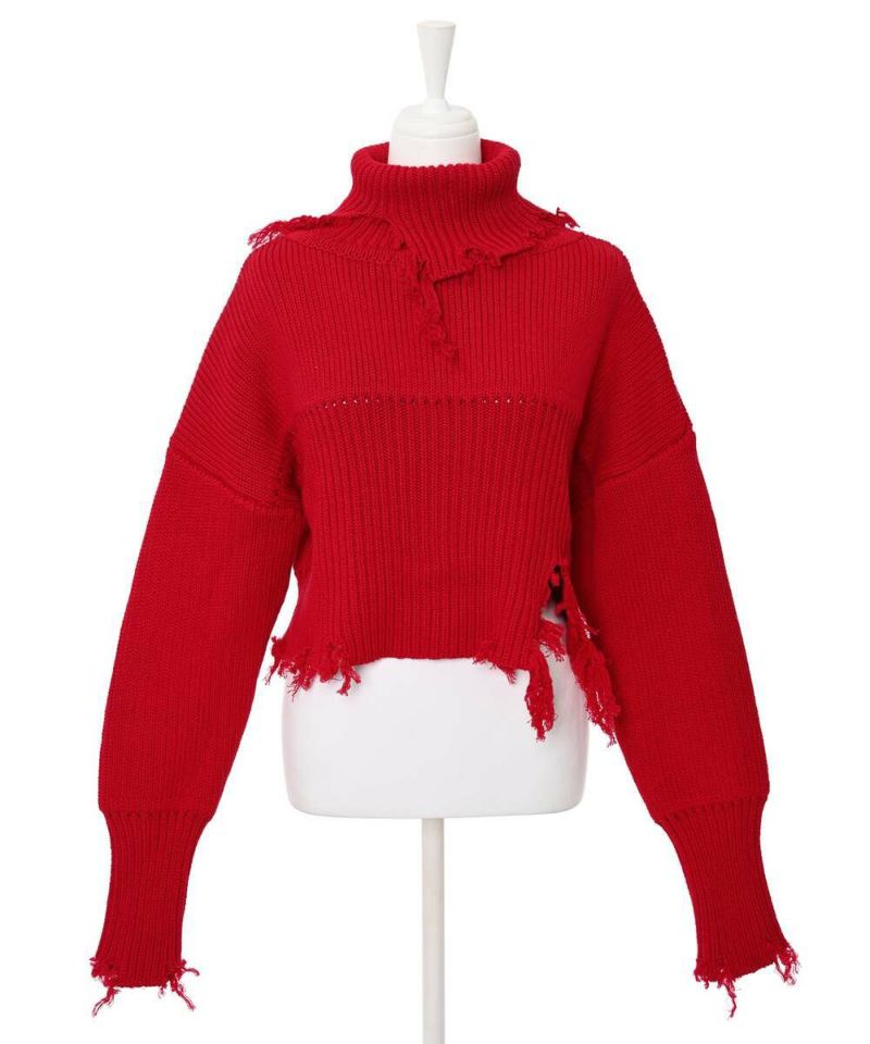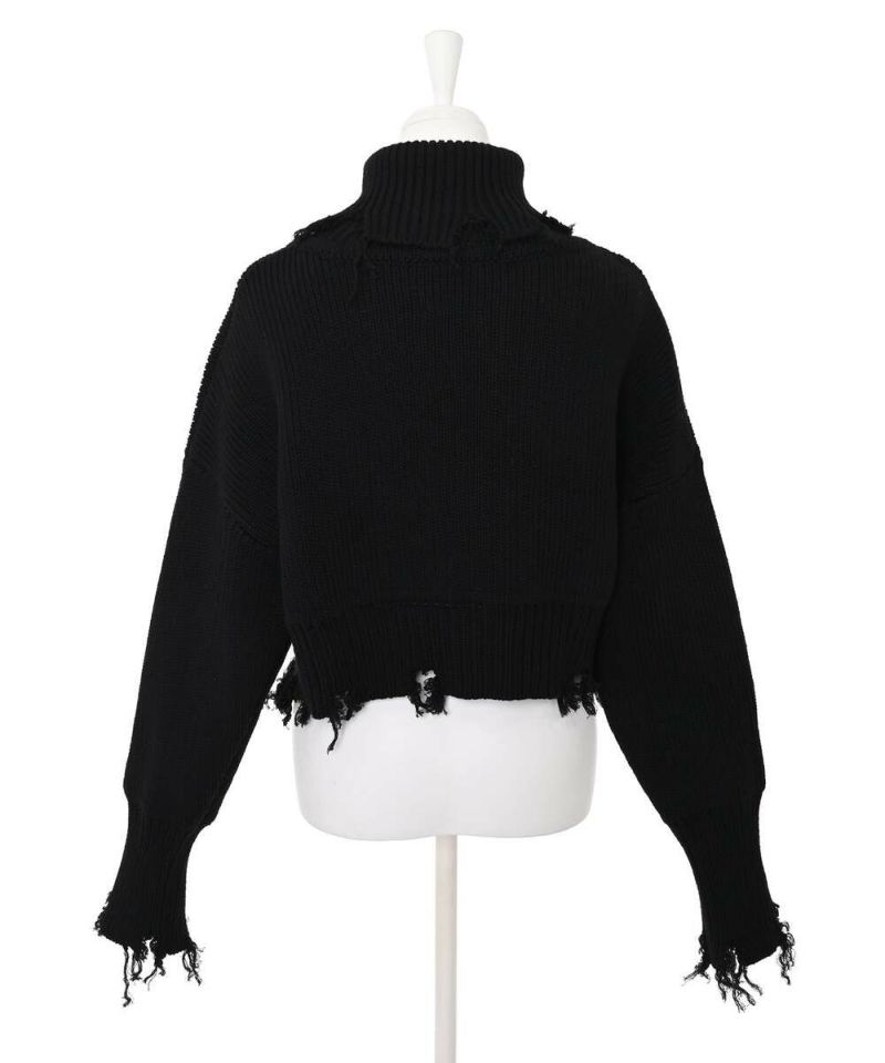 クラッシュ加工を裾・袖・ネック部分に施したニットトップス。バスト部分の切り替えが特徴的で、ボトムスとのバランスが取りやすいショート丈が普段使いしやすいポイント。モデル身長:165cm/155cm/163cm