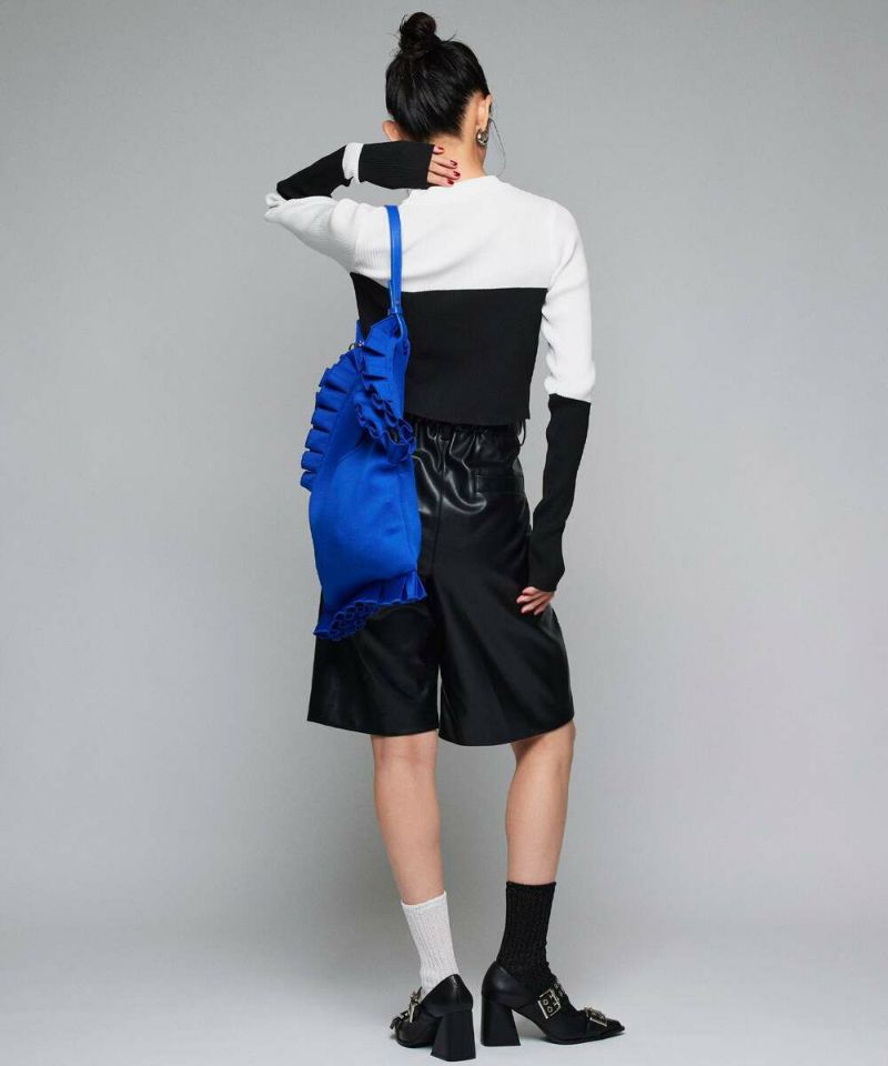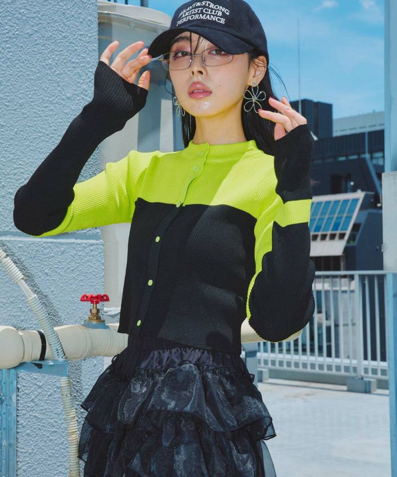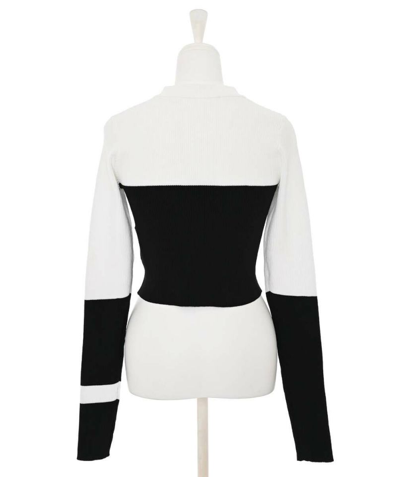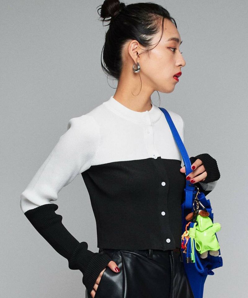 バイカラーの配色が目を惹く一枚。様々なボトムスとバランスよくスタイリングしやすい丈感に拘りました。ビスチェをレイヤードしたような切り替えデザインや、袖口のラインなど細かい部分に遊び心をプラス。ボディラインにフィットするサイジングで、伸縮性があり肌触りの良いニット糸を採用することで、リラックスした着心地を叶えました。ボタンの開閉可能なのでインナーにキャミソールを入れて羽織として着用するのもオススメ。 【model】:H165 B78 H83 / H163 B78 H84