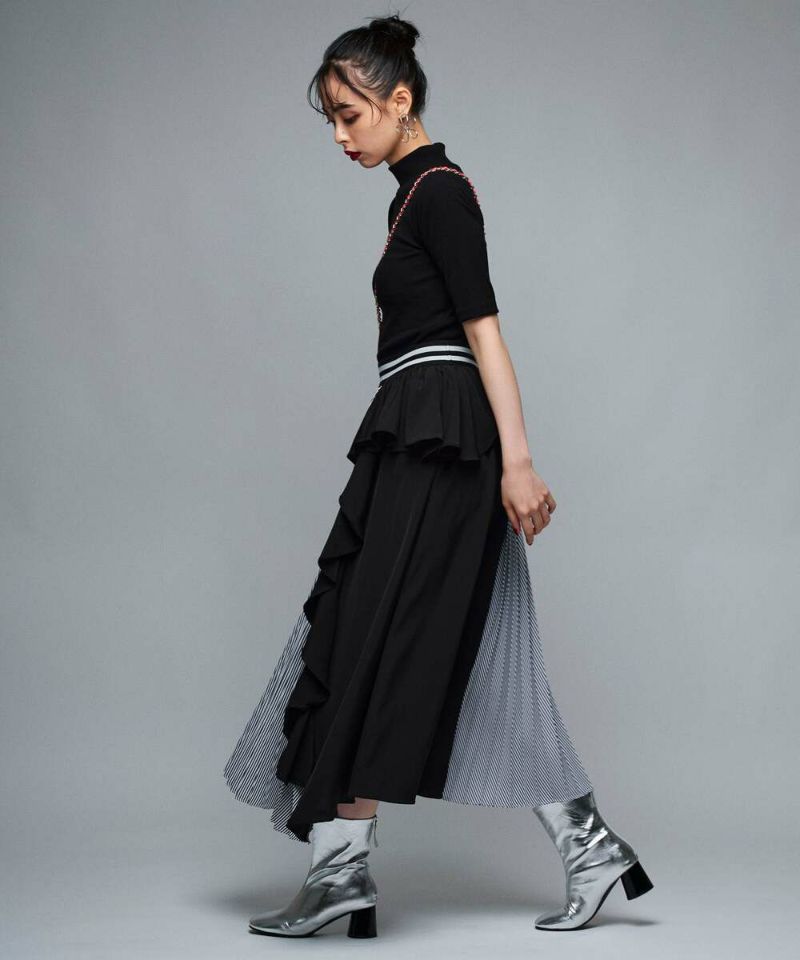 フリル&プリーツ加工のアシンメトリーデザインが目を惹き、スタイリングを華やかにしてくれるロングスカート。ベーシックなトップスと合わせるだけで、お洒落度アップ。ストレスフリーに着用できるウエストゴムを採用。【model】H165 B78 H83