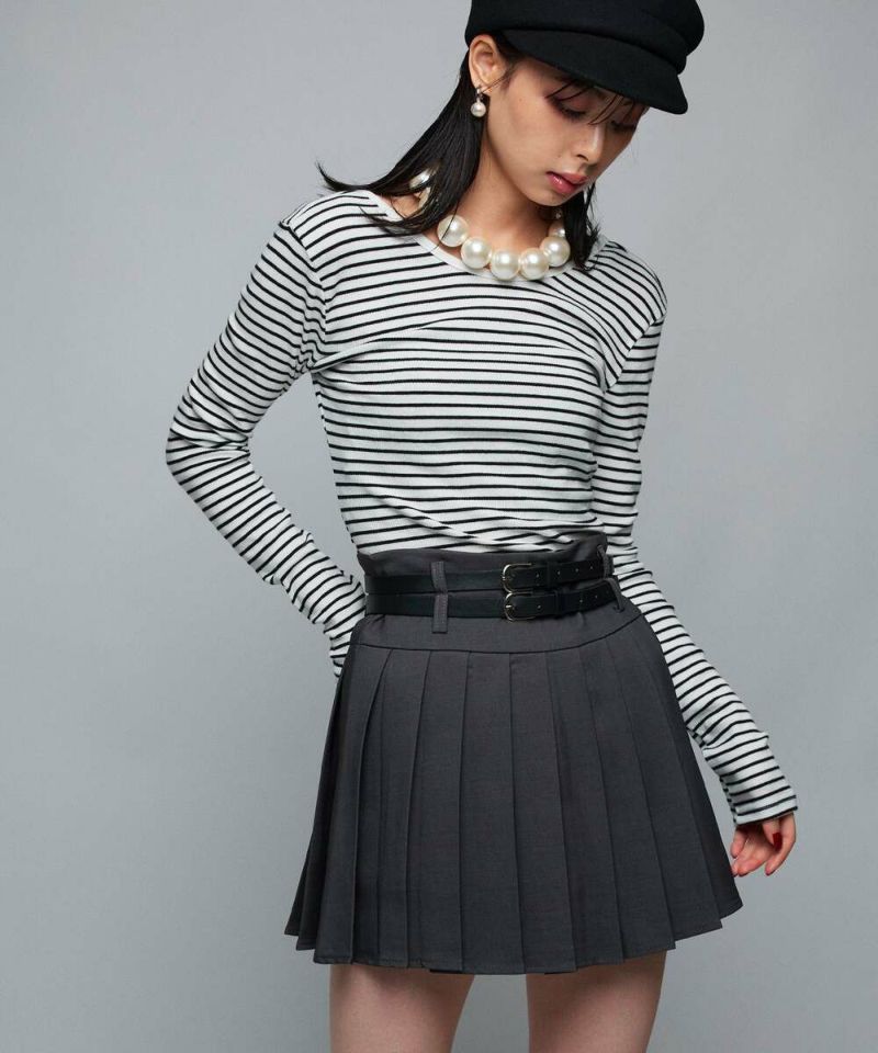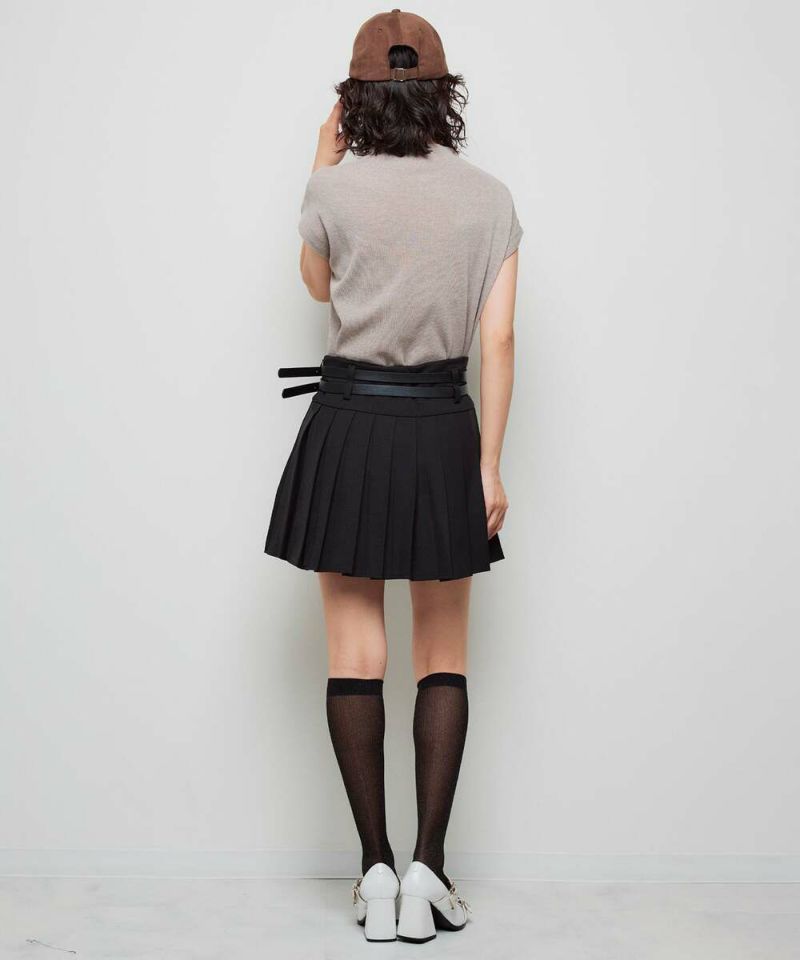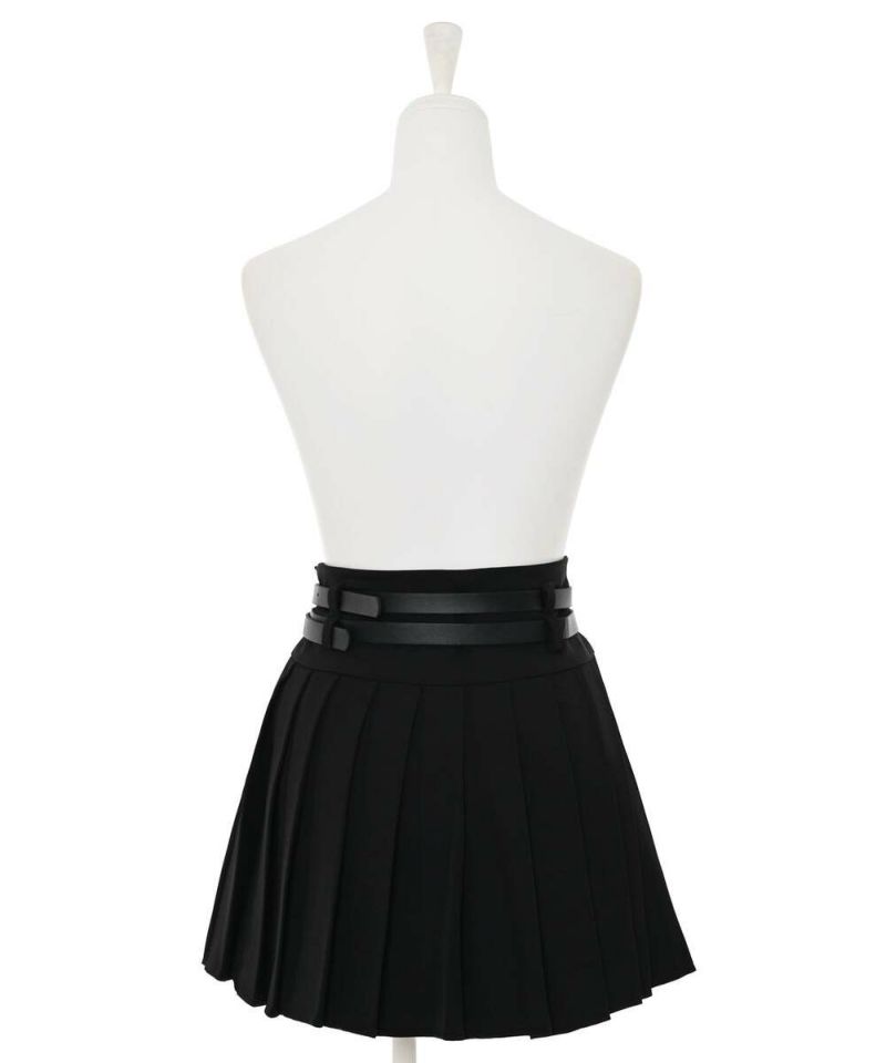 ダブルベルトがコーディネートのアクセントになるミニスカート。綺麗なプリーツデザインで、スタイルアップ効果に。トップスは、インスタイルやクロップド丈がオススメ。ベルトは取り外し可能。【model】:H165 B78 H83 / H163 B78 H84