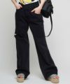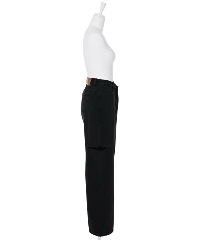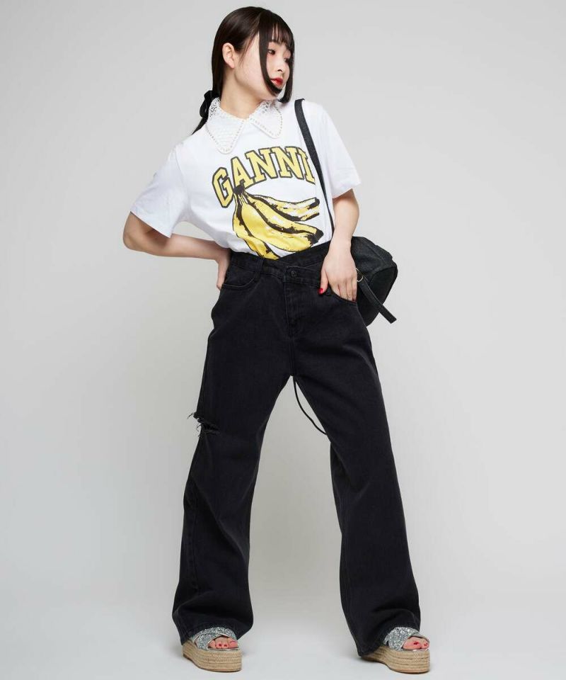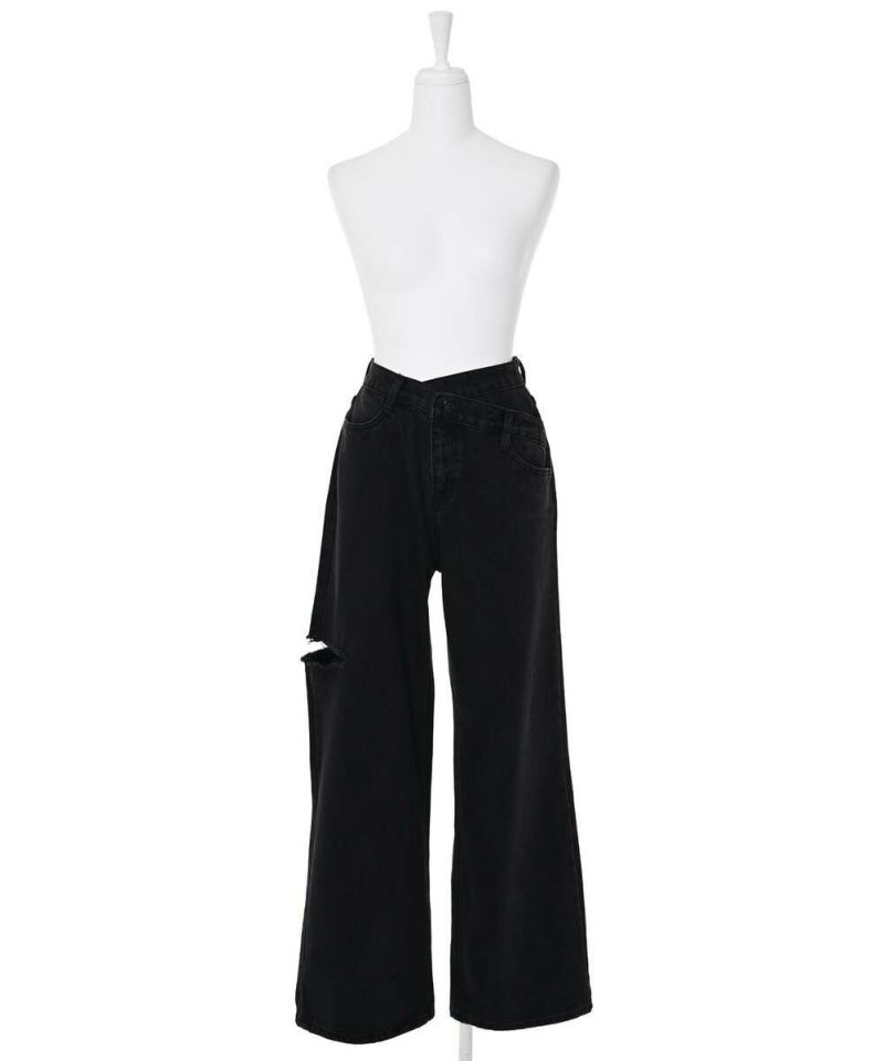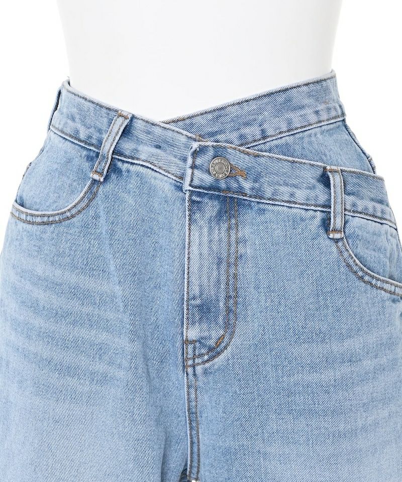 ウエスト部分がアシンメトリーでクロスデザインになったハイウエストデニム。浅めのカットデザインが、さりげない肌見せとなり安心して着用可能。裾にかけて程よくゆとりのあるサイズ感が魅力。※デニムのお色味は、ワンウォッシュデニムとなるため、バックタグにヴィンテージ感がございます。ご了承ください。【model】H156H165 B78 H83