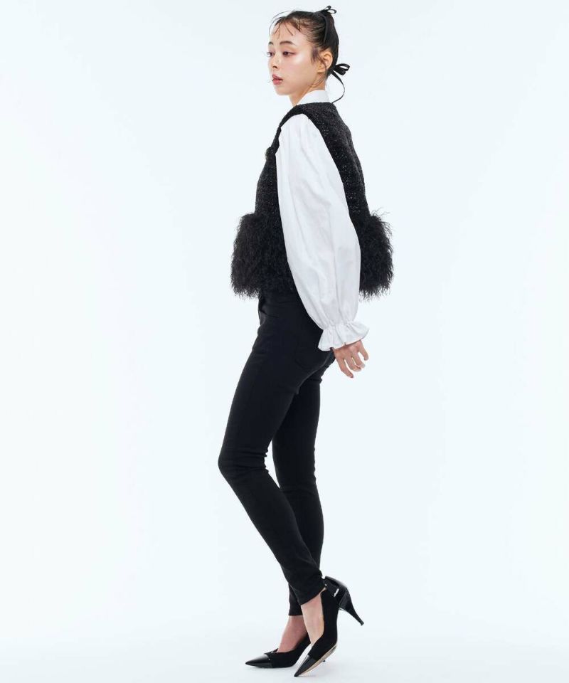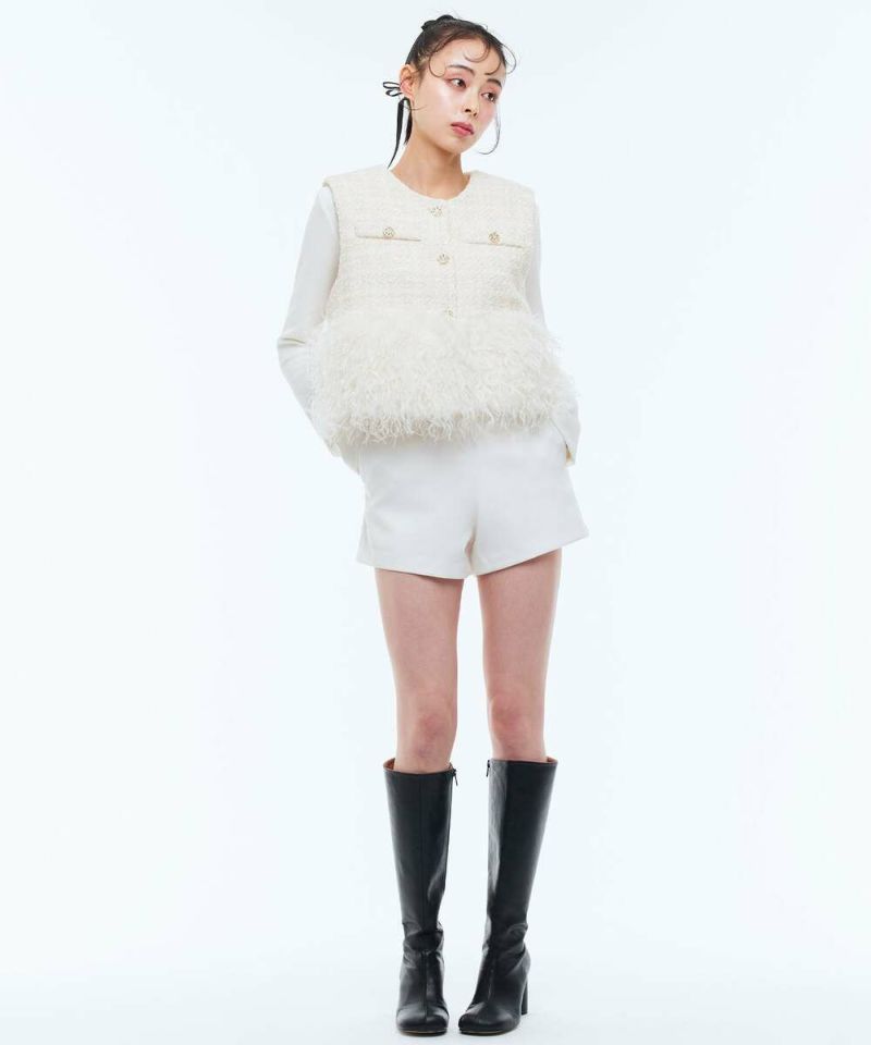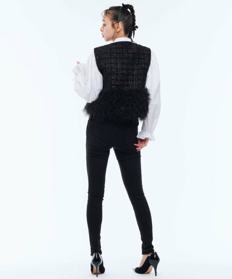 ラメ入りのツイードデザインはエレガントさがあり、上品でトレンド感のあるお洒落なベスト。裾のファー部分がシーズンライクな印象に。ビジューとパールをあしらったボタンが更に女性らしさをプラス。ボトムスとのバランスが取りやすい少し短めの丈感。