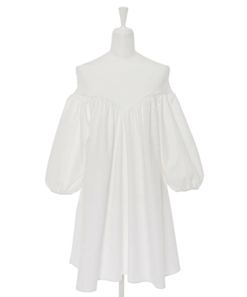 デコルテを映えさせるオフショルデザインとパフスリーブが女性らしいワンピース。オフショル部分は伸縮性のあるリブ素材で、身頃と袖部分は風通しの良いコットン素材を使用。ボディラインを拾わないAラインシルエットが嬉しいポイント。【model】H165 B78 H83