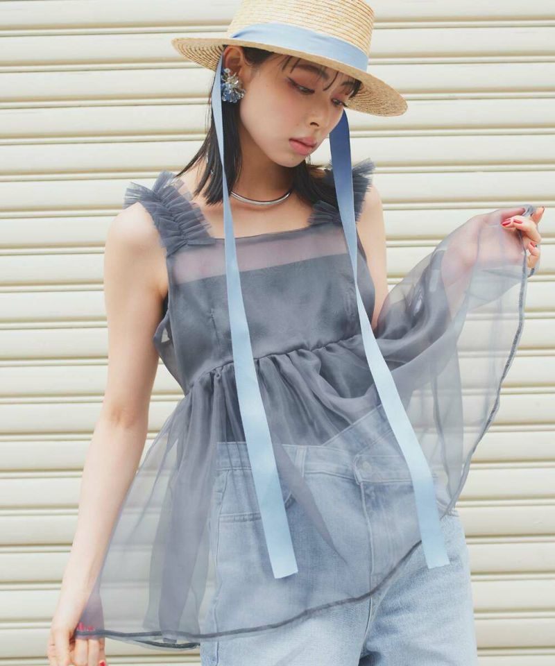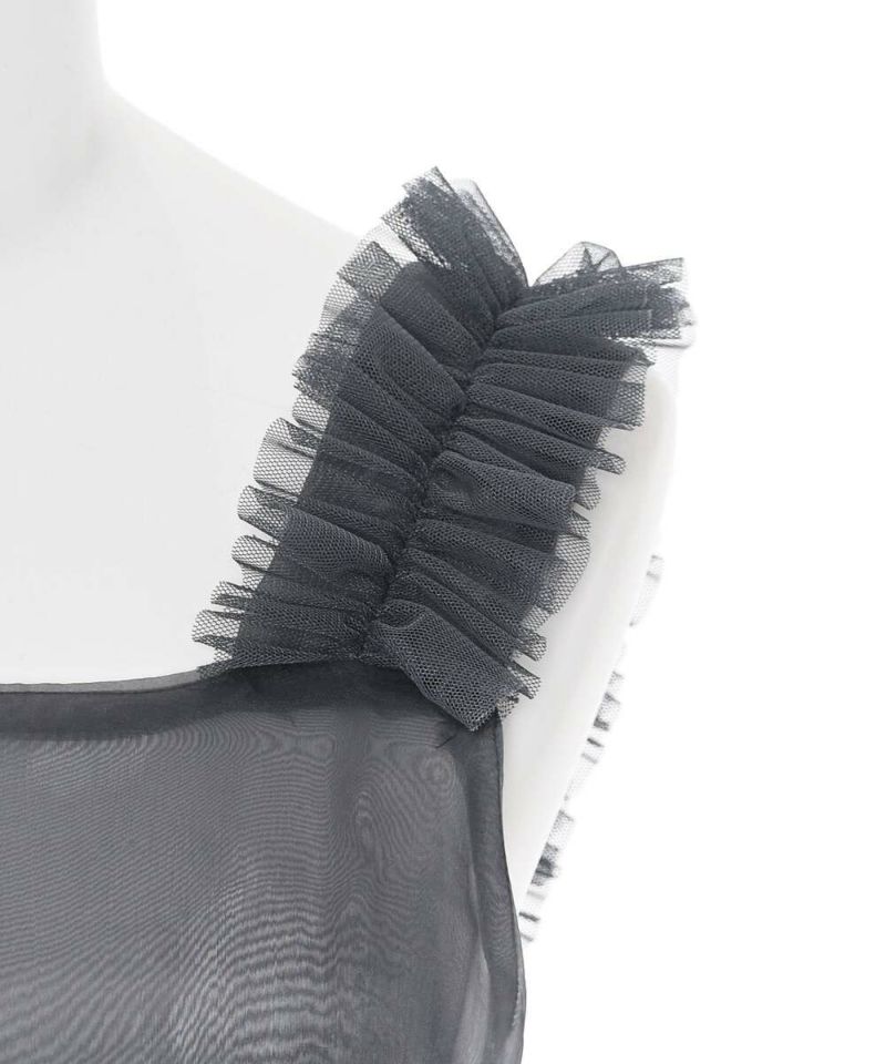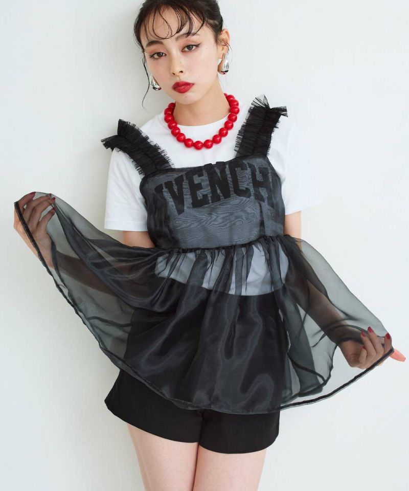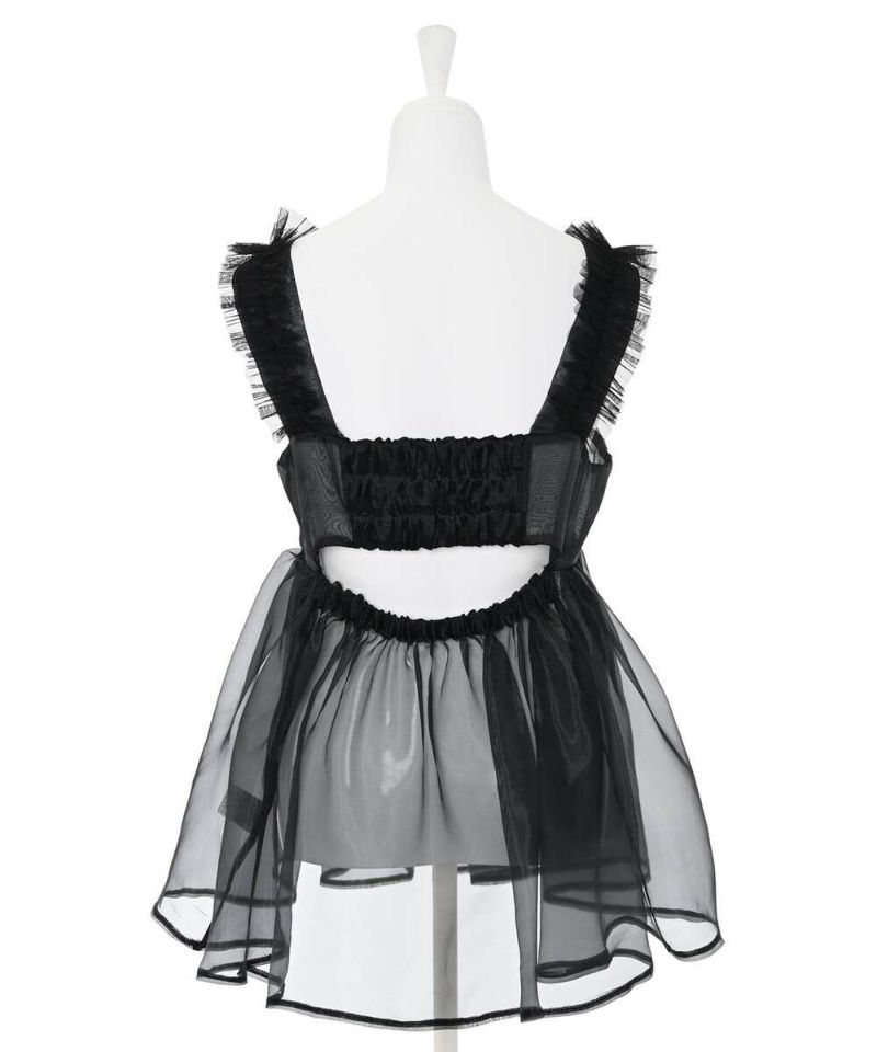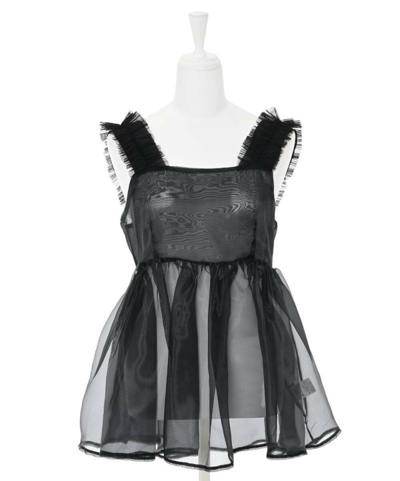 チュールとオーガンジーを採用した、ランジェリーディティールが女性らしいビスチェ。 薄手で軽い着心地に仕上げました。 ショルダー部分の細かいチュールに拘り、全体的に透け感があることでシーズンムードをアップしてくれるアイテム。 バックにシャーリングを使用しておりますが、身幅はタイトなシルエットになっているので レイヤードアイテム薄手の素材をオススメしてます。【model】H165 B78 H83/156cm