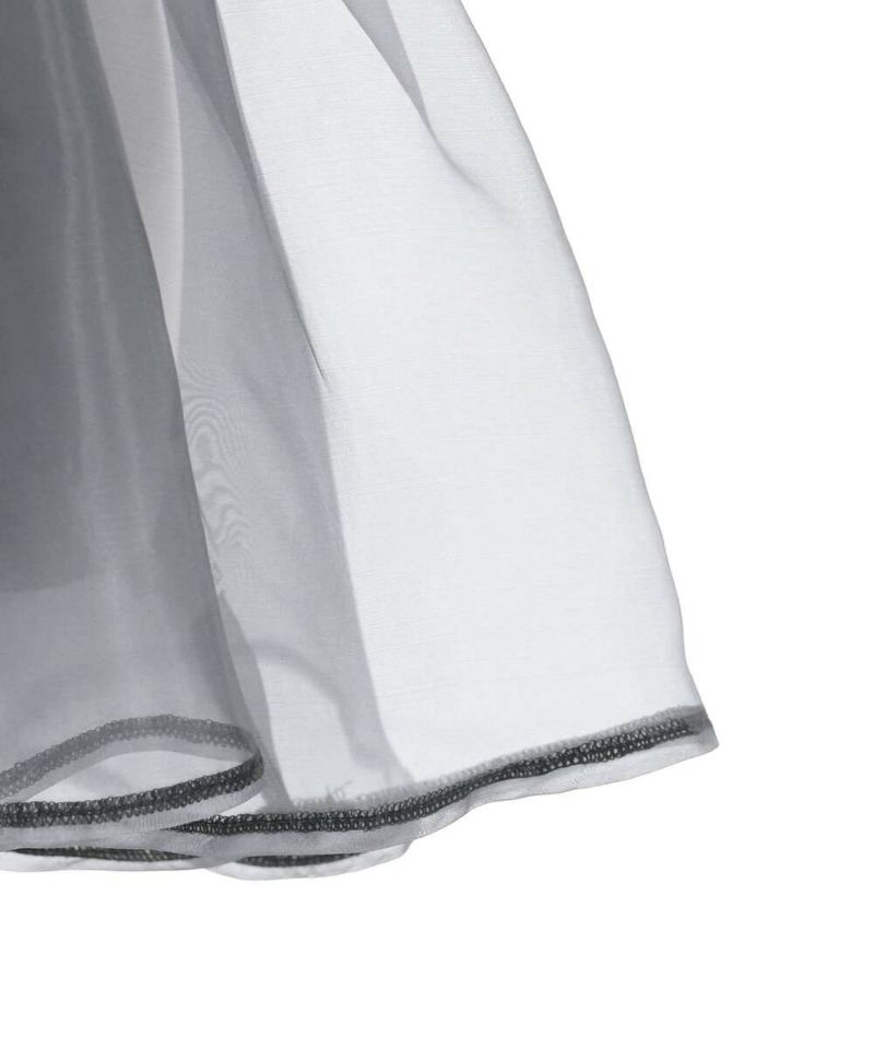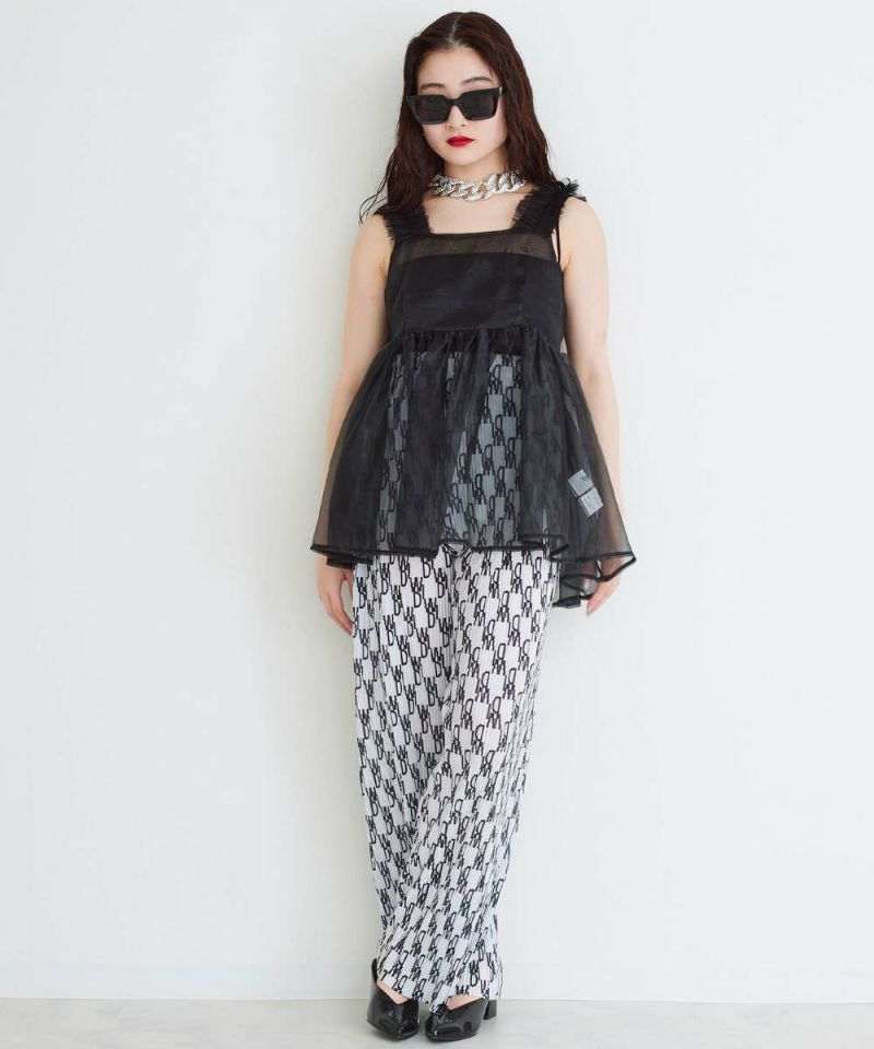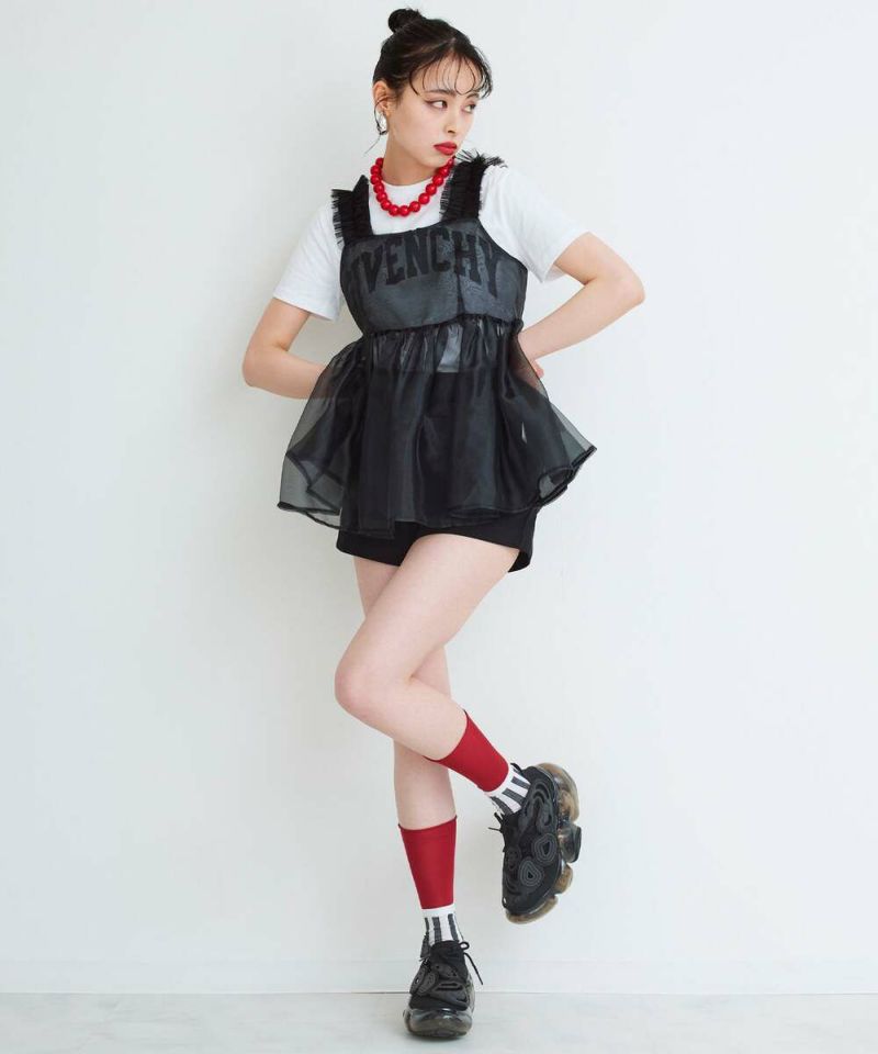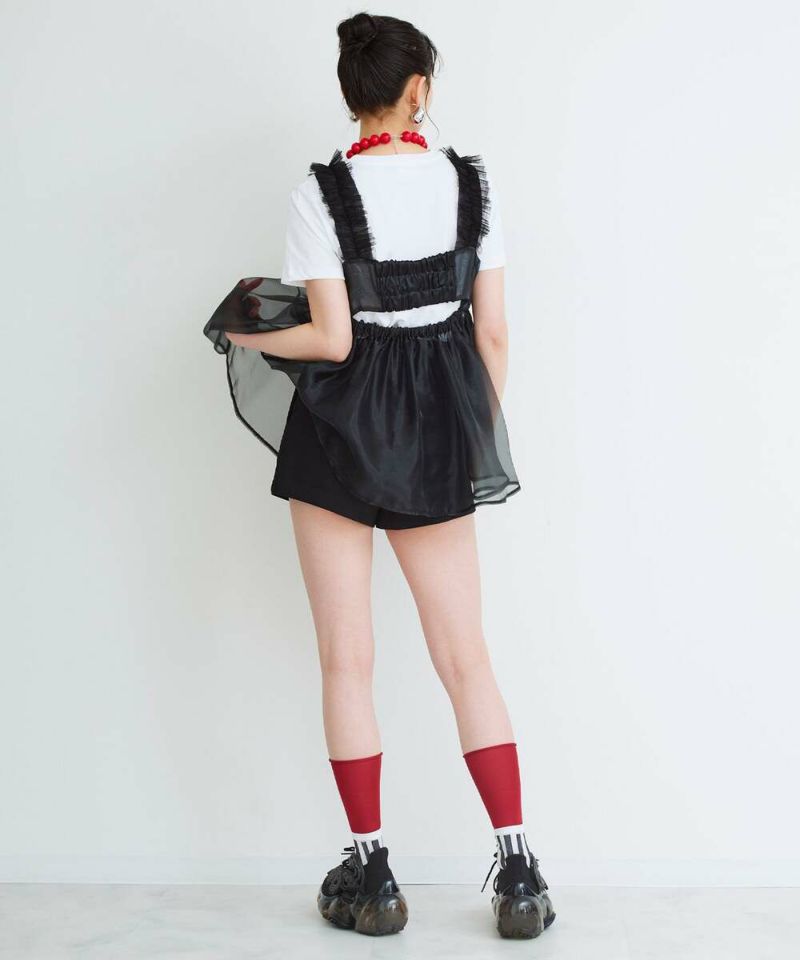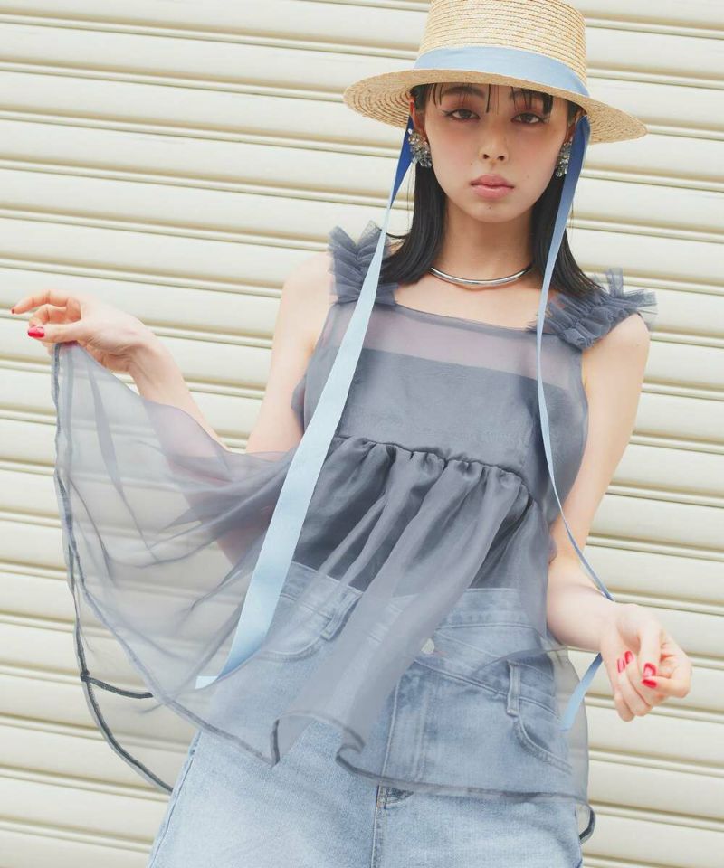 チュールとオーガンジーを採用した、ランジェリーディティールが女性らしいビスチェ。 薄手で軽い着心地に仕上げました。 ショルダー部分の細かいチュールに拘り、全体的に透け感があることでシーズンムードをアップしてくれるアイテム。 バックにシャーリングを使用しておりますが、身幅はタイトなシルエットになっているので レイヤードアイテム薄手の素材をオススメしてます。【model】H165 B78 H83/156cm