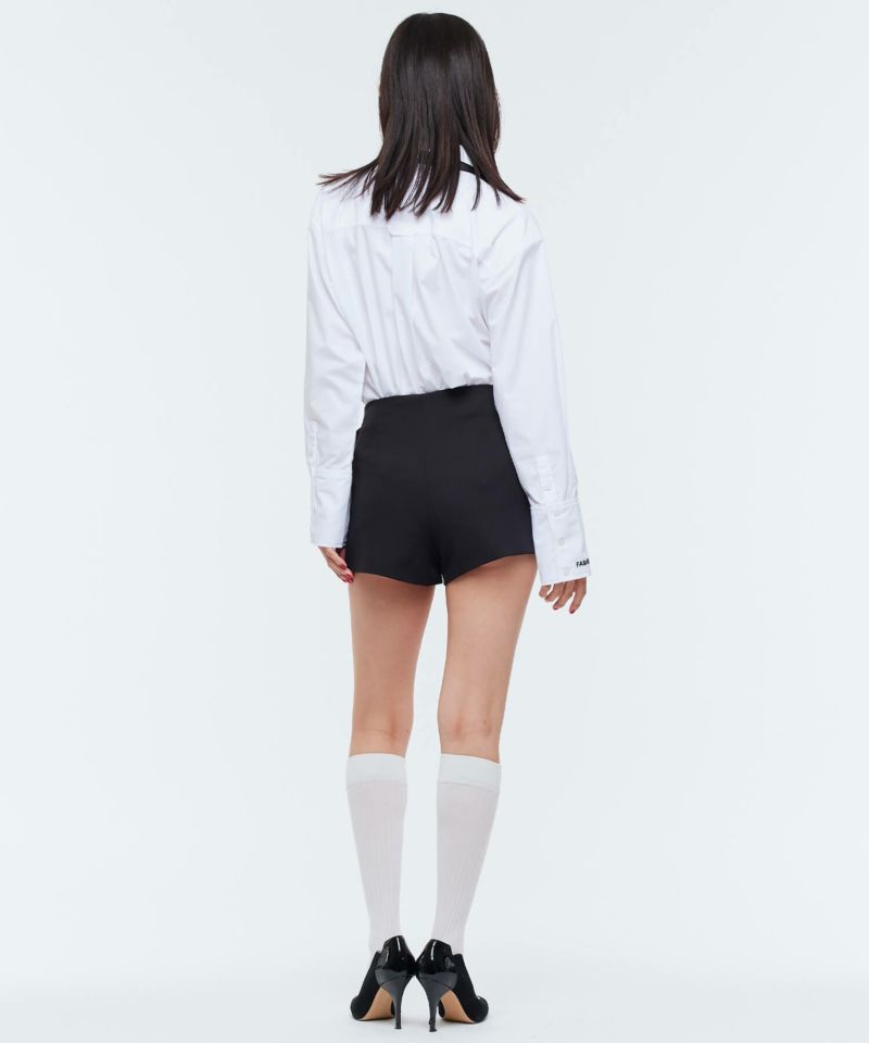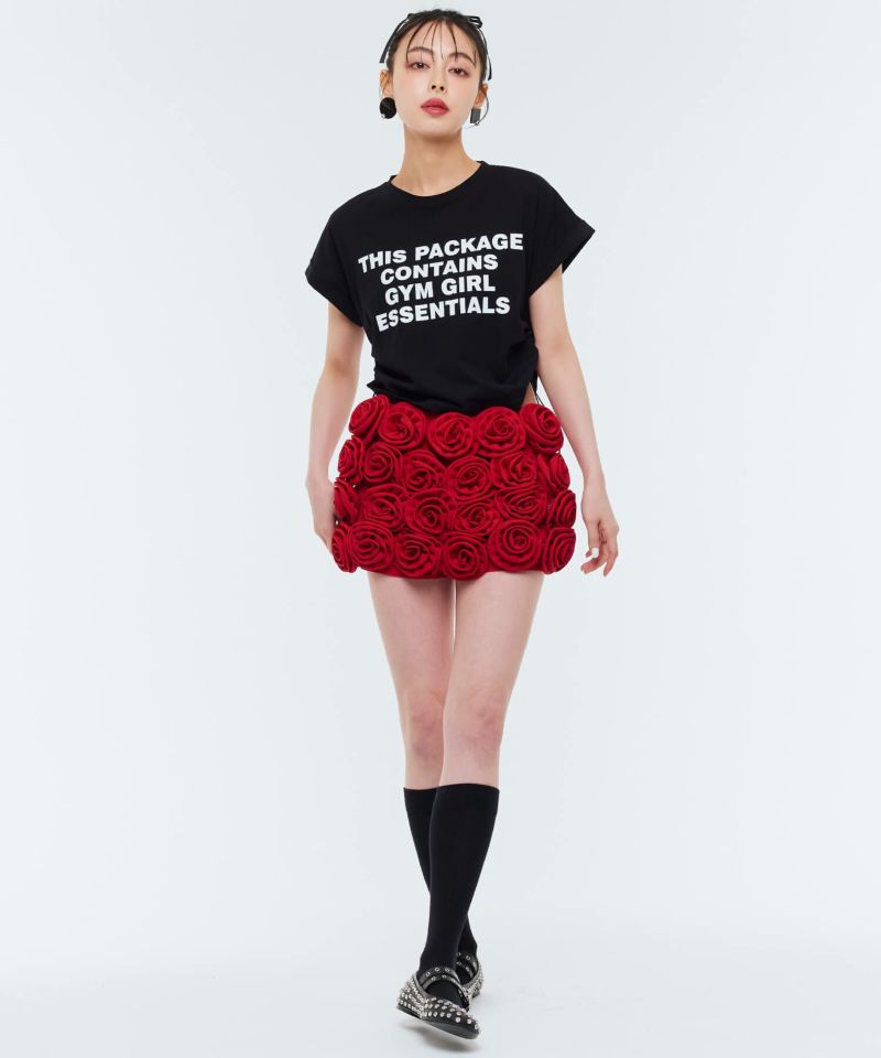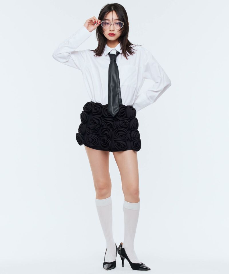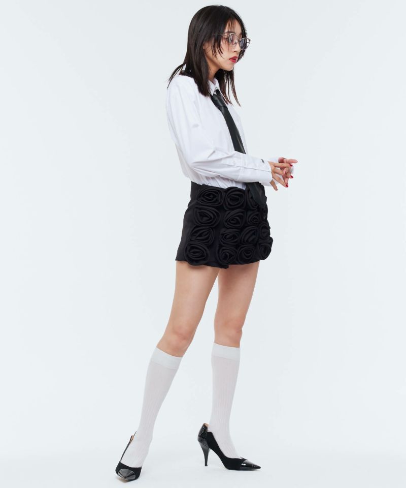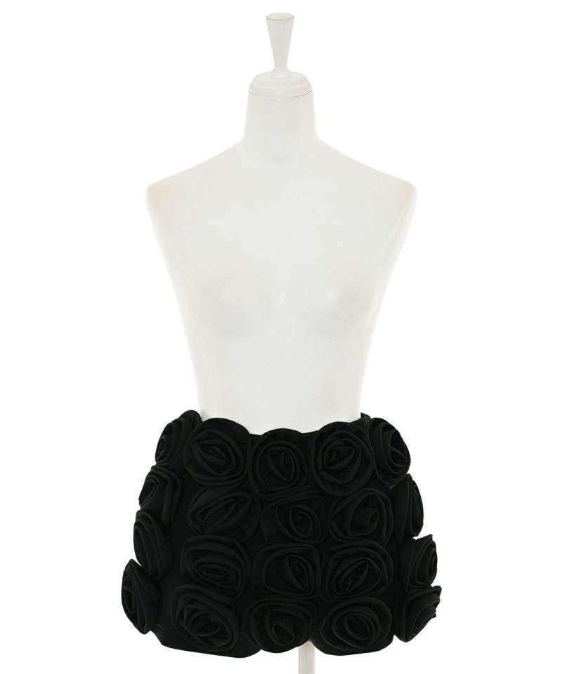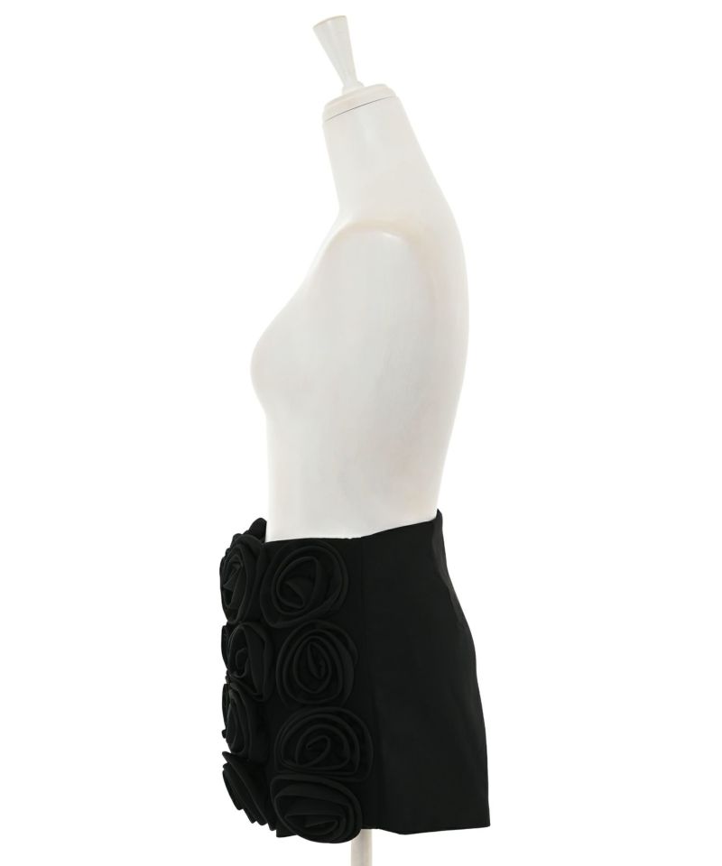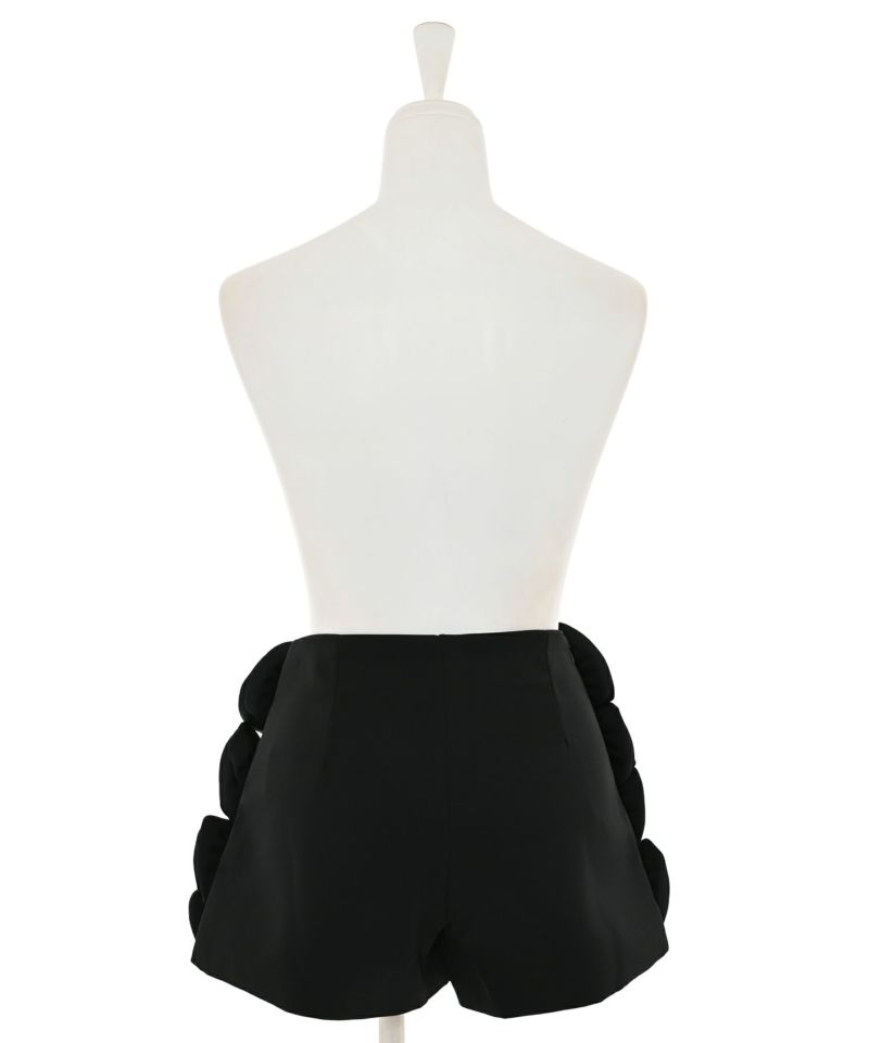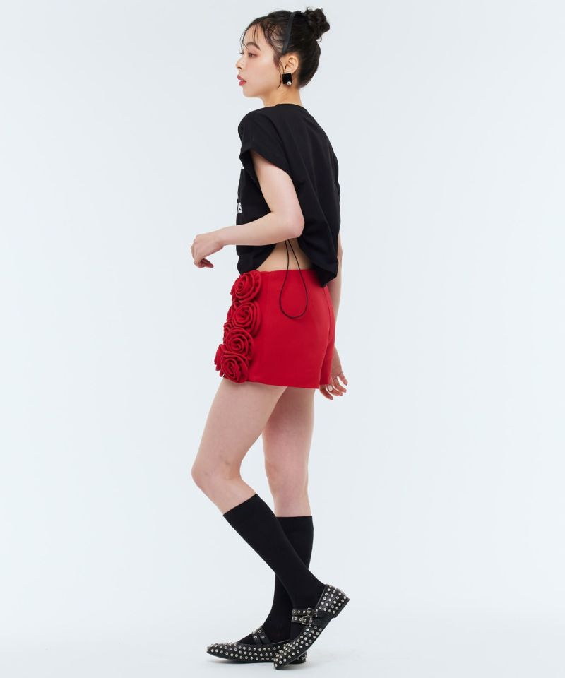 ローズモチーフが前面にあしらわれた存在感抜群なショートパンツ。前面ではミニスカートに見える前後アシンメトリーデザインが個性的で他にはないアイテム。コーディネートの主役級アイテム。【model】H165 B78 H83 / H163 B78 H84