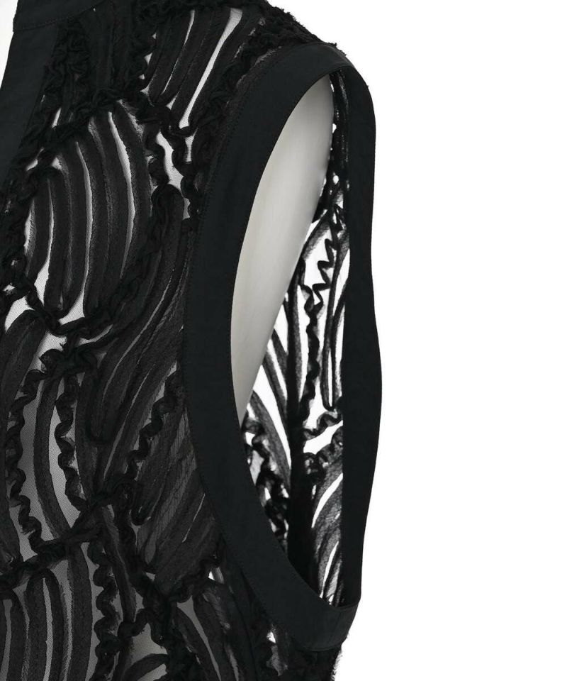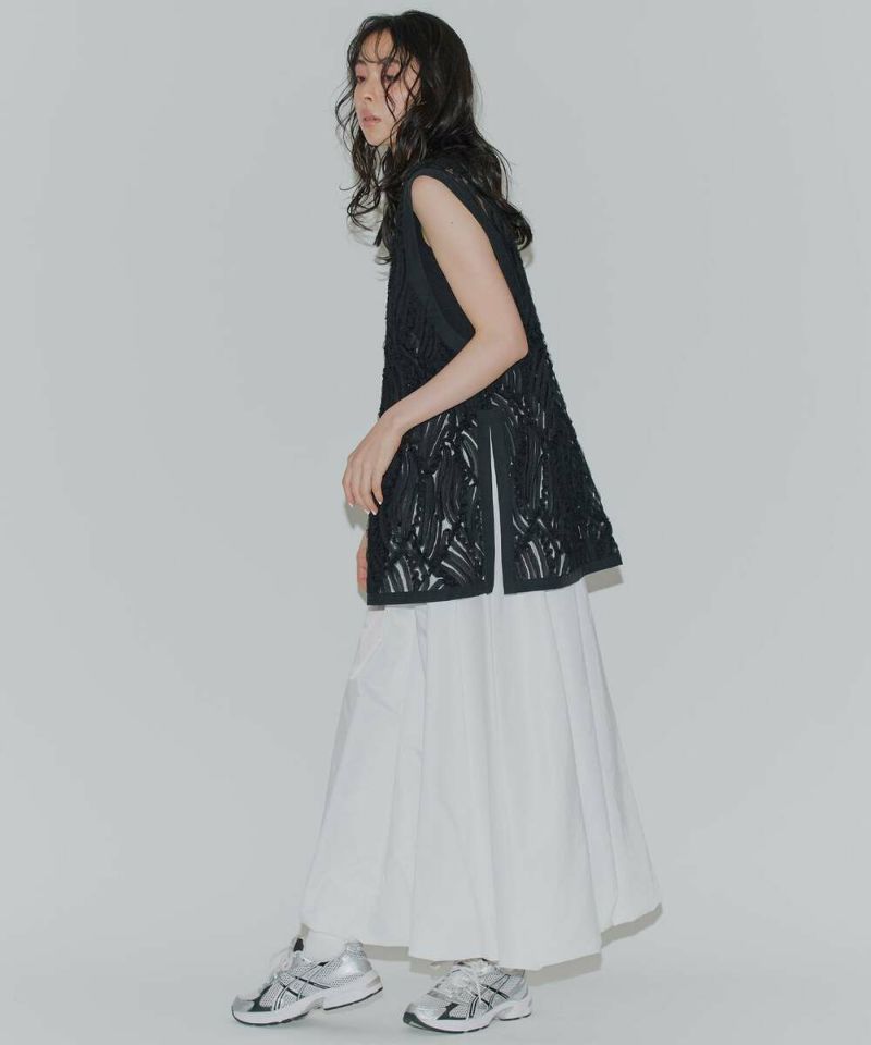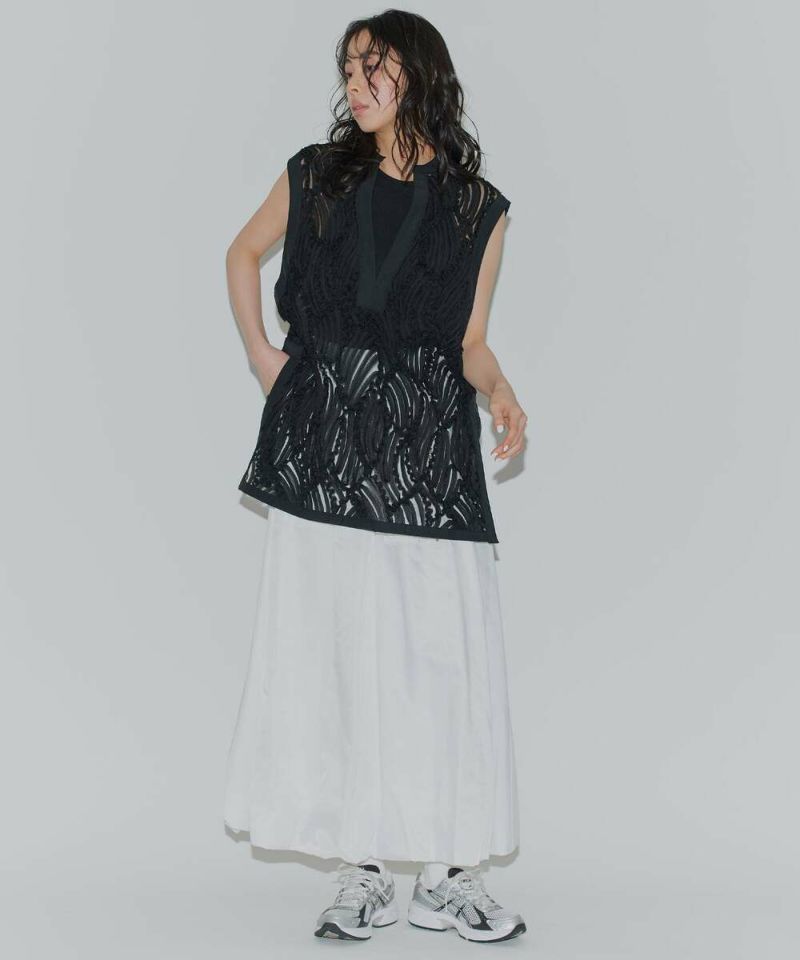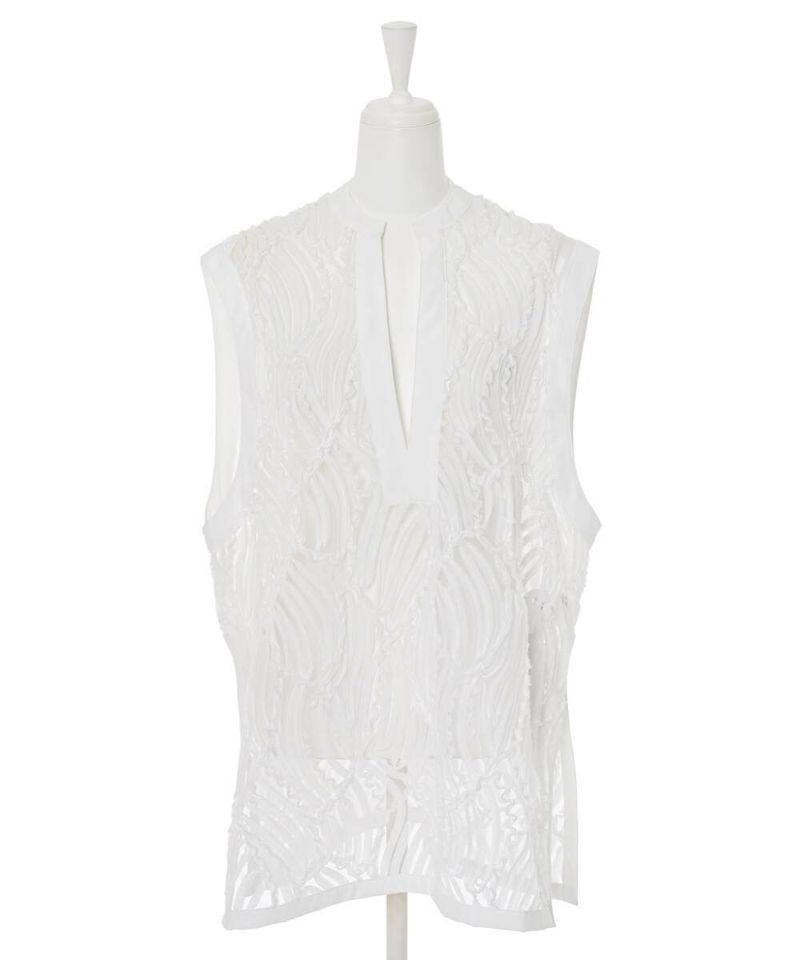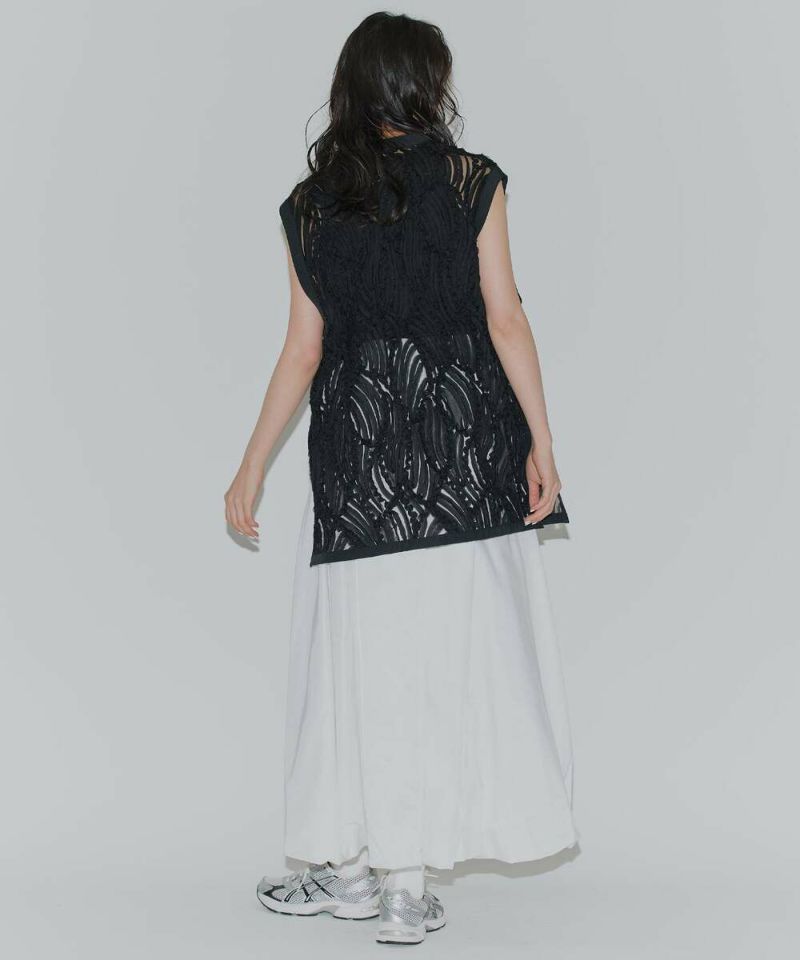 薄い布地に透かし模様の刺繍を施したエンブロイダリー素材を使用したトップス。サイドスリットが入っており、ゆったりとしたストレスフリーなサイジングでヒップラインが隠れる着丈に設定。深めのVネックとシアー素材が清涼感のある上品な印象に。シャツやTシャツ・気温が上がる時期はノースリやワンピース等とレイヤードするのもオススメ。【model】H165 B78 H83