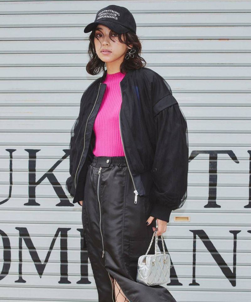 【MIDVEIN】“ストリートとモードを軸とし派生していく 遊び心のあるデザインをリアルクローズに” をコンセプトに“ ニューカジュアル ”を提案しているブランド。軽い着心地なのに防寒性も高いお洒落な優秀MA-1に、チュールがドッキングされたデザイン。ドロストコードがスポーティーな印象を、チュールでフェミニンさをプラス。ボトムを選ばない丈感とシンプルなデザインで着回し力◎【model】H156H163 B78 H84/H160 B80 H85