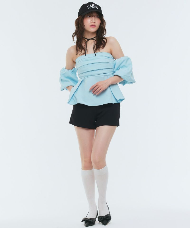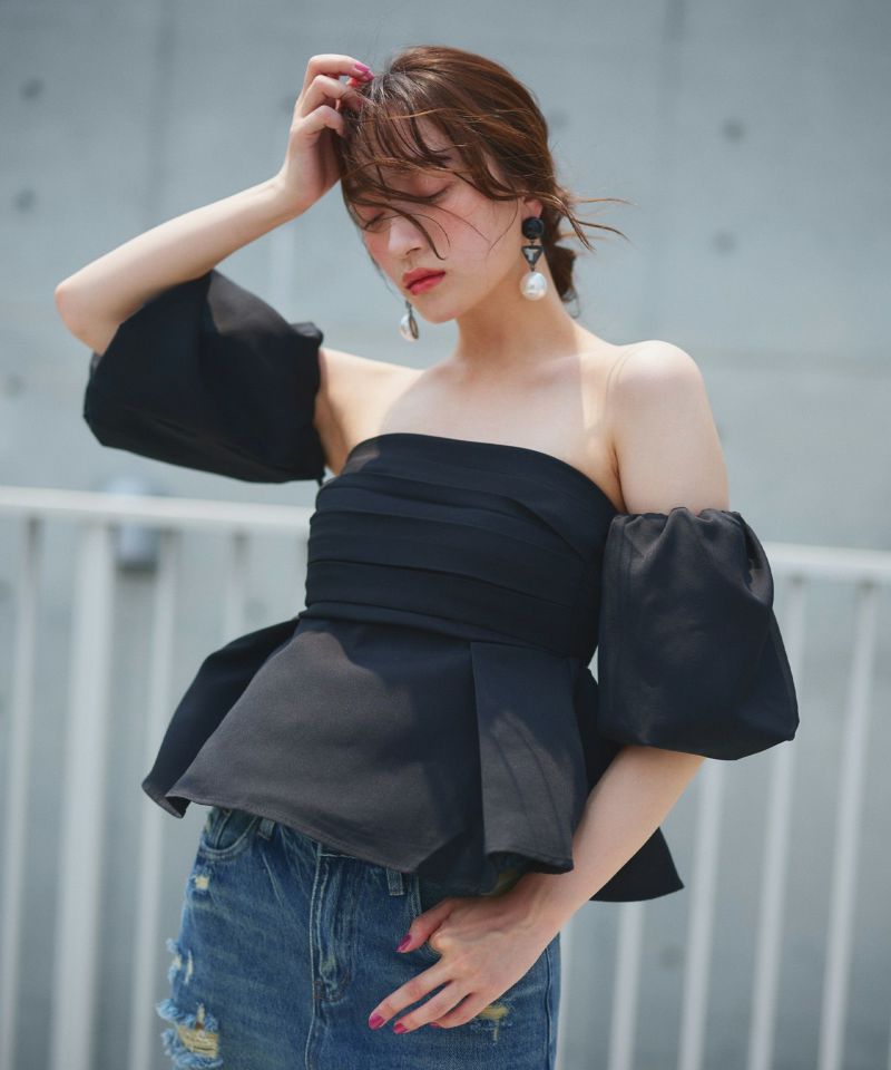 大人フェミニンに仕上げたオフショルトップス。オフショルデザインにパフとペプラムがプラスされ、ヘルシーでレディライクな印象に。オケージョンスタイル・ボトムでカジュアルダウンし普段使いするのも◎