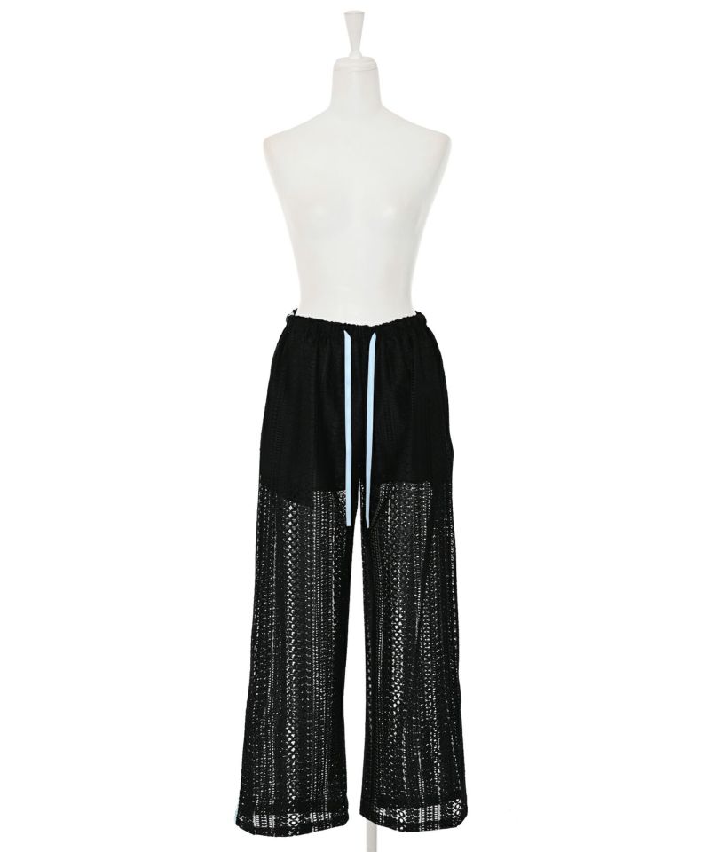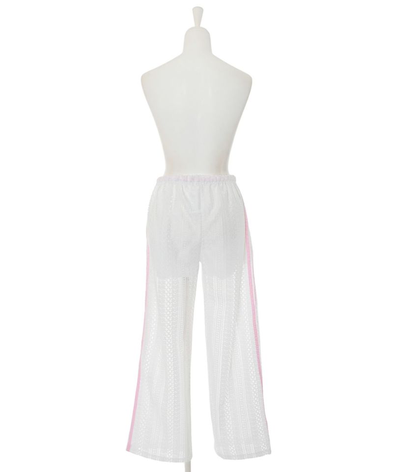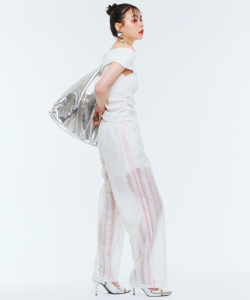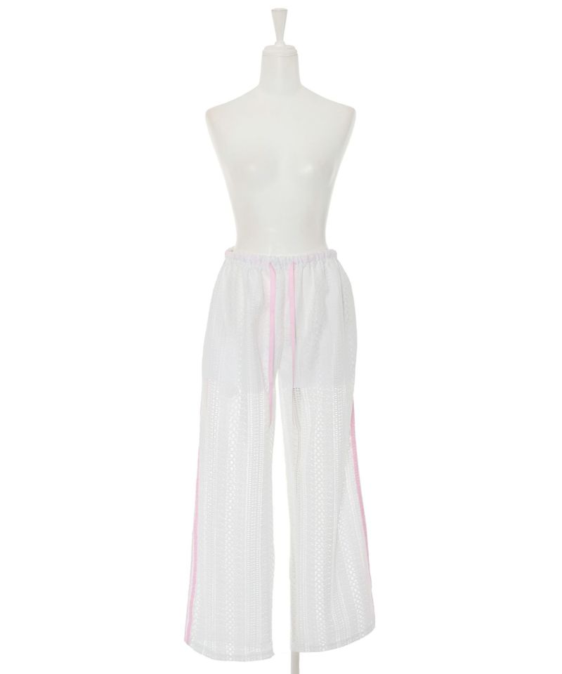 透け感のあるレース素材が女性らしさを引き立てる、ワイドパンツにラインデザインを落とし込んだアイテム。シーズンライクな可愛らしい配色もポイント。【model】H165 B78 H83 / H163 B78 H84