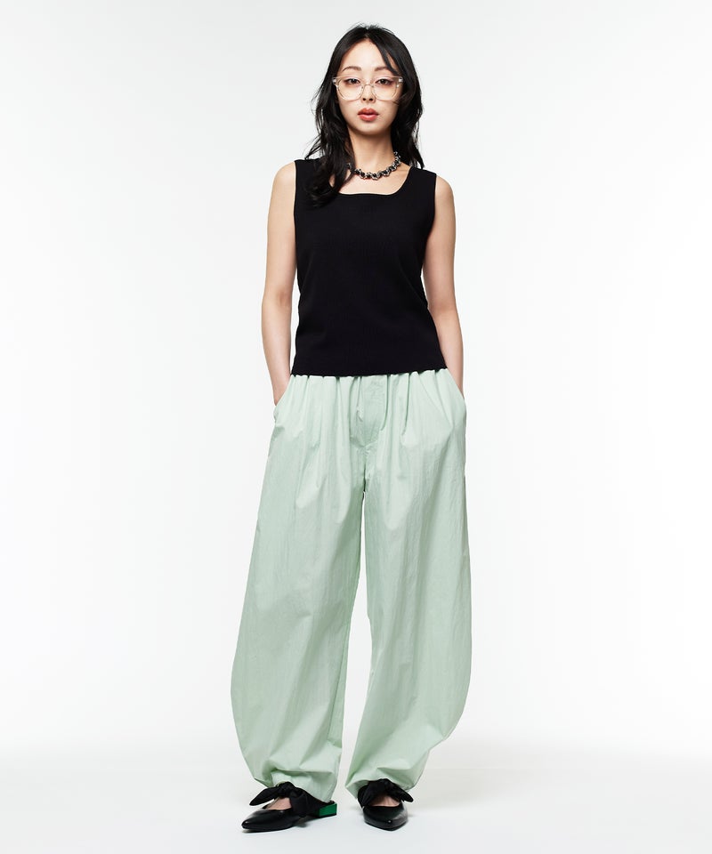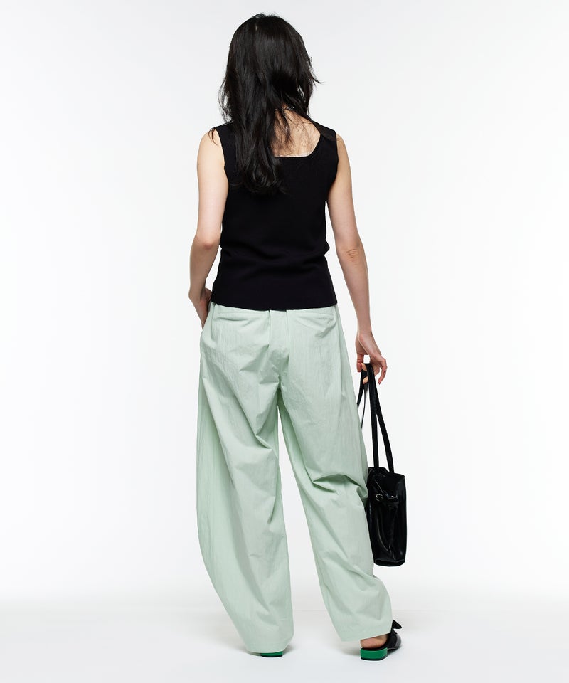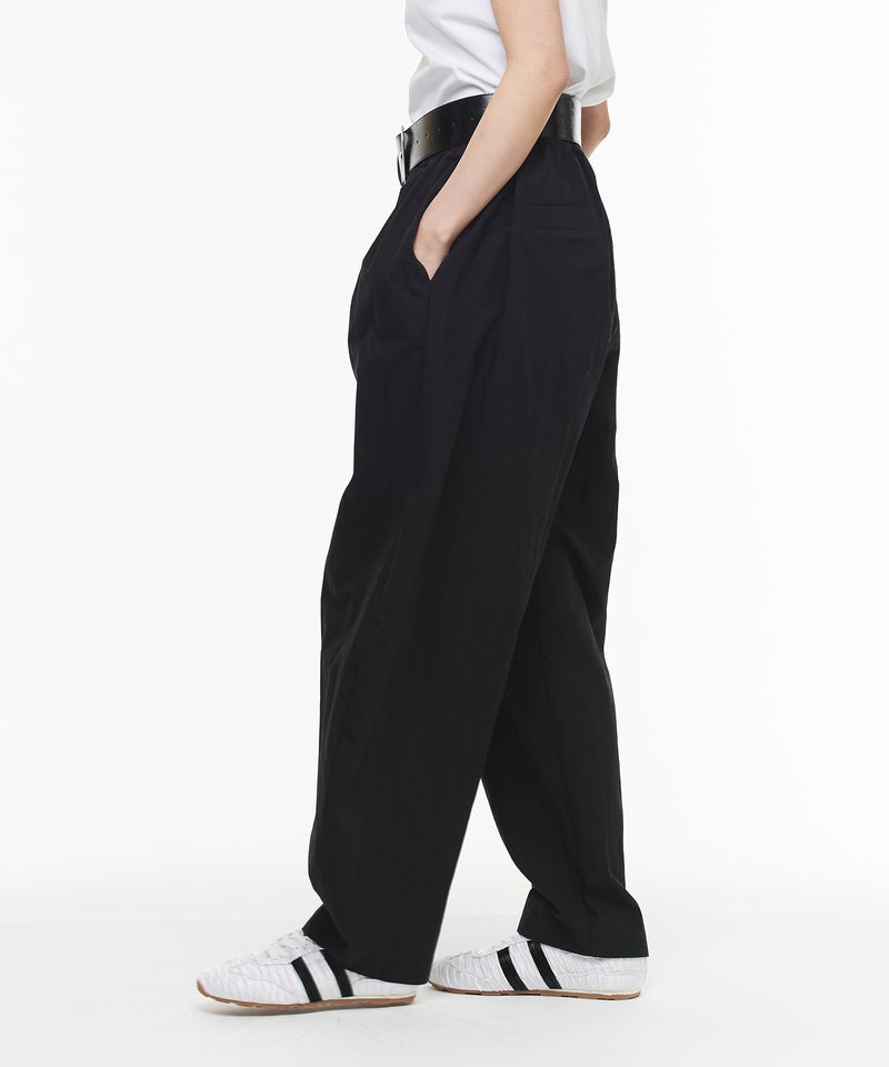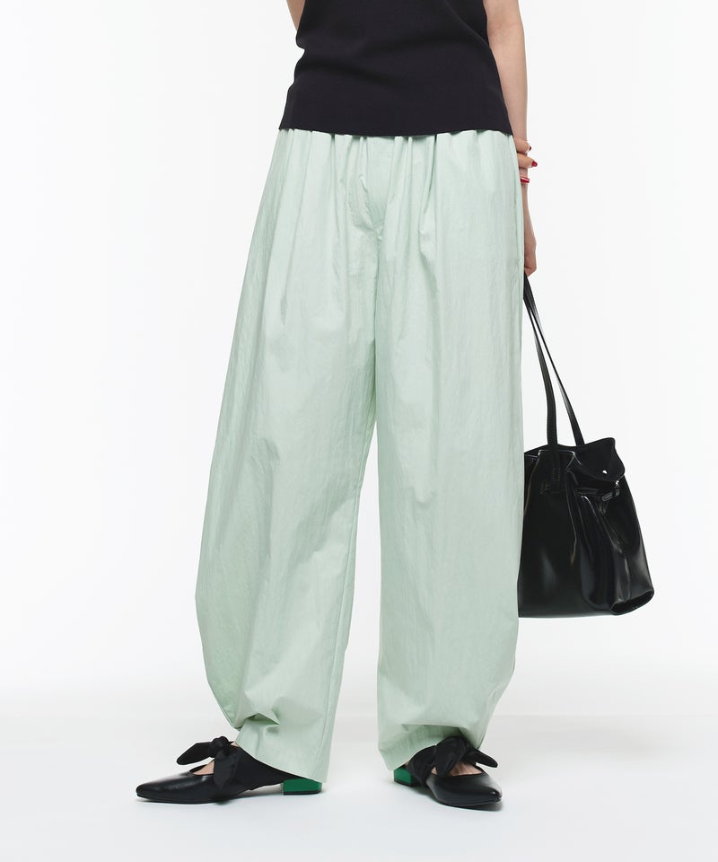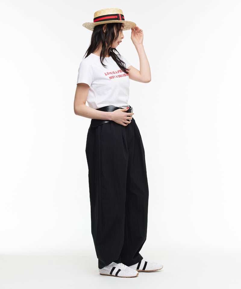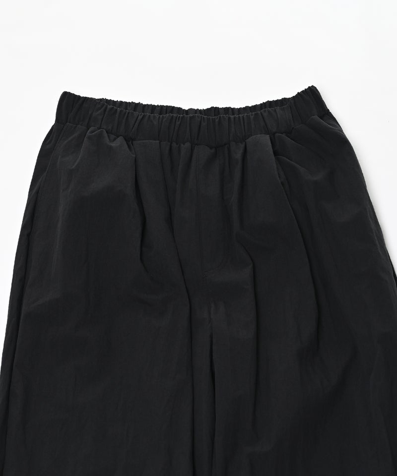 ゆったりとしたワイドシルエットに、丸みのあるフォルムが特徴的なデザイン。 裾にかけて自然にボリュームが出ることで、立体感のあるシルエットを演出します。 ウエストはすっきりとした仕様で、トップスインもバランスよく決まるのがポイント。 シンプルな中にさりげないデザイン性が光り、ラフすぎず洗練された印象に仕上がります。
