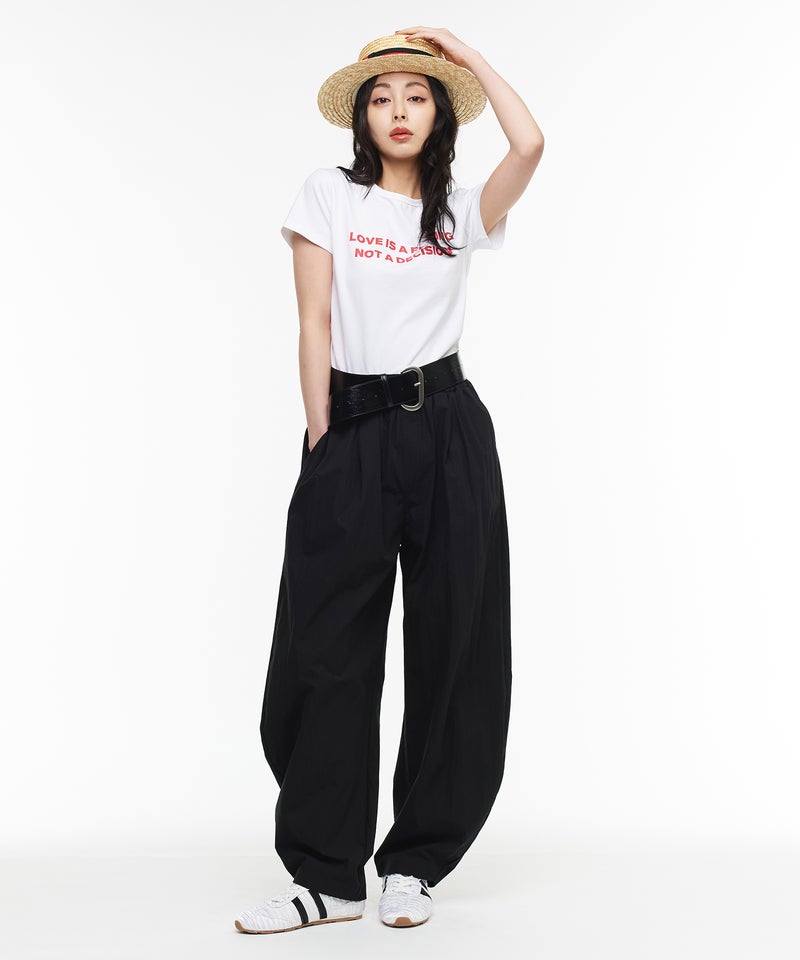 コンパクトなトップスやタンクトップを合わせて、メリハリのあるスタイリングに。 Tシャツやスニーカーを合わせたカジュアルスタイルはもちろん、シャツやヒールを合わせたミックススタイルもおすすめです。 太めのベルトをプラスしてウエストマークすることで、よりバランスの取れた着こなしに。
