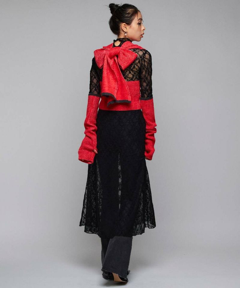 トレンドのアームカバーがセットになったニット。セットでも単品でも着回しできる万能アイテム。トップスも1枚着はもちろん、ビスチェのようにレイヤードしても◎バックオープン&リボンの抜け感とボリュームのバランスが、後ろ姿まで旬な着こなしに。【model】H165 B78 H83